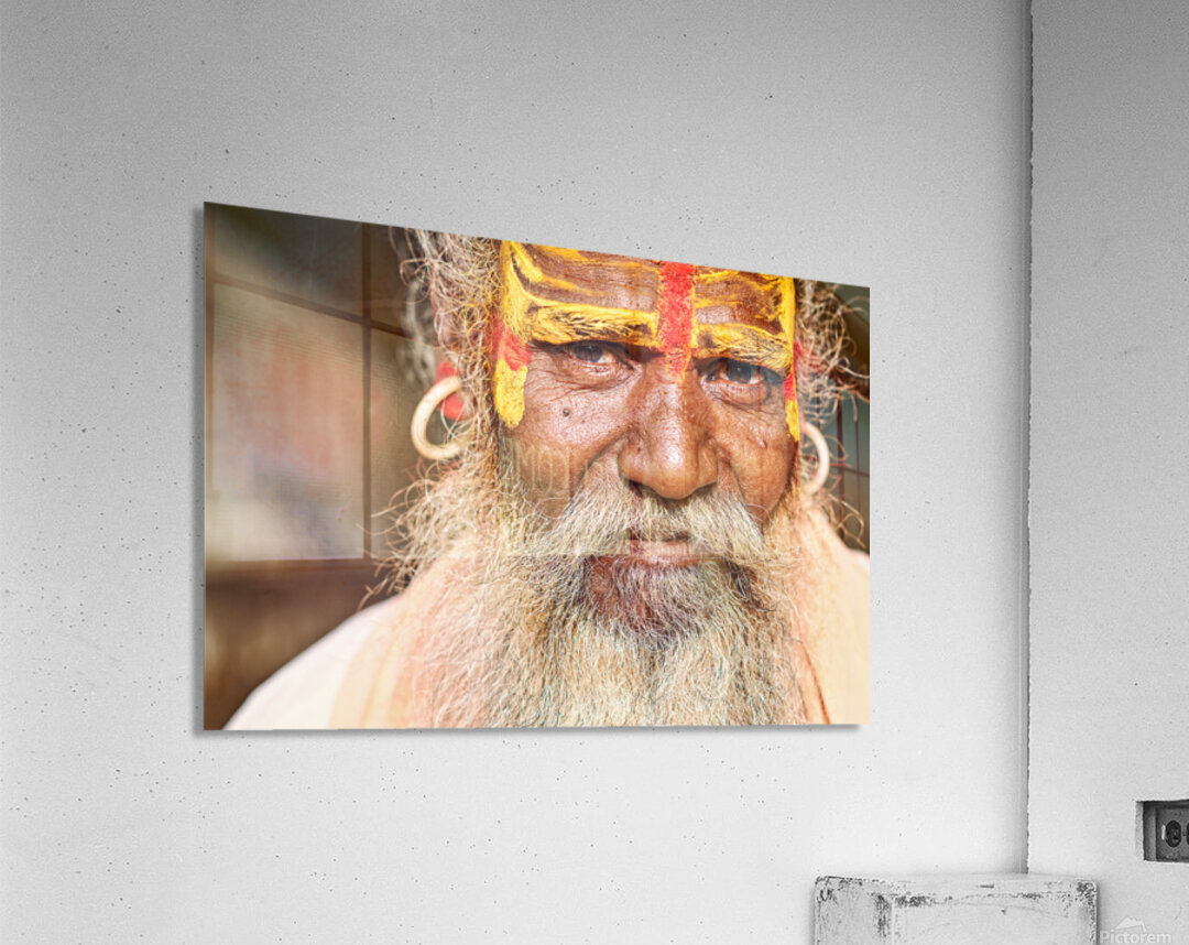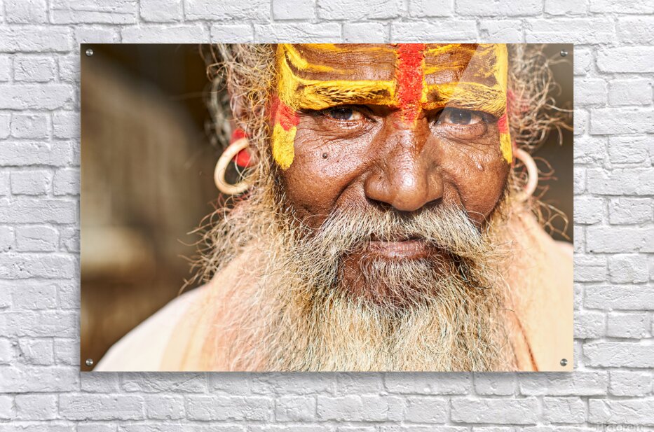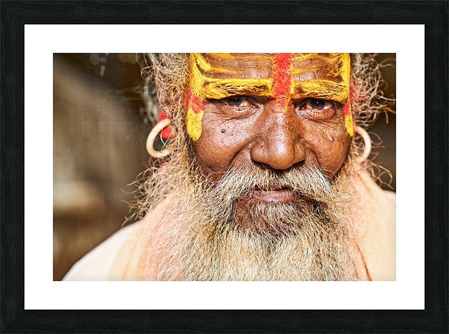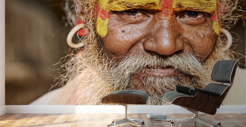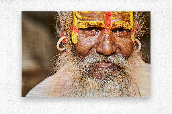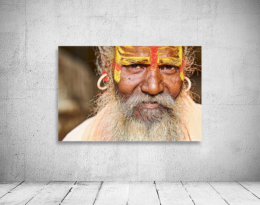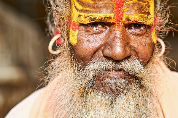 A sadhu sits in Jaisalmer Rajasthan. His face shows colorful markings and a long beard. He represents traditional Indian spirituality.