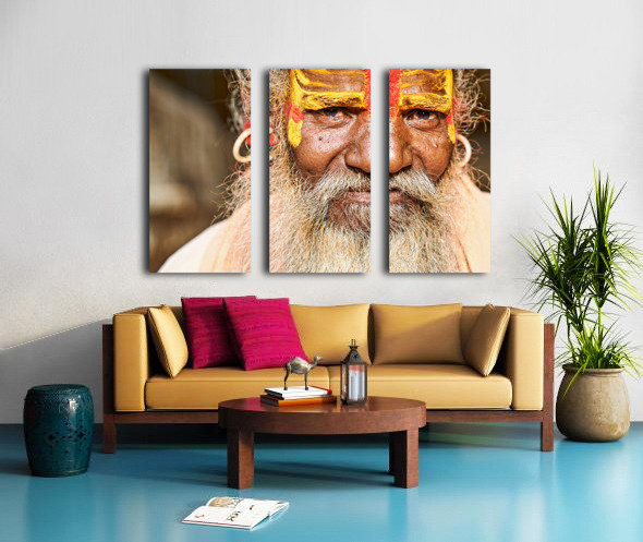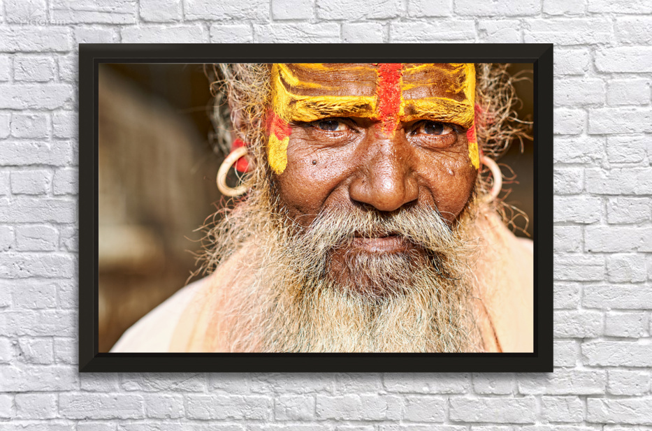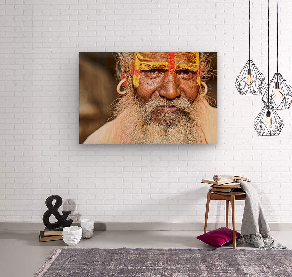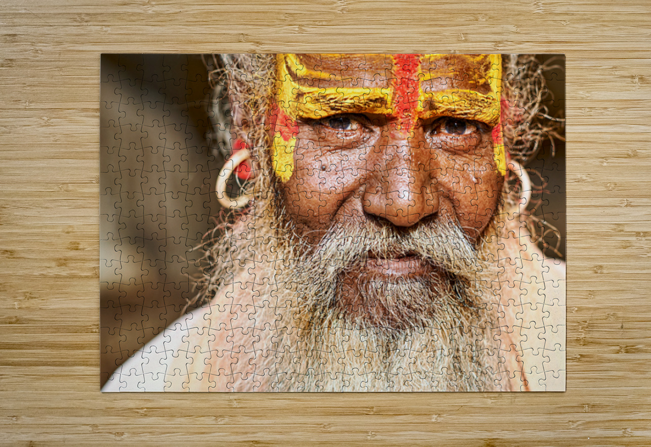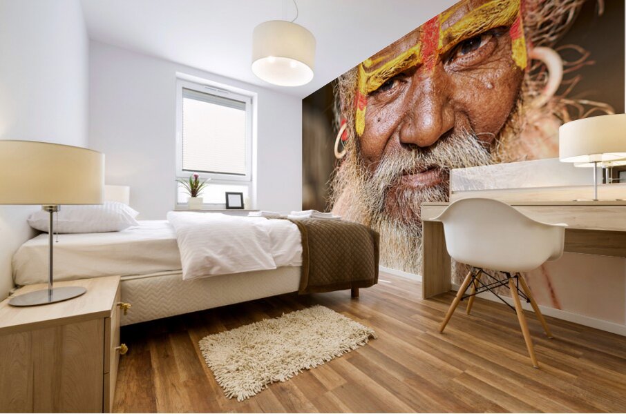 A sadhu sits in Jaisalmer Rajasthan. His face shows colorful markings and a long beard. He represents traditional Indian spirituality.