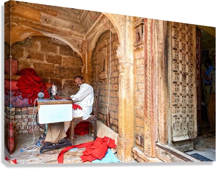 A tailor is sewing fabric inside a traditional haveli house in Jaisalmer Rajasthan. The house features intricate stone carvings.