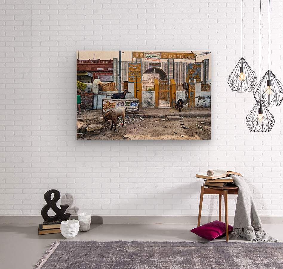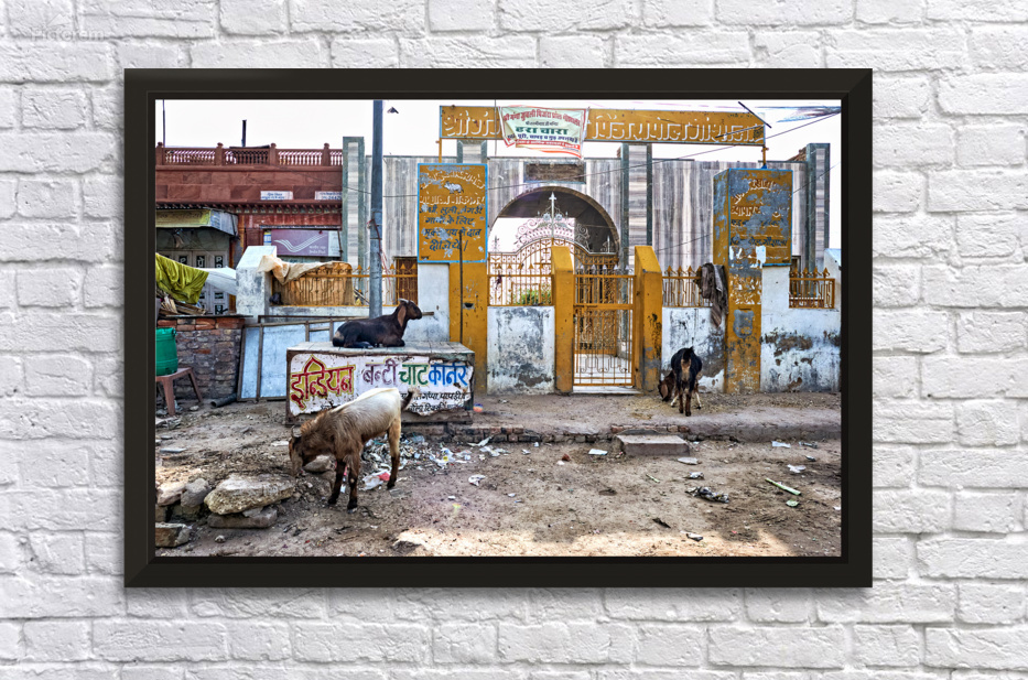 "Streets of Bikaner in Rajasthan show daily life and animals" in a framed print.