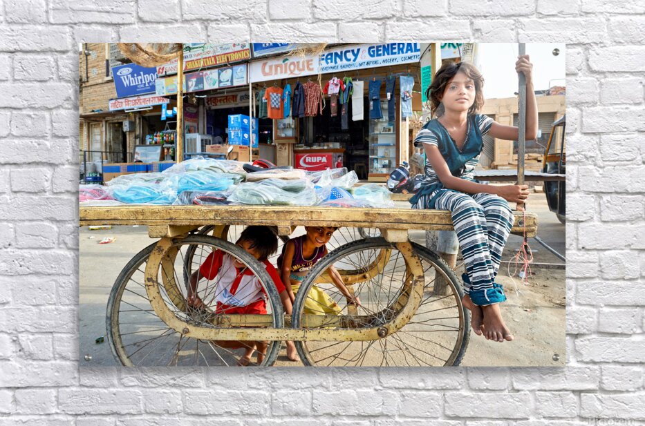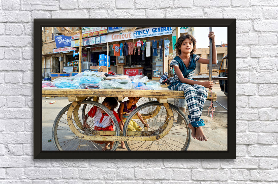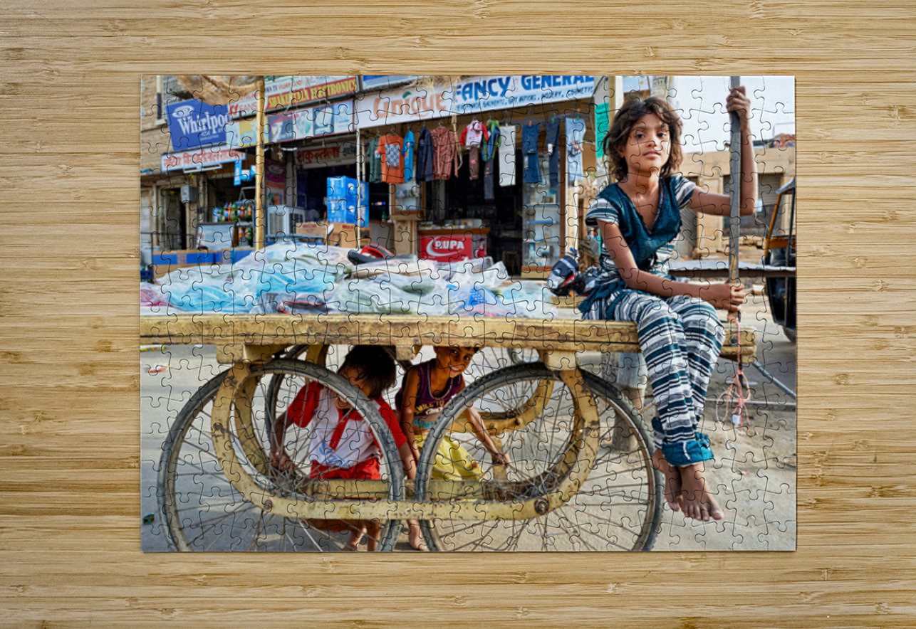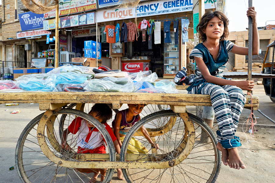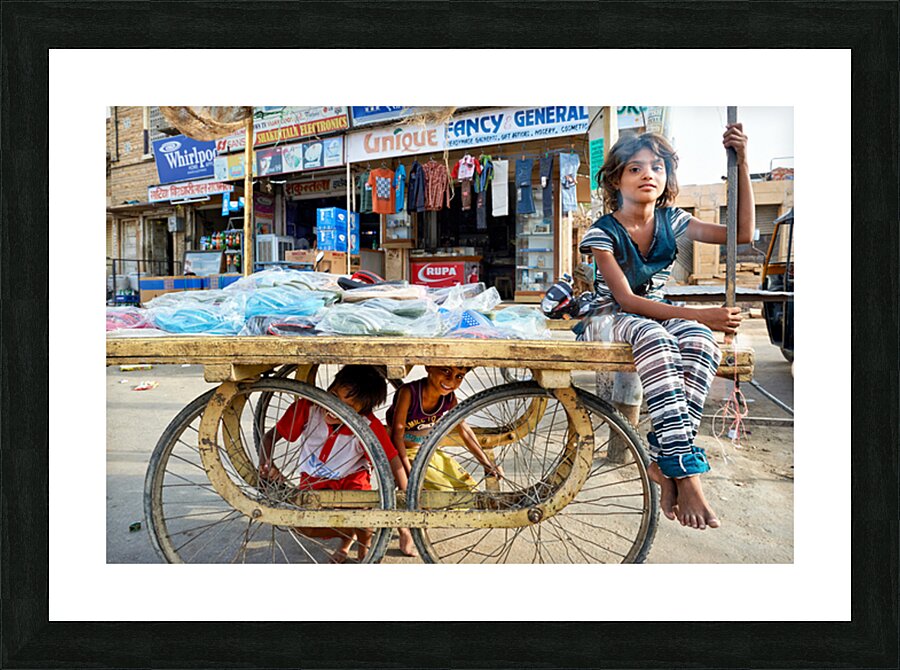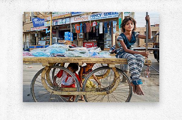 Children enjoy their time on a cart while a marketplace bustles in Jaisalmer Rajasthan during the day.