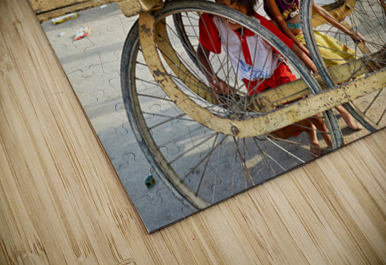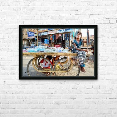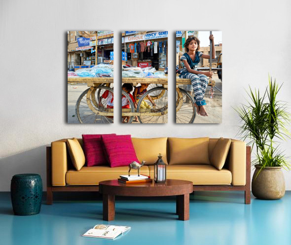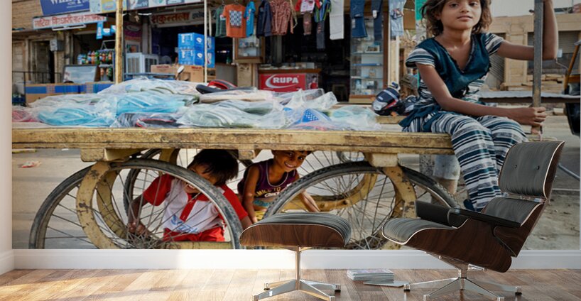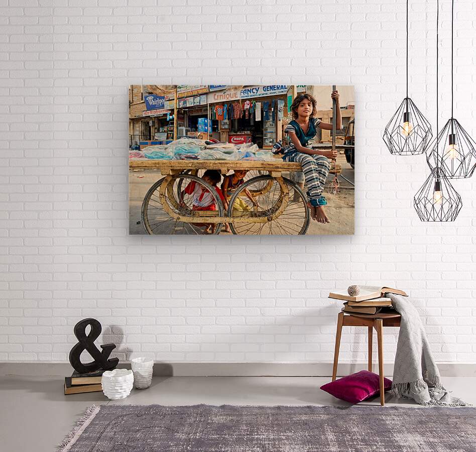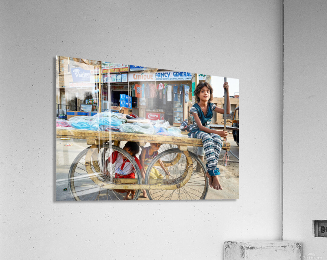 Children enjoy their time on a cart while a marketplace bustles in Jaisalmer Rajasthan during the day.