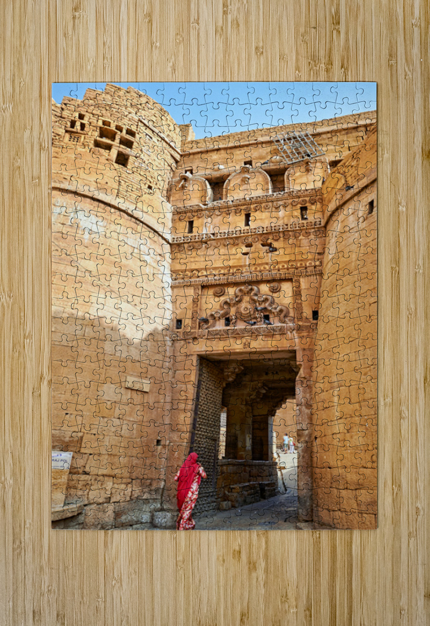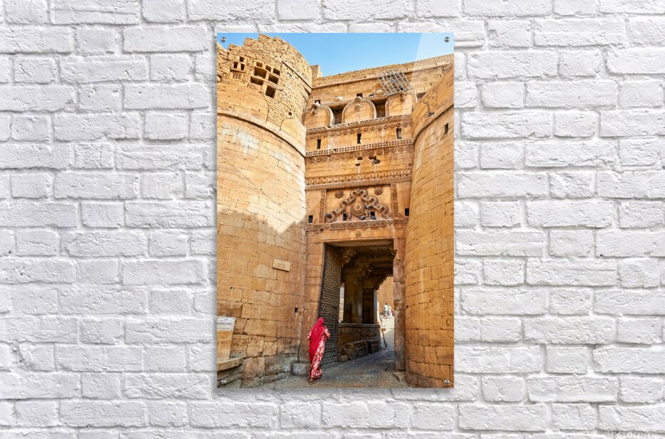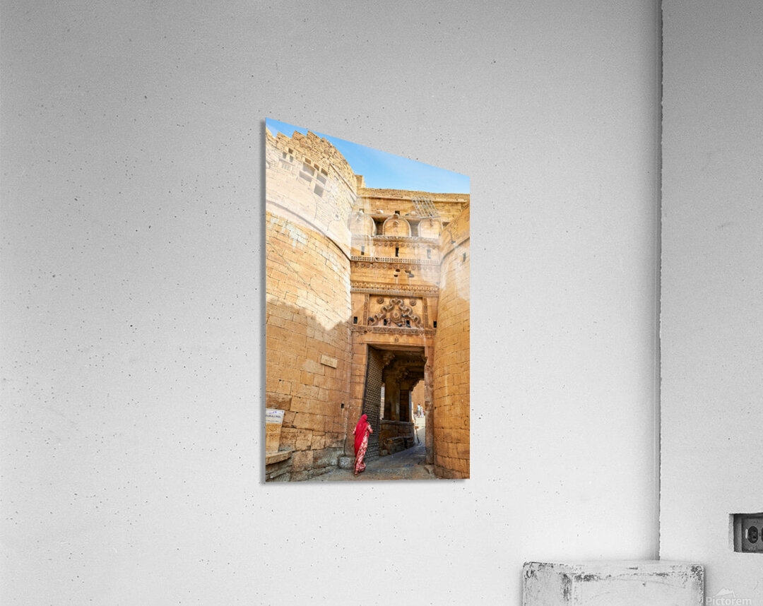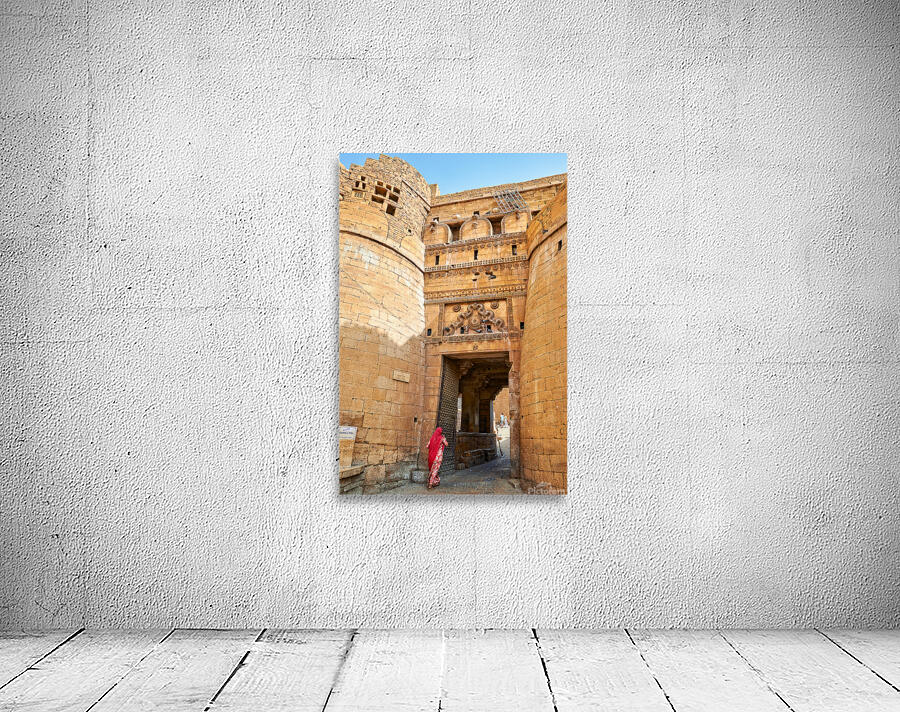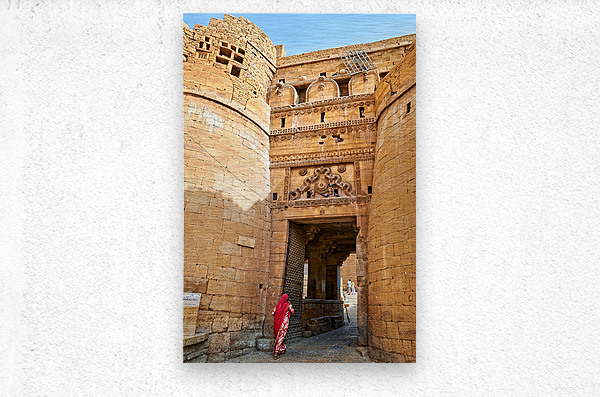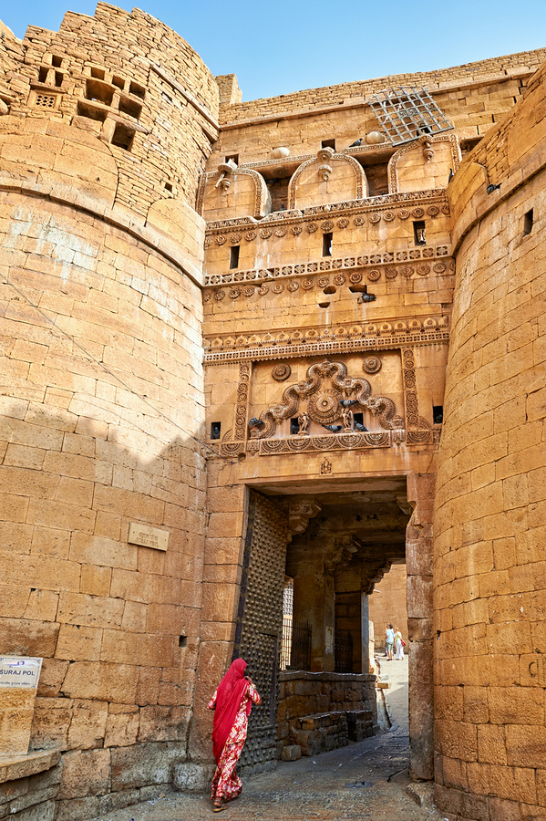 A woman walks through the entrance of Sri Baba Ramdevji Mandir in Jaisalmer. The architecture shows rich history and culture of the area.