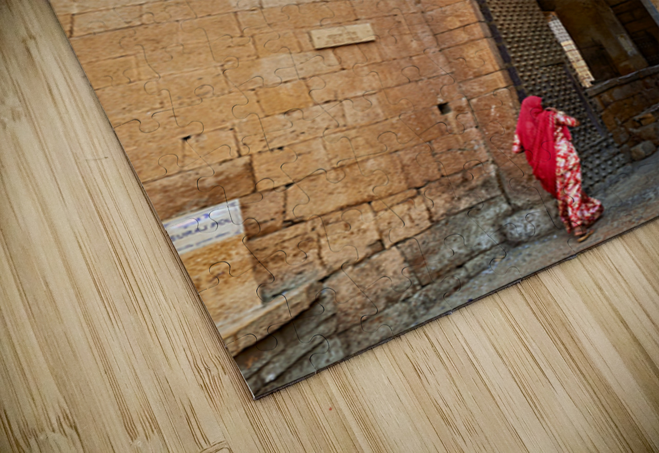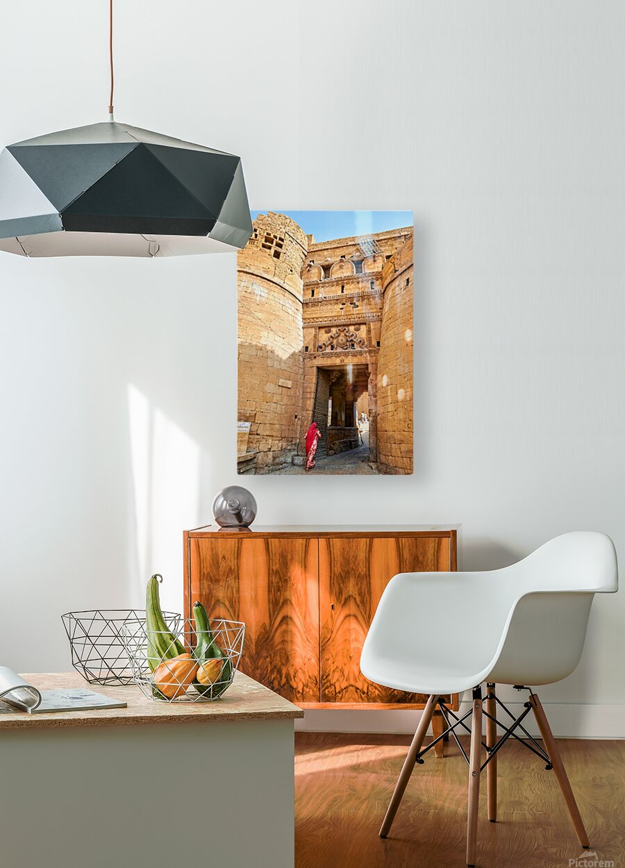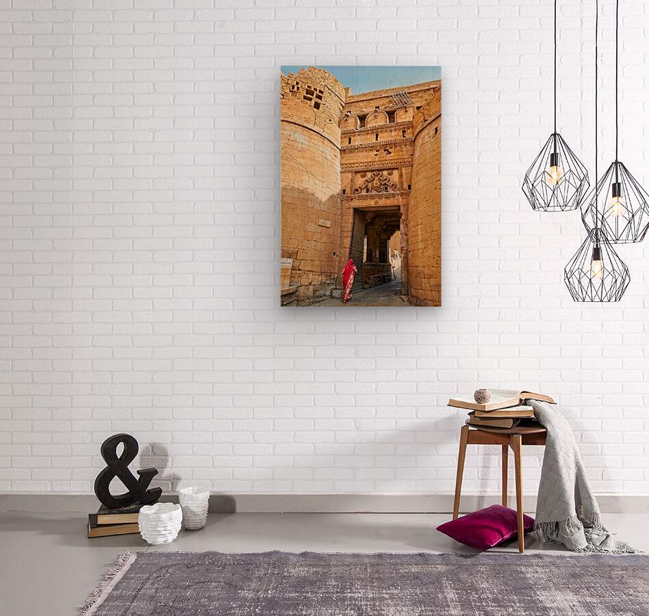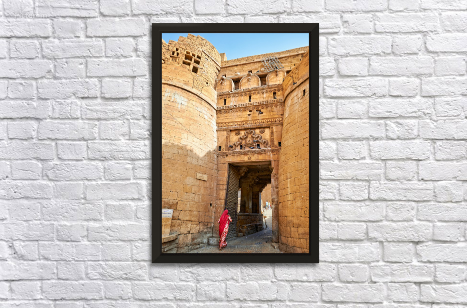 A woman walks through the entrance of Sri Baba Ramdevji Mandir in Jaisalmer. The architecture shows rich history and culture of the area.