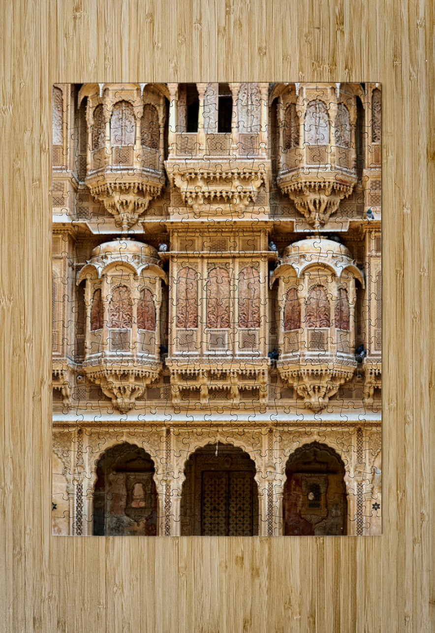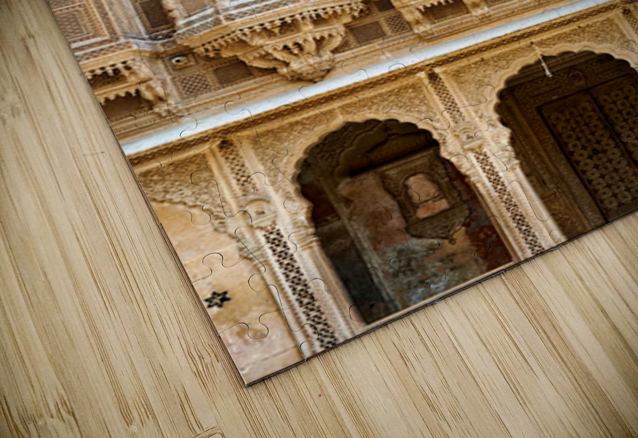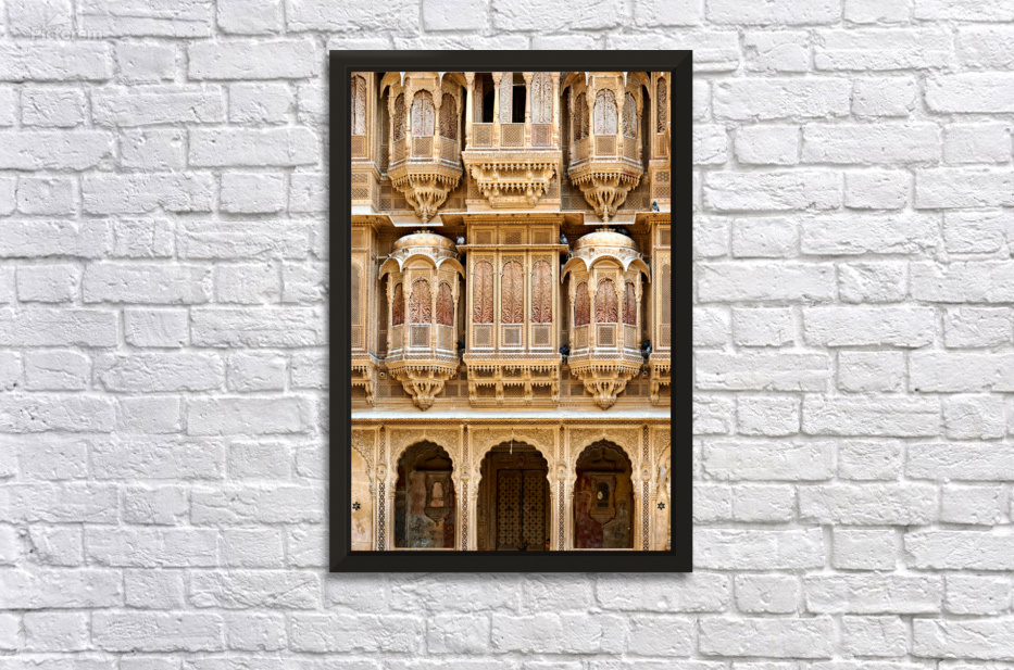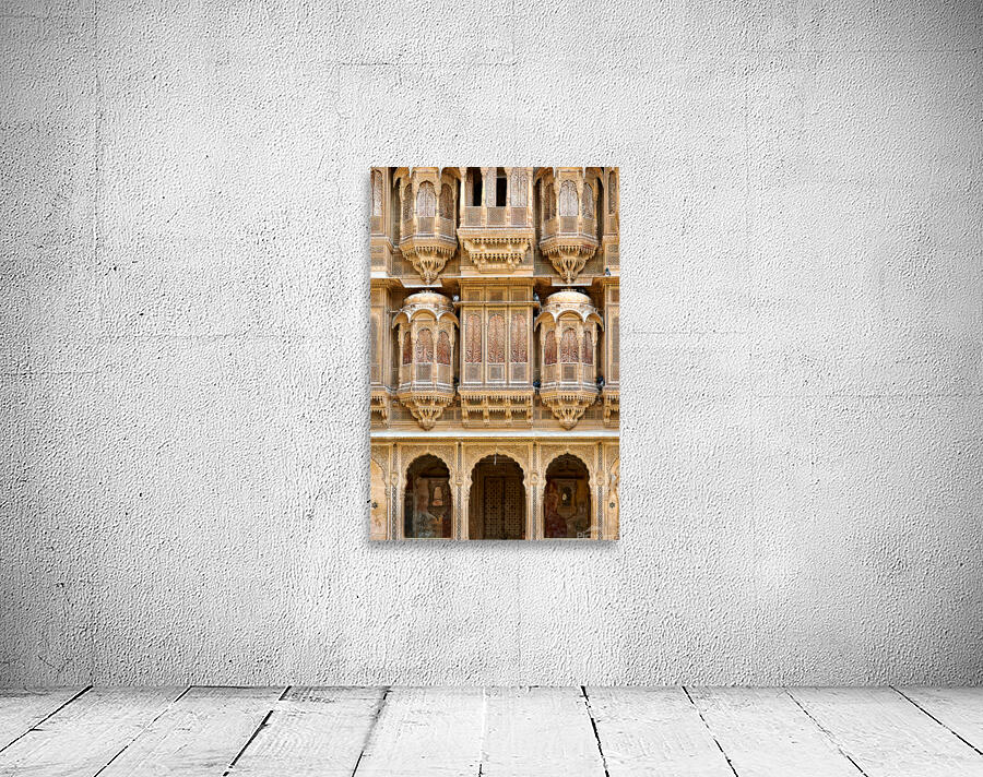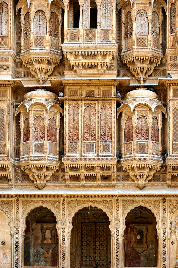 A haveli house stands in Jaisalmer Rajasthan. Intricate carvings fill the facade. The sunlight highlights the fine details of the architecture.