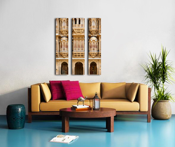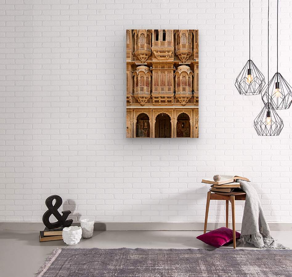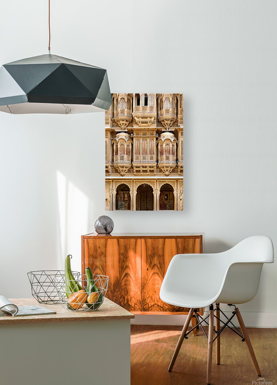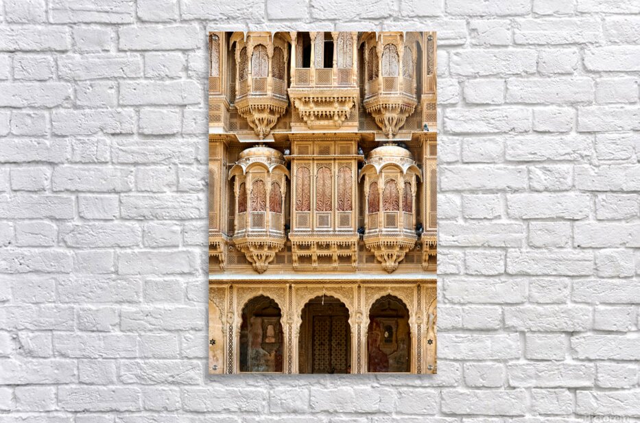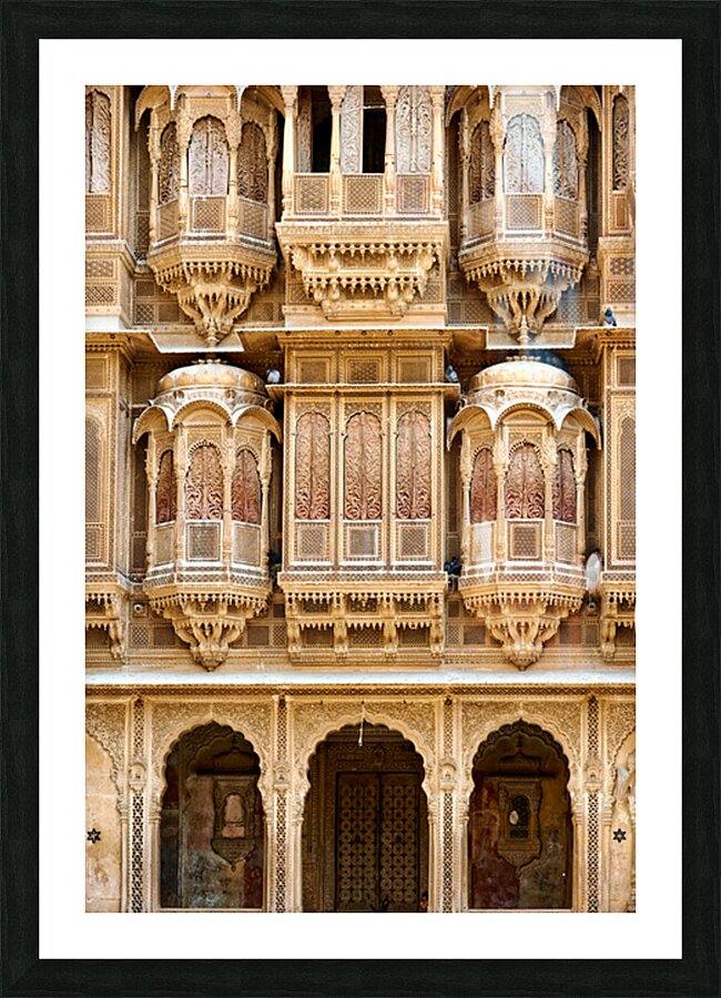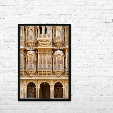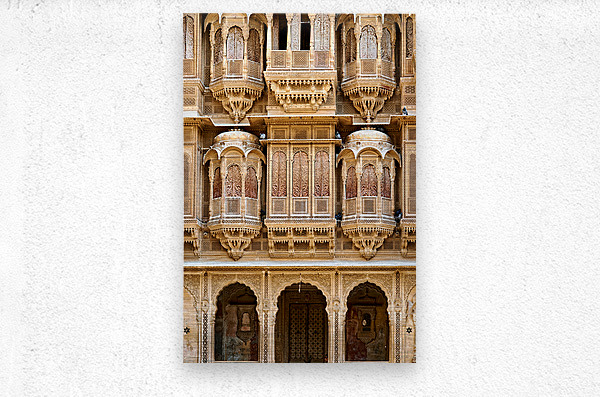 A haveli house stands in Jaisalmer Rajasthan. Intricate carvings fill the facade. The sunlight highlights the fine details of the architecture.