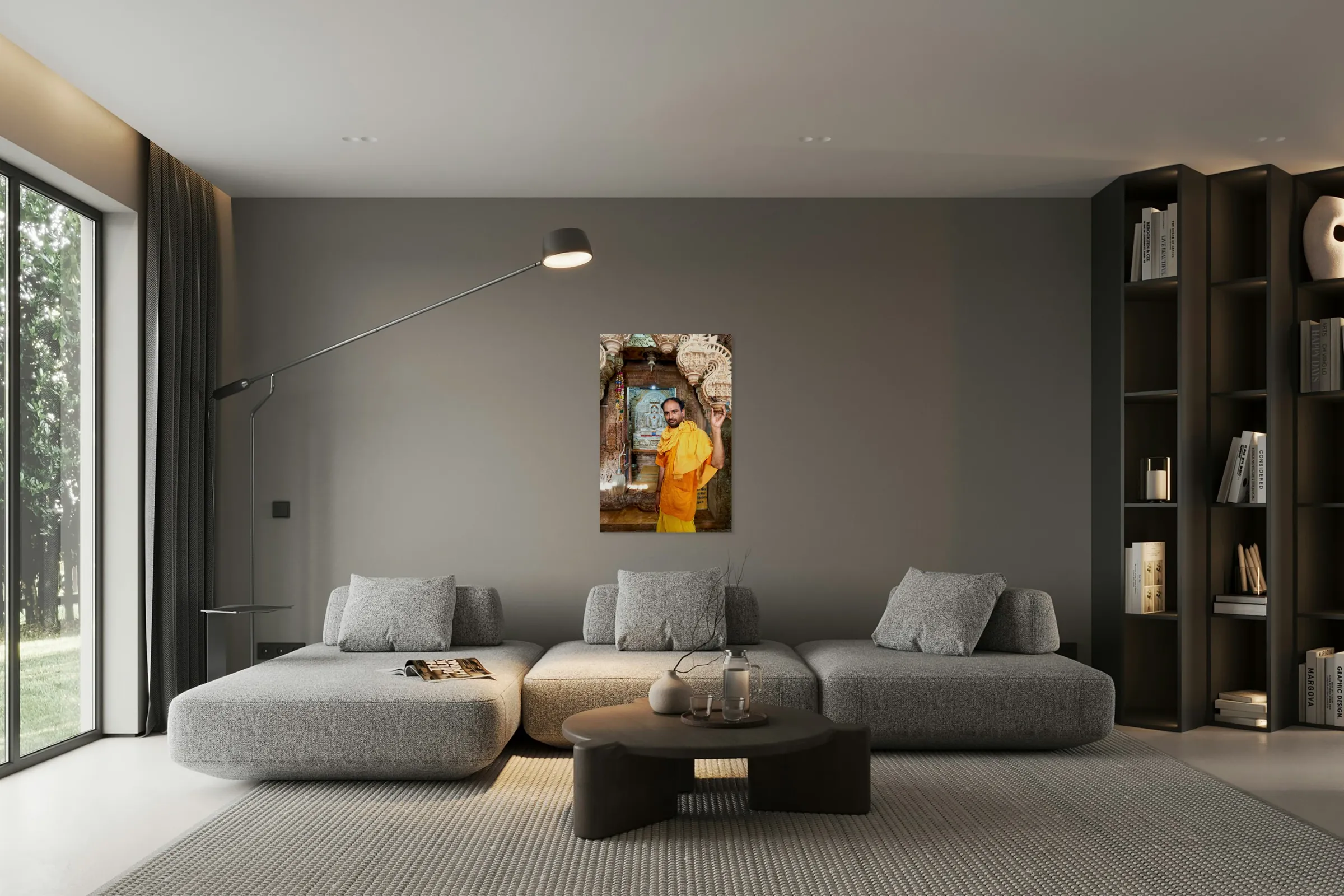 ABOUT THIS ARTWORK: HINDU MONK STANDS NEAR STATUE IN JAISALMER JAIN TEMPLE