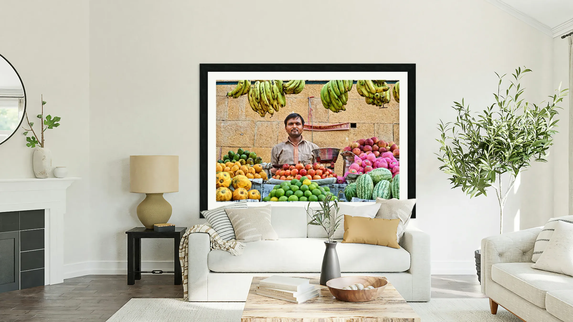 Fruits and vegetables stall in Jaisalmer with vendor at work Frame print