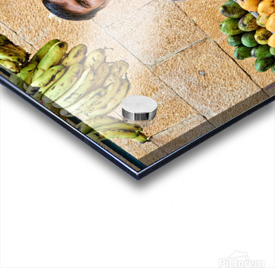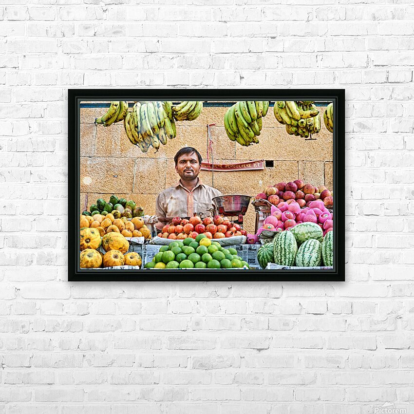 Fruits and vegetables stall in Jaisalmer with vendor at work Picture Frame Printing