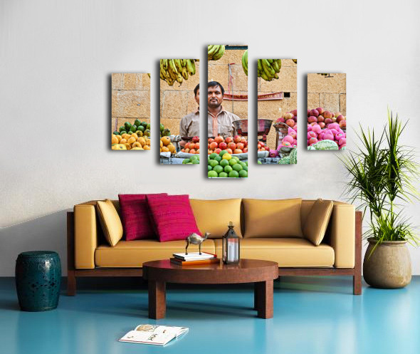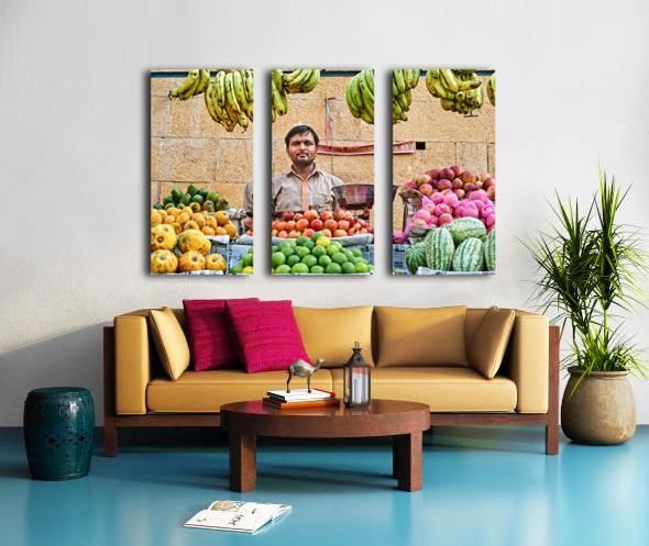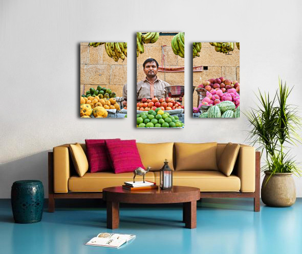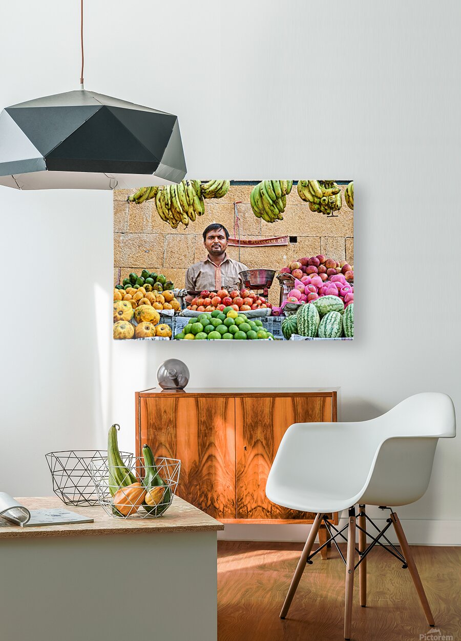 Get this artwork "Fruits and vegetables stall in Jaisalmer with vendor at work" in a framed print.