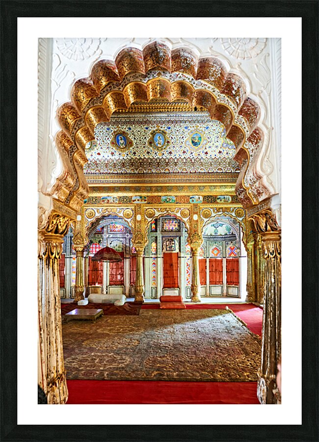 Visitors explore the interior of Mehrangarh Fort in Jodhpur. The fort shows intricate designs and rich colors from Rajasthans history.