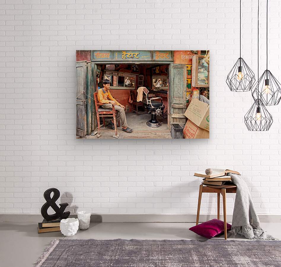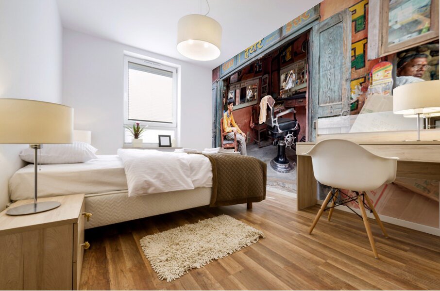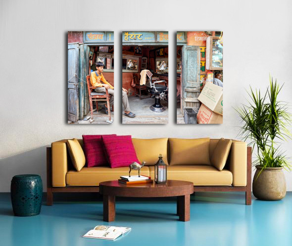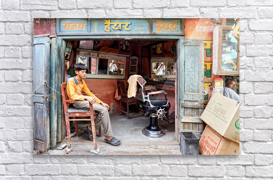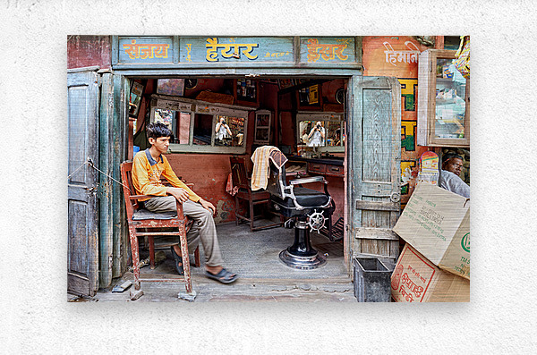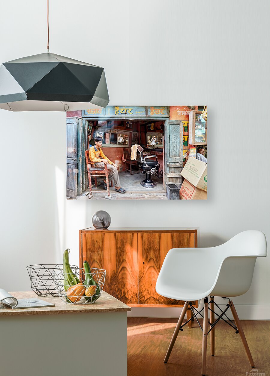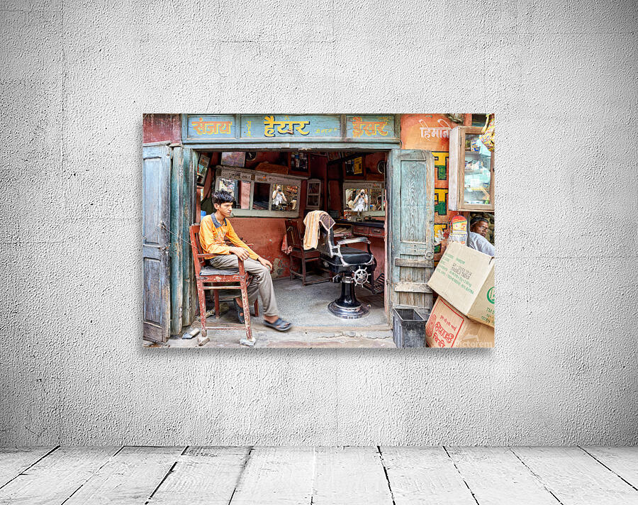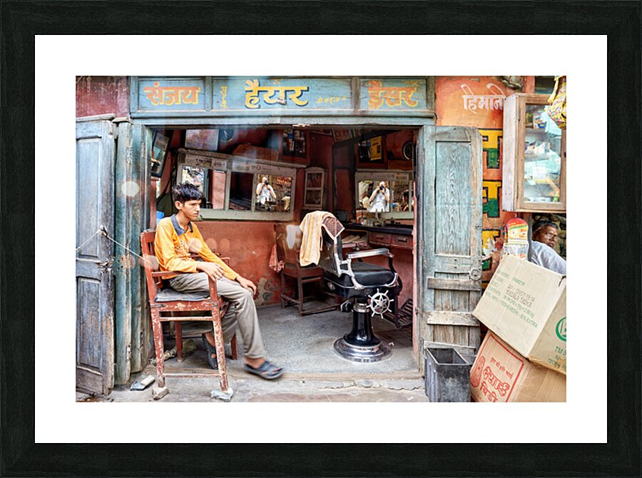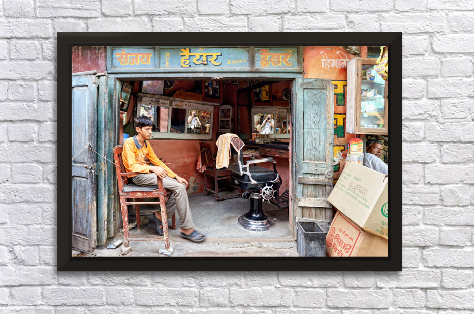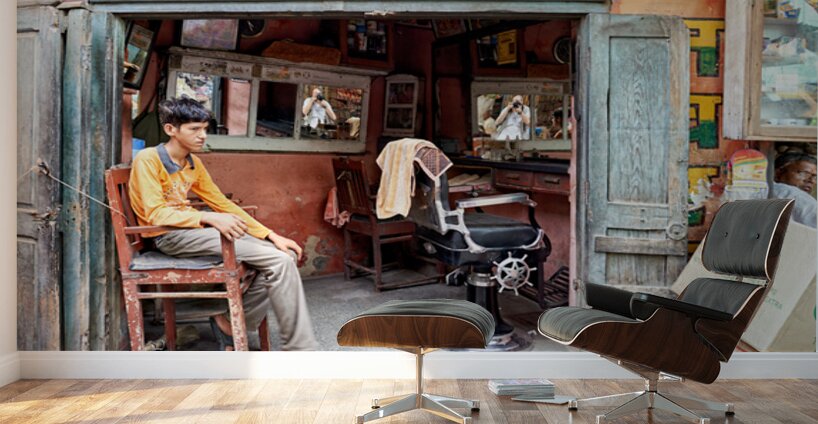 A young boy waits in a barber shop in Bikaner Rajasthan. The shop has mirrors and typical furniture for haircuts.