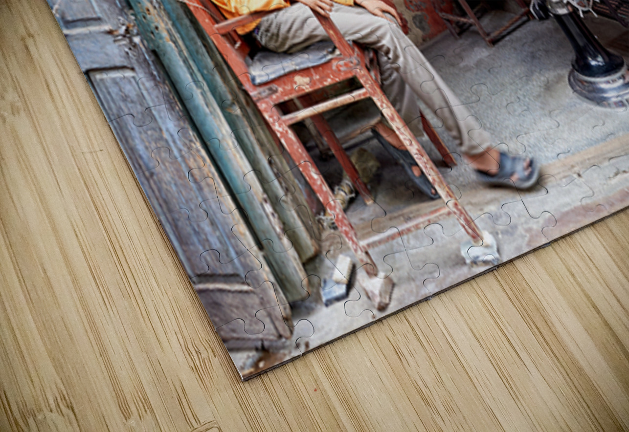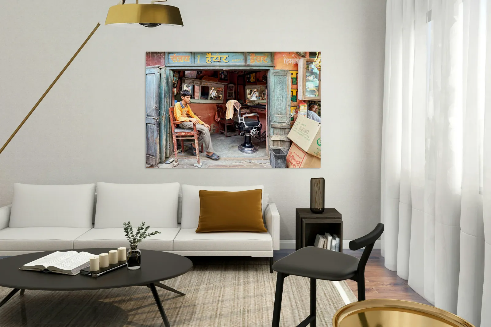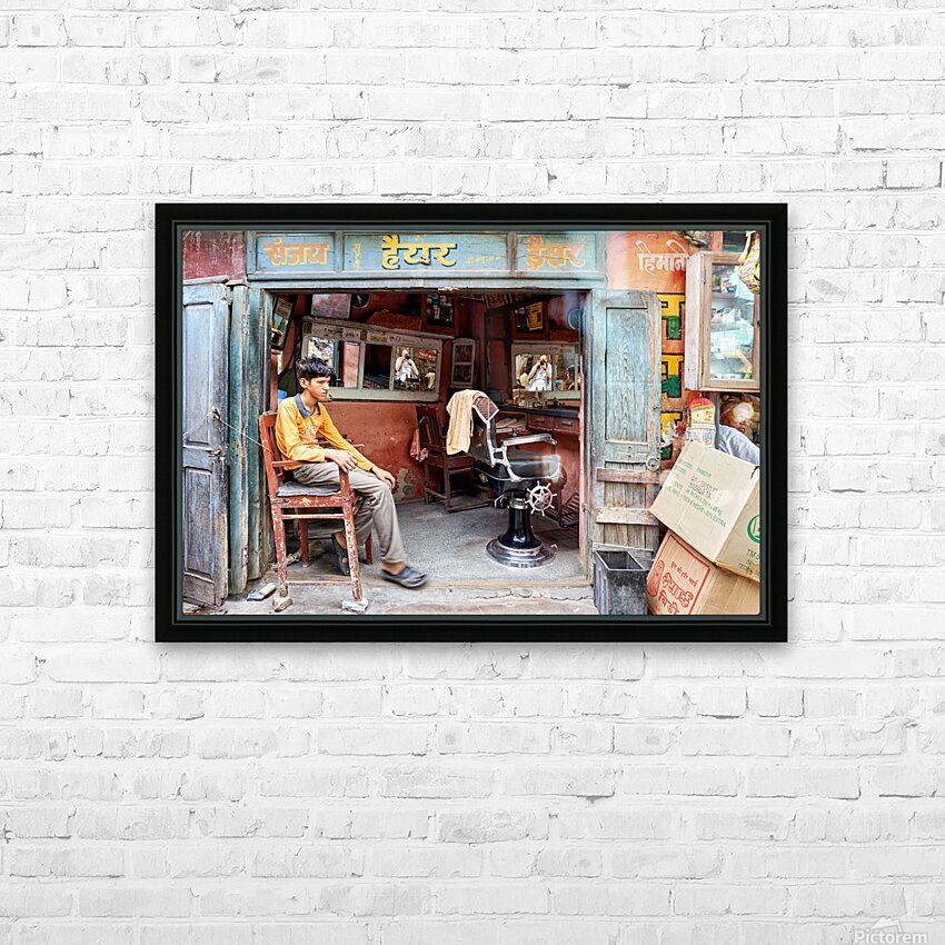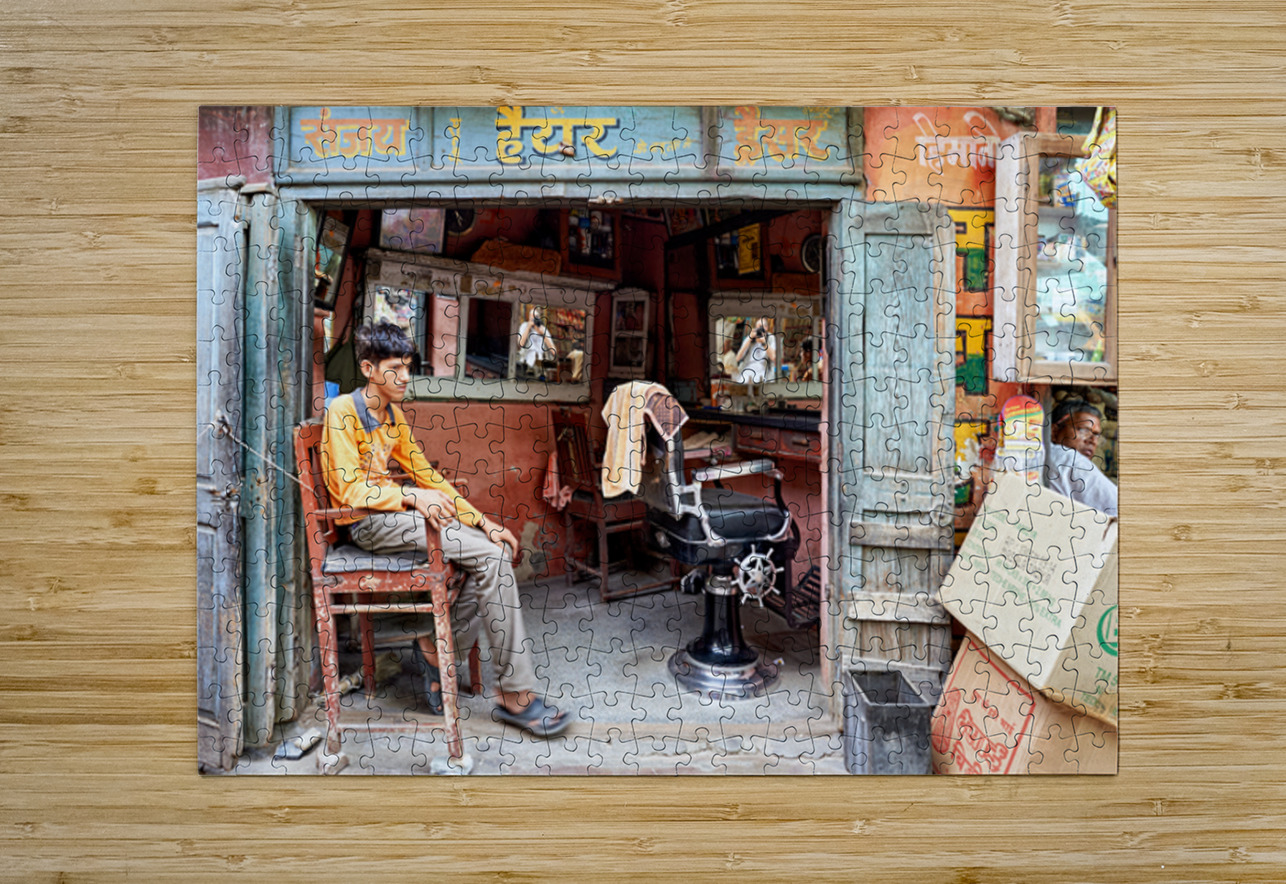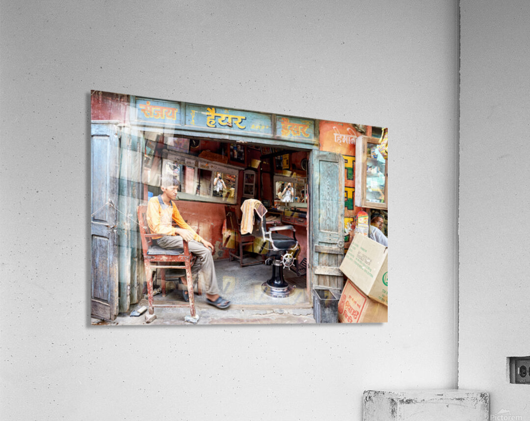 A young boy waits in a barber shop in Bikaner Rajasthan. The shop has mirrors and typical furniture for haircuts.