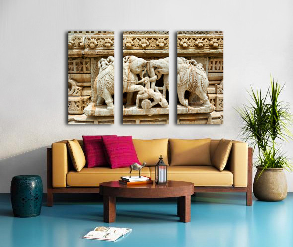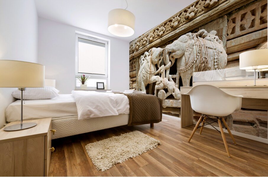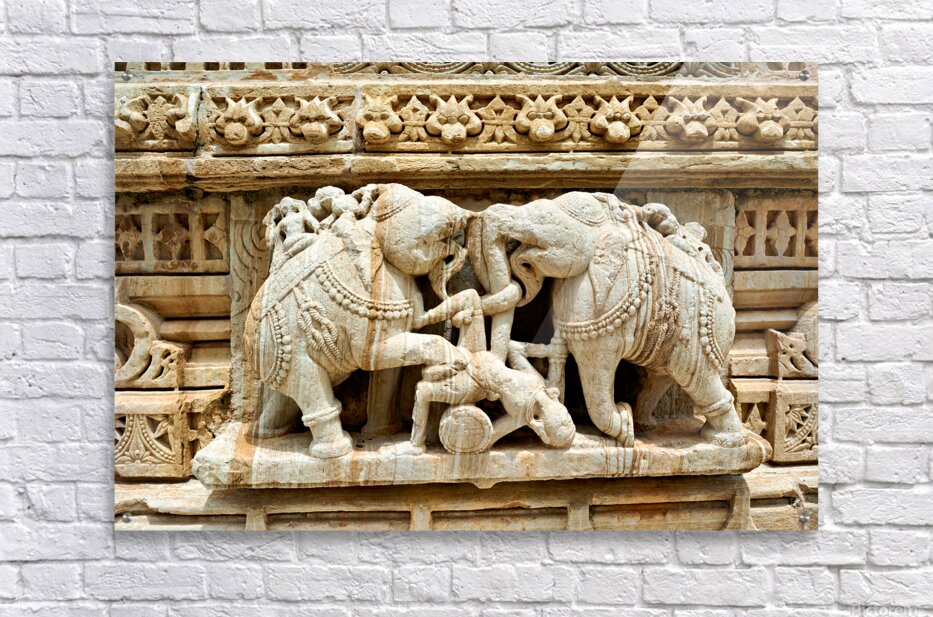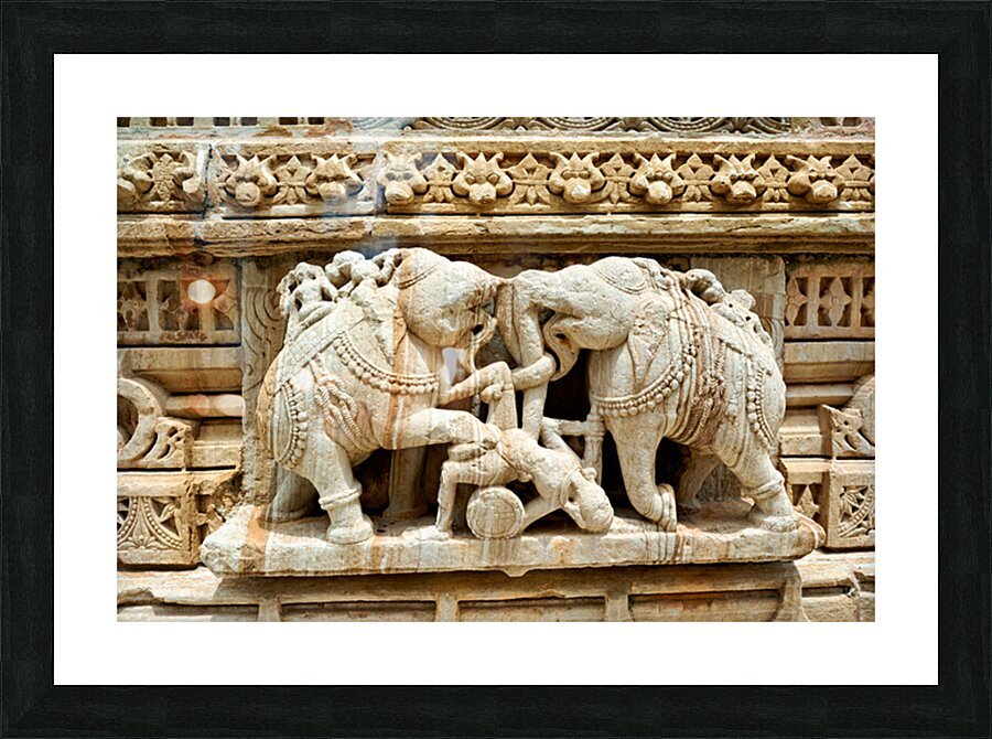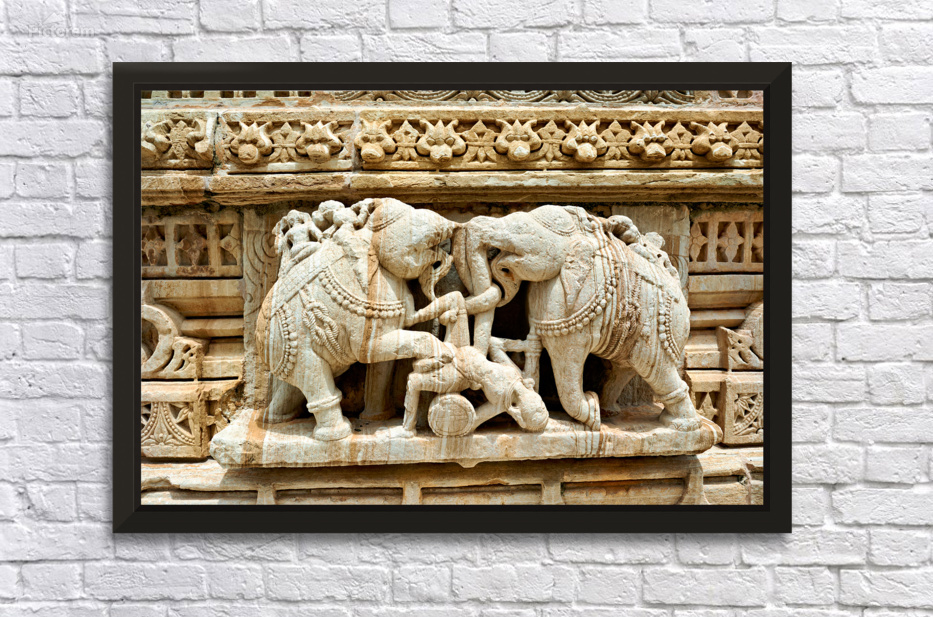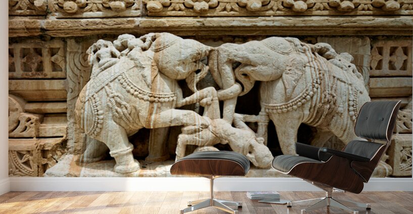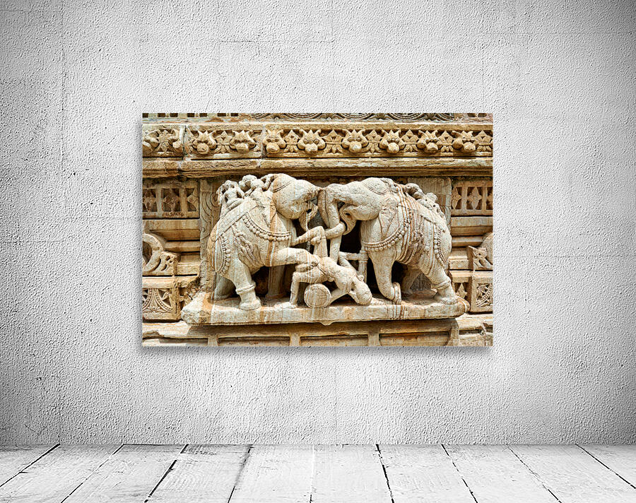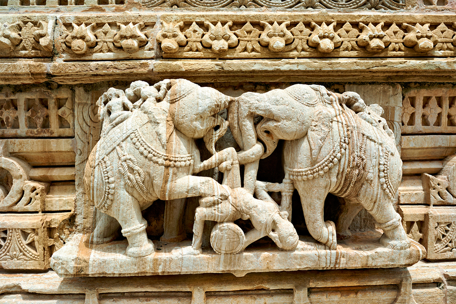 Stone carvings of elephants and warriors on the walls of Chittorgarh Fort in Rajasthan India. The details reflect old art and culture.