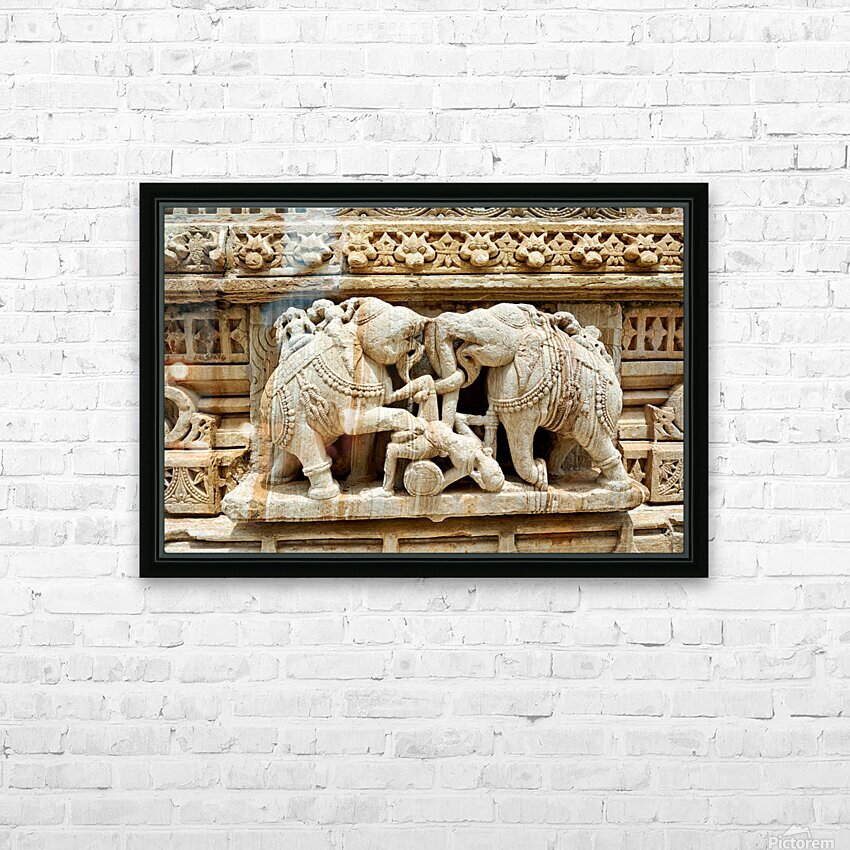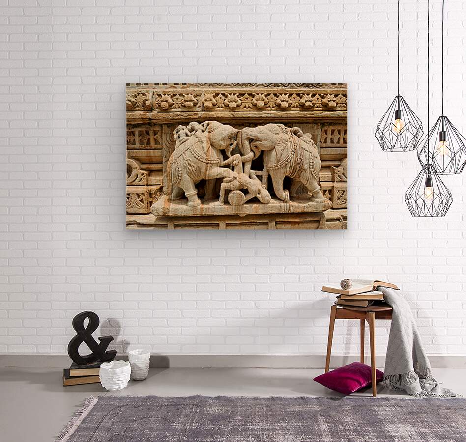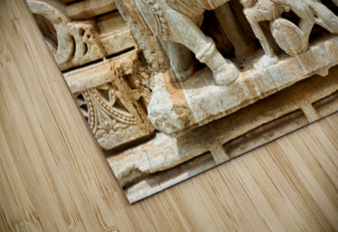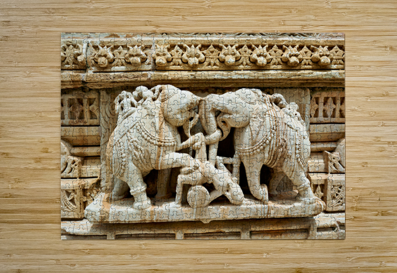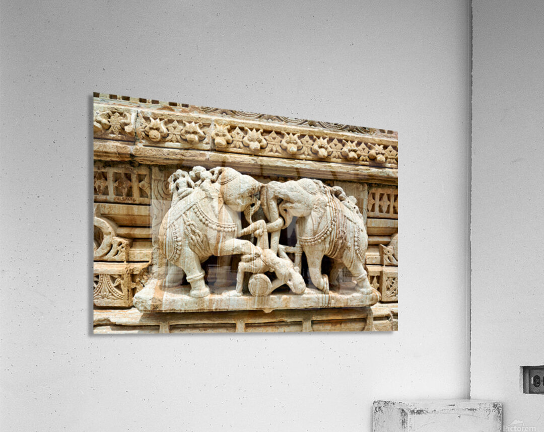 Stone carvings of elephants and warriors on the walls of Chittorgarh Fort in Rajasthan India. The details reflect old art and culture.