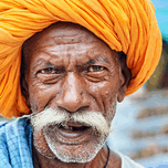 An old man stands in Bundi Rajasthan wearing a bright turban and looks directly at the camera. His expression shows wisdom and experience.