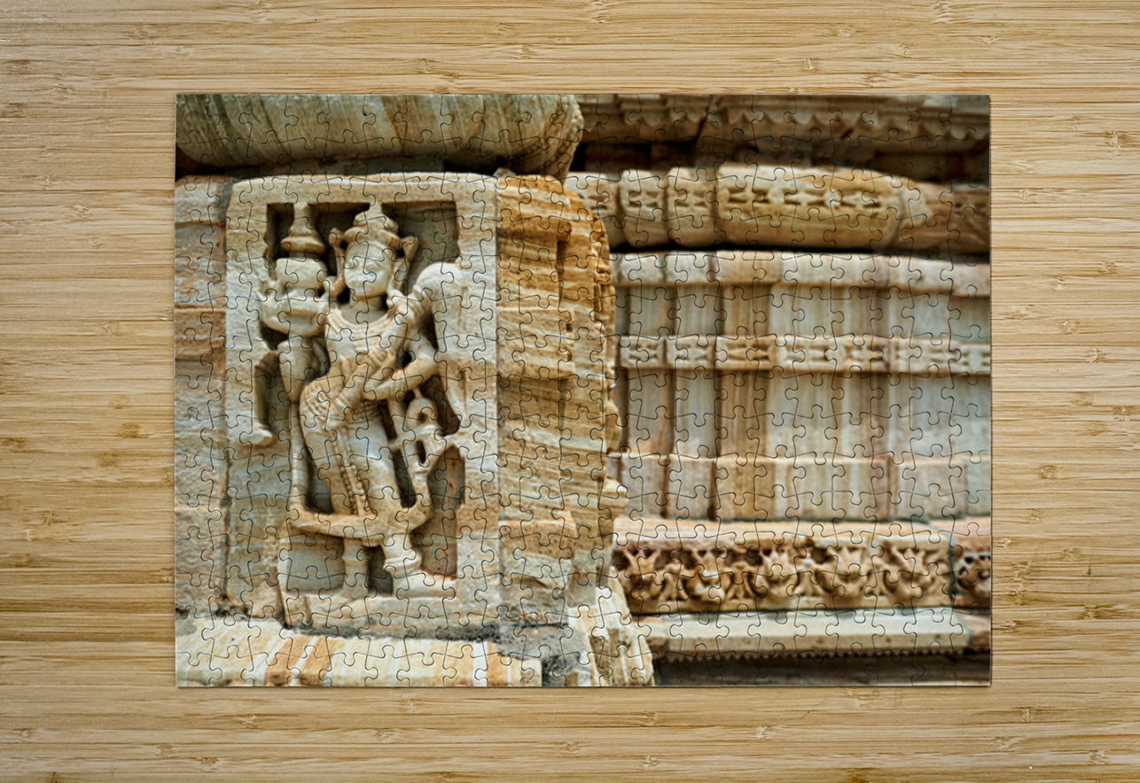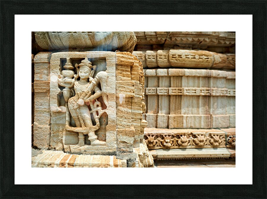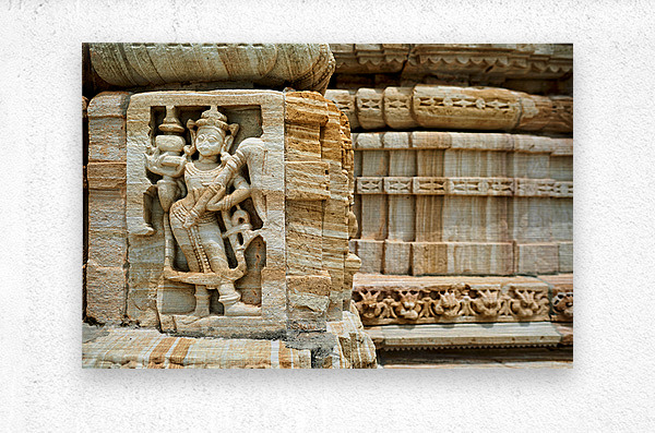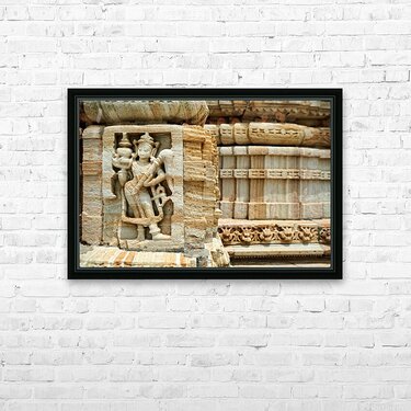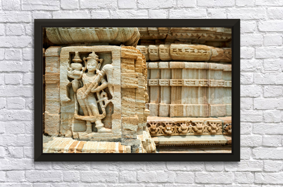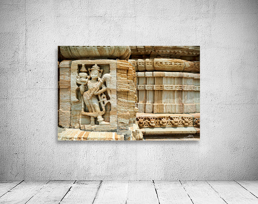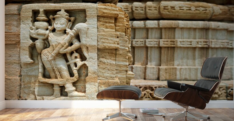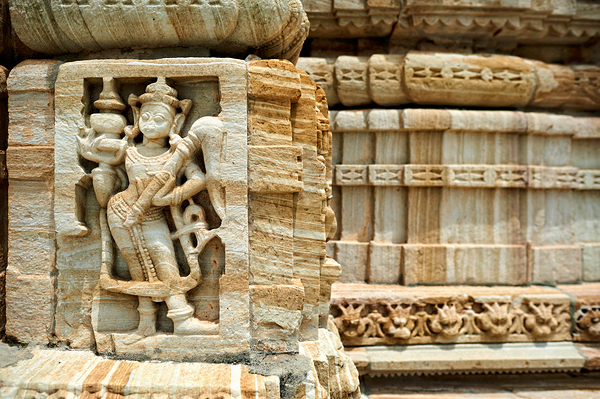 An ancient carving of a deity is seen on a stone wall at Chittorgarh Fort. The details show artistic skill and cultural history.