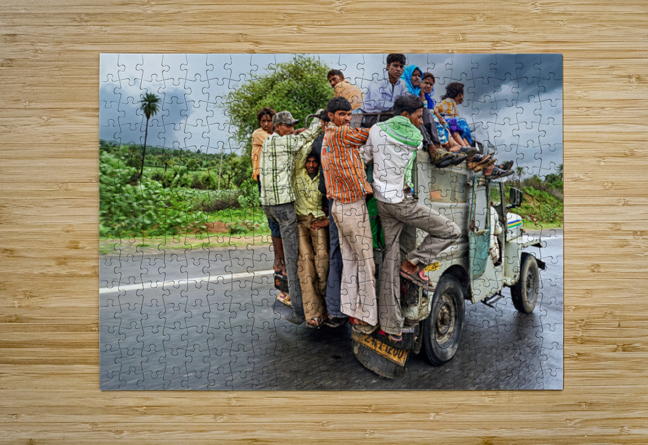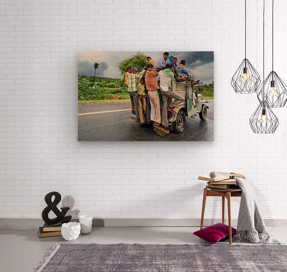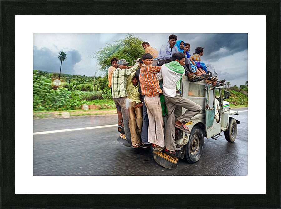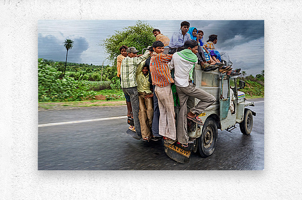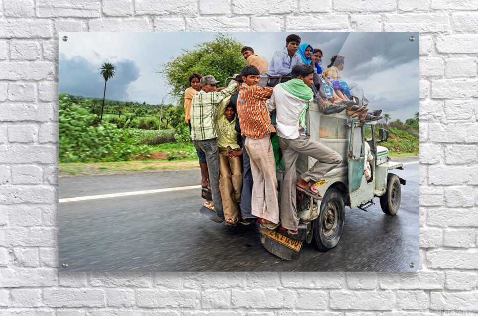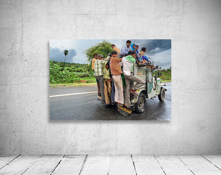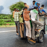 Many people are seen riding on top of a vehicle in Rajasthan. They travel on a road during cloudy weather with greenery around.