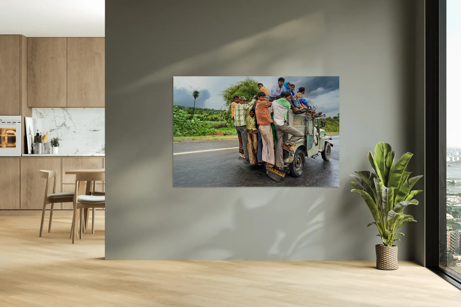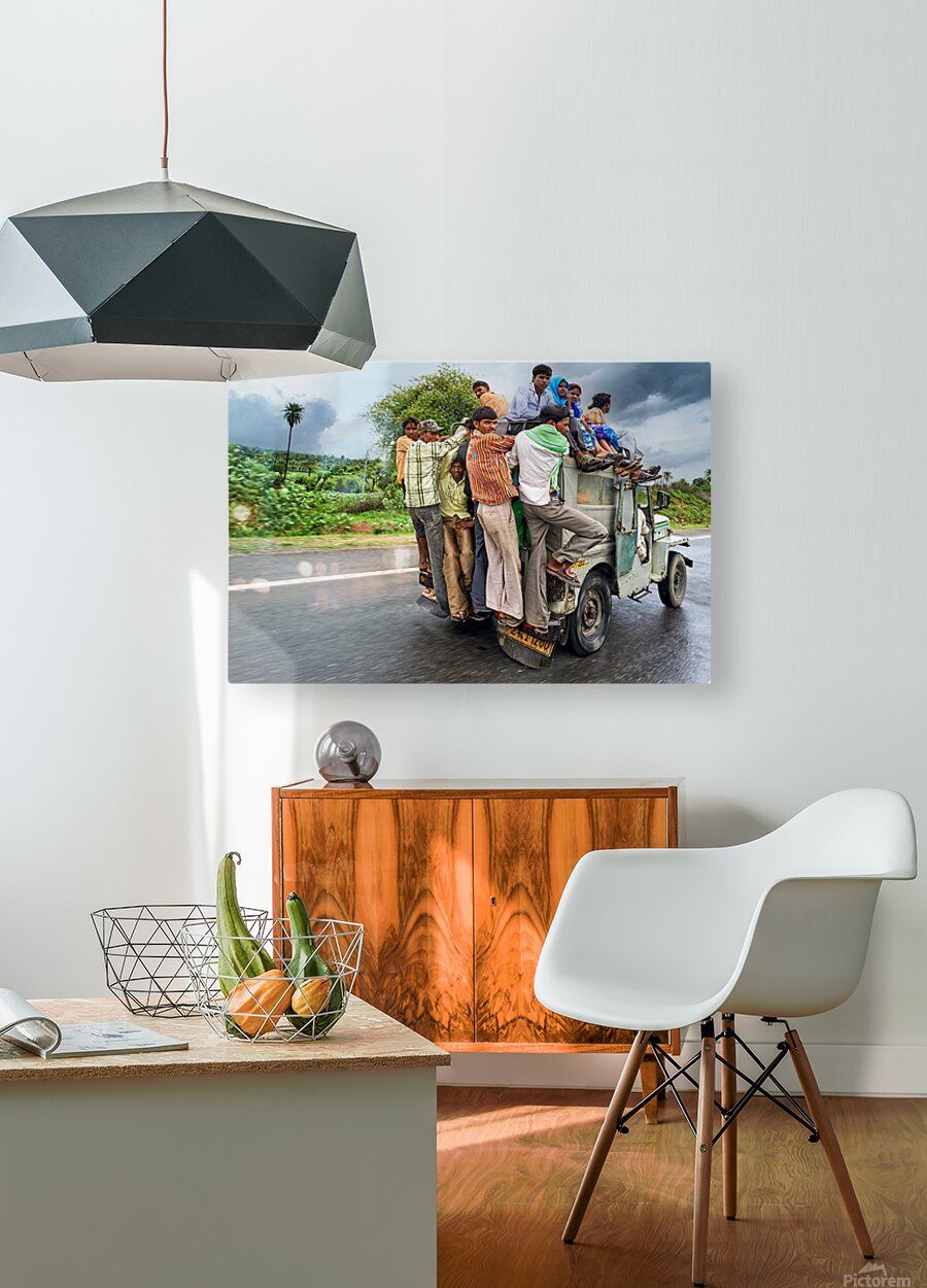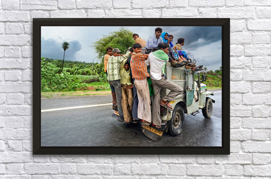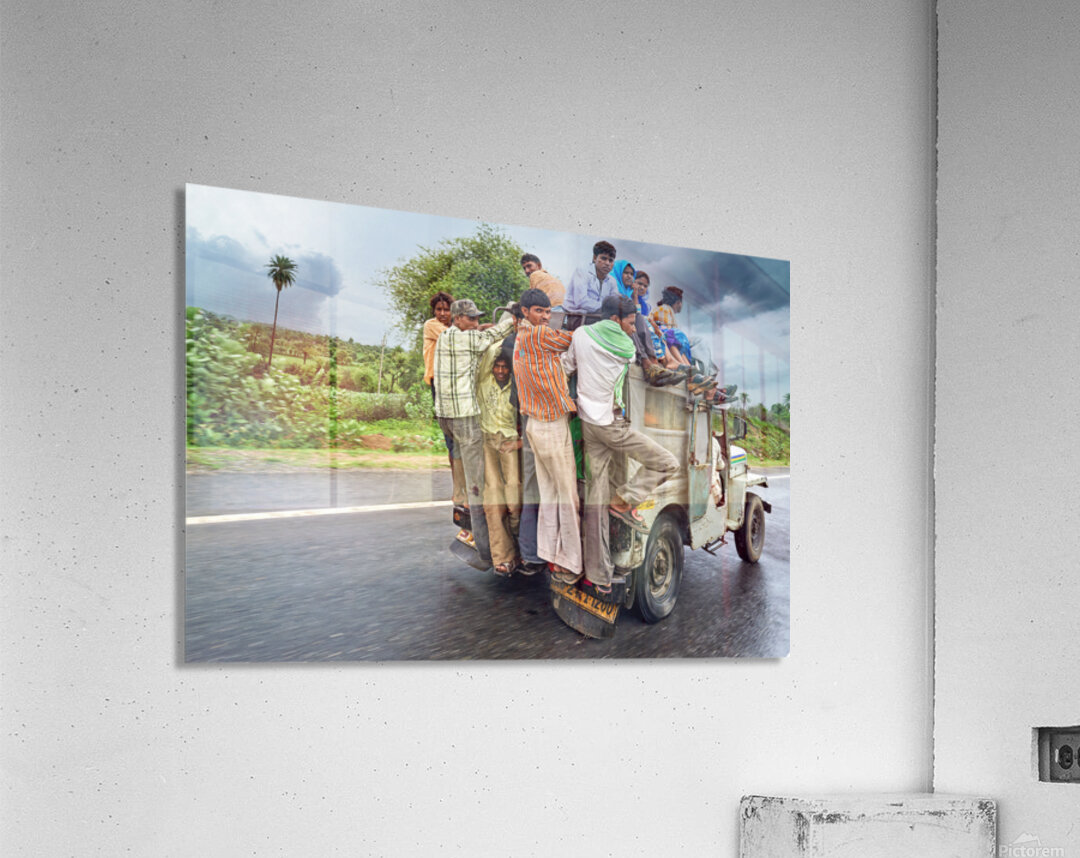 Many people are seen riding on top of a vehicle in Rajasthan. They travel on a road during cloudy weather with greenery around.