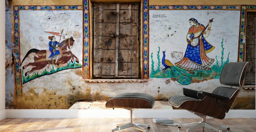 The wall of a house in Bundi features colorful murals showing local people and traditions. It captures the essence of Rajasthan culture.