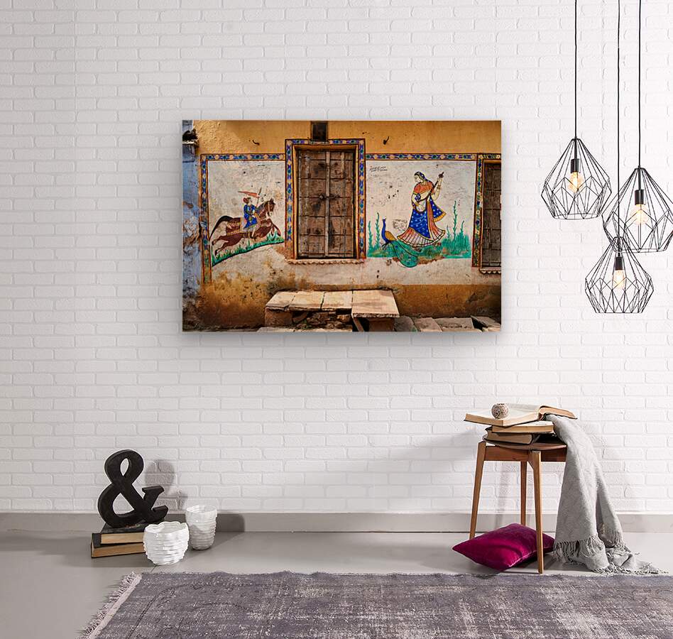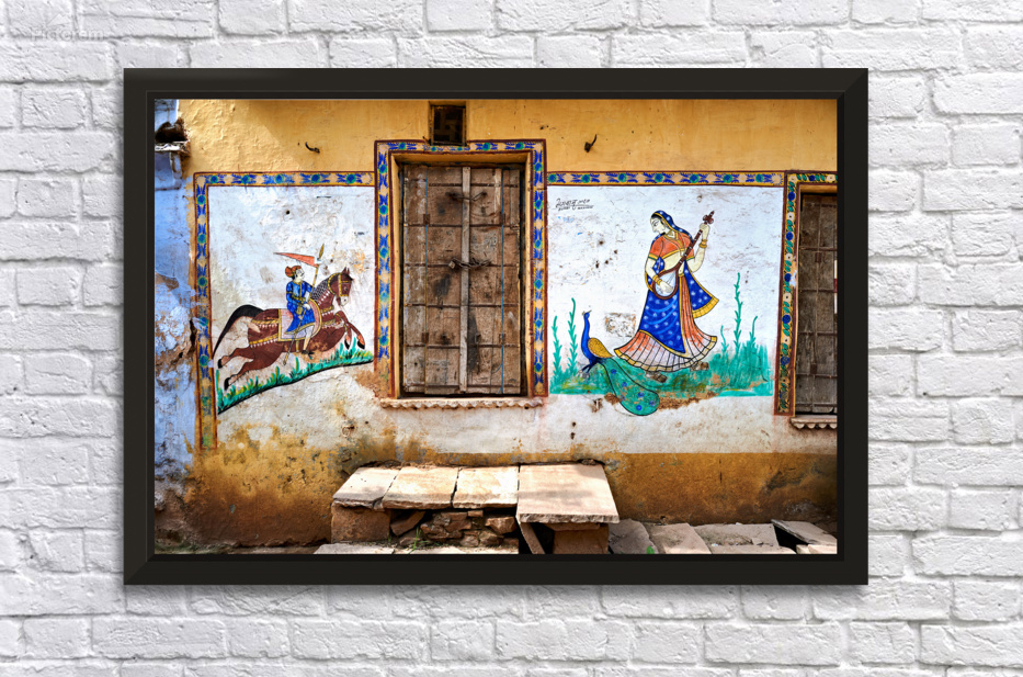 The wall of a house in Bundi features colorful murals showing local people and traditions. It captures the essence of Rajasthan culture.