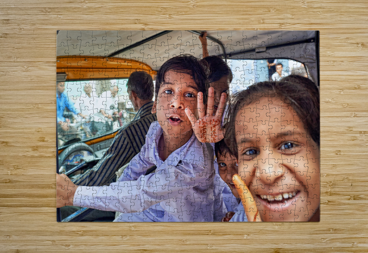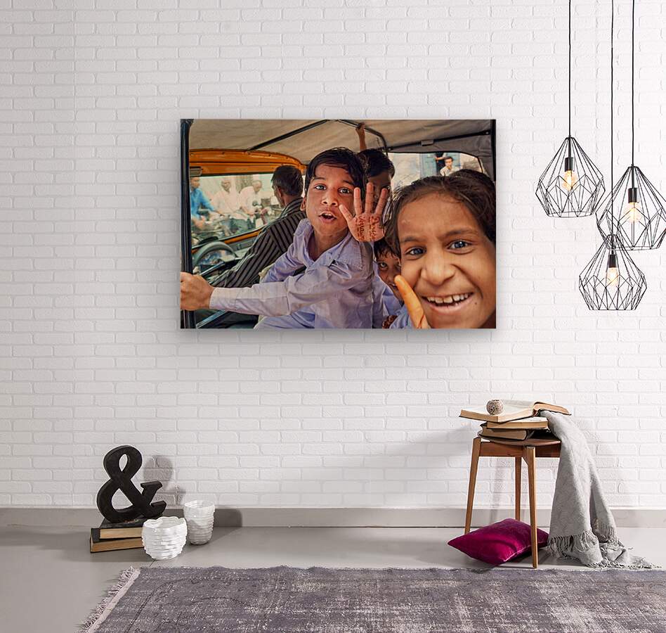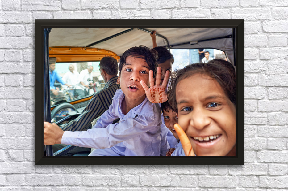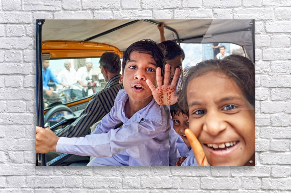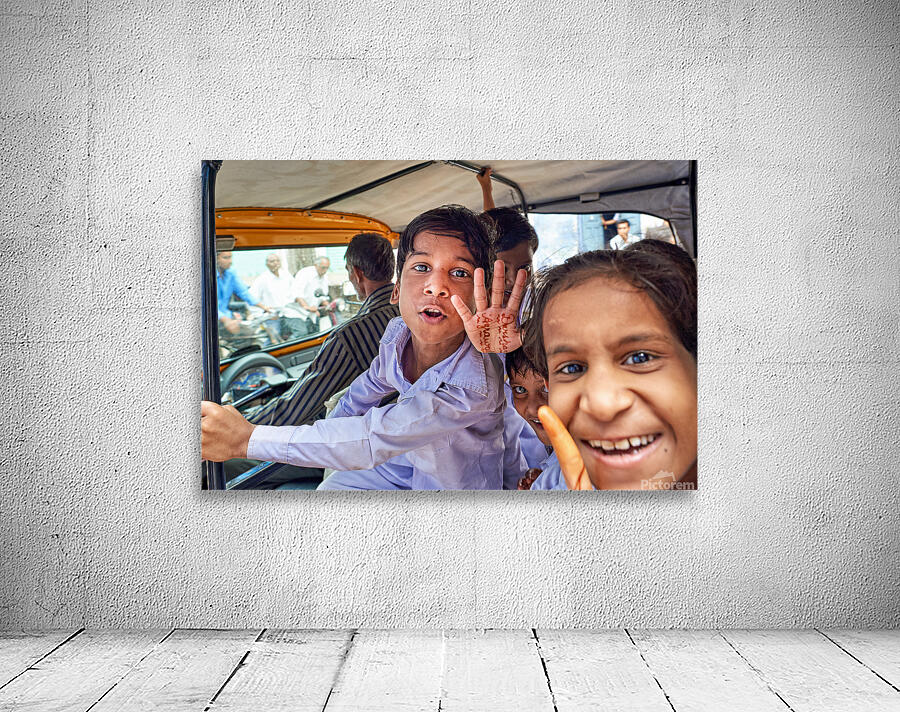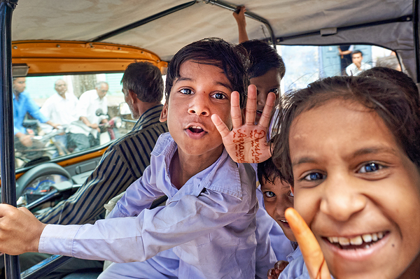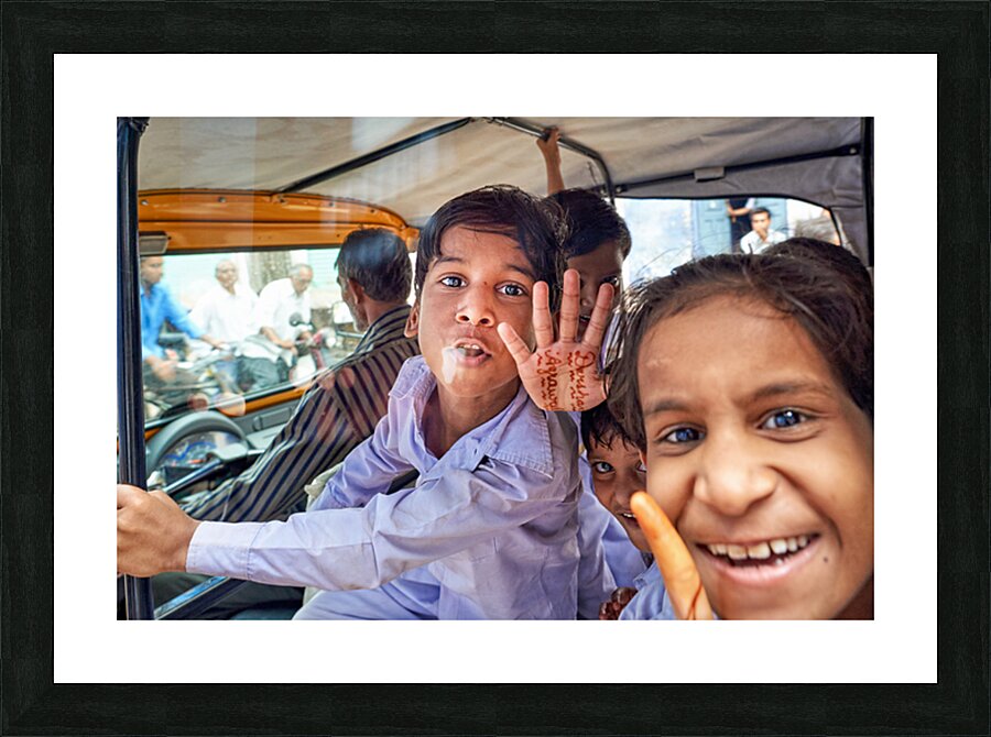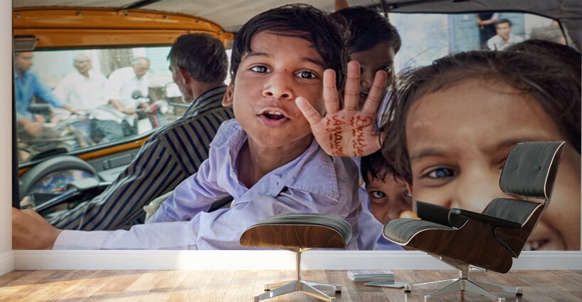 Happy kids enjoy a ride in a car in Bundi Rajasthan. They greet the camera with smiles and waves. This moment captures their joy and energy.