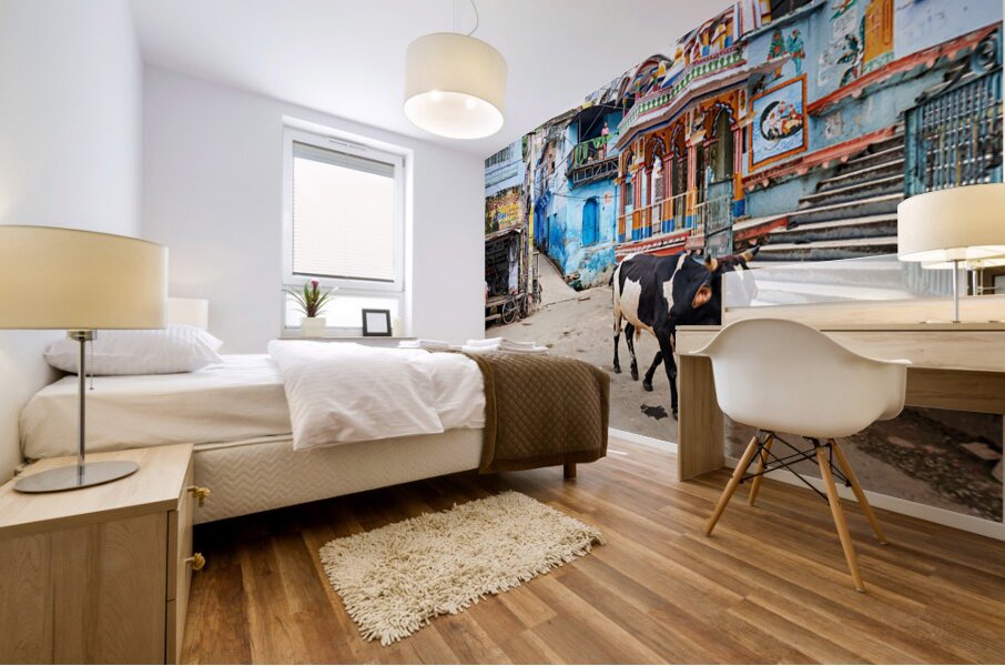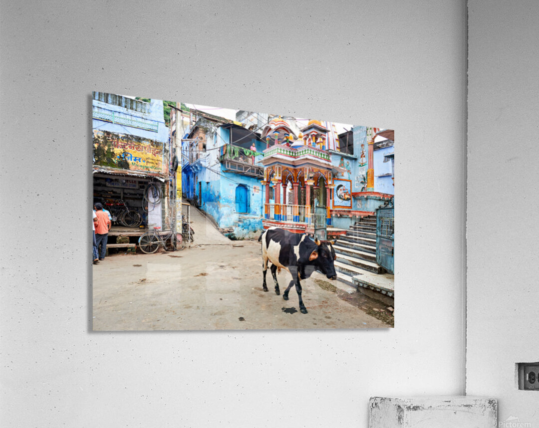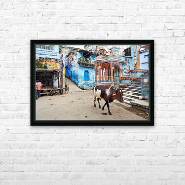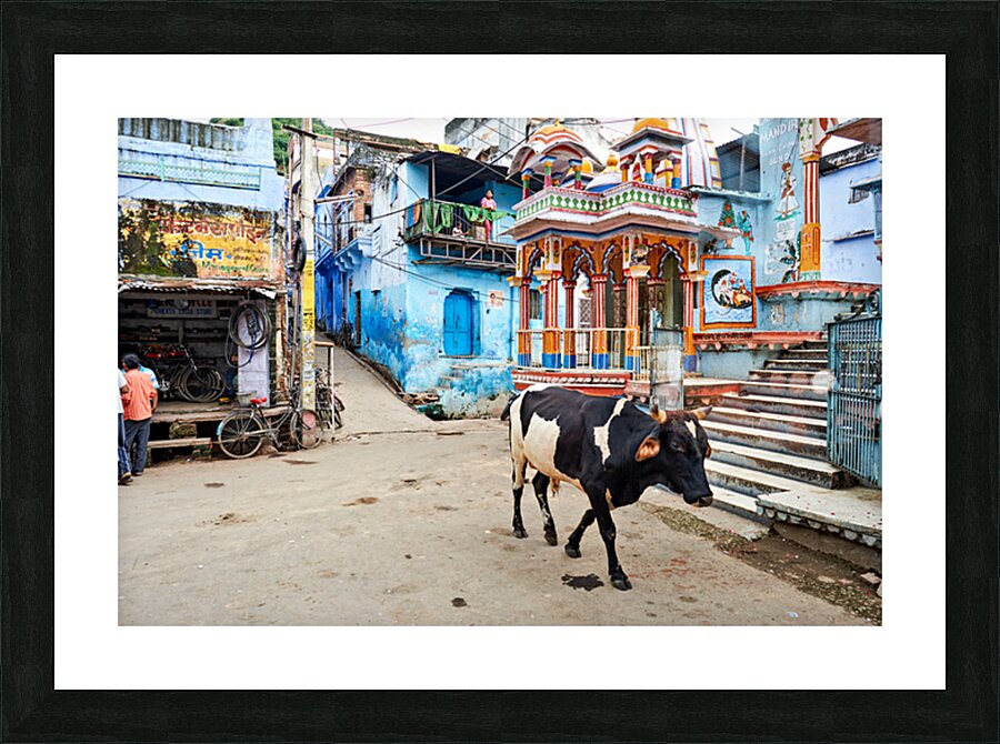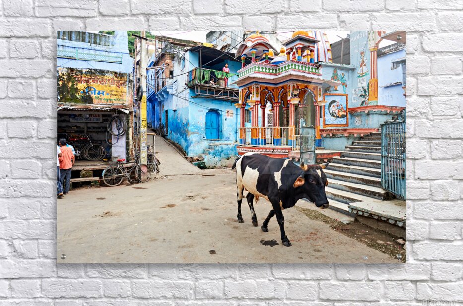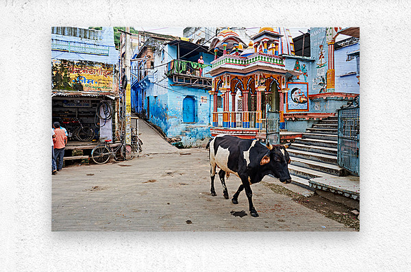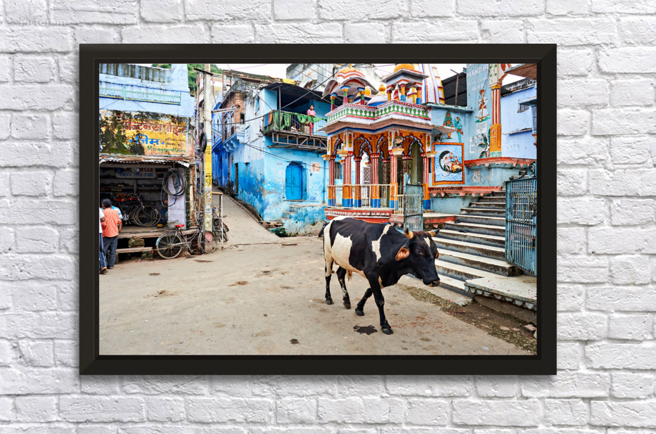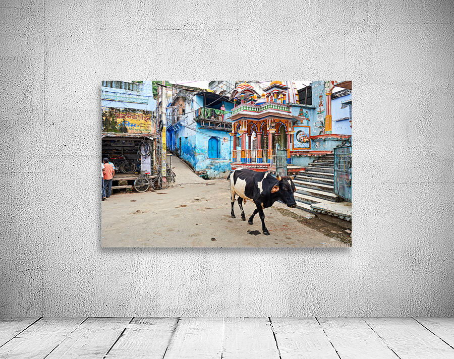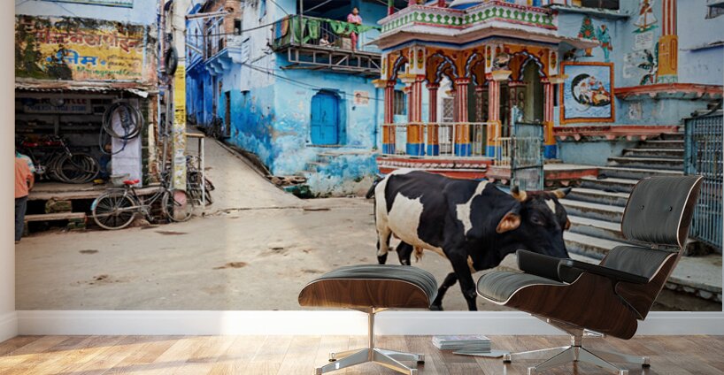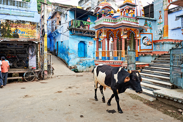 A cow walks through the street near a painted house in Bundi Rajasthan. People can be seen in the background with buildings around.