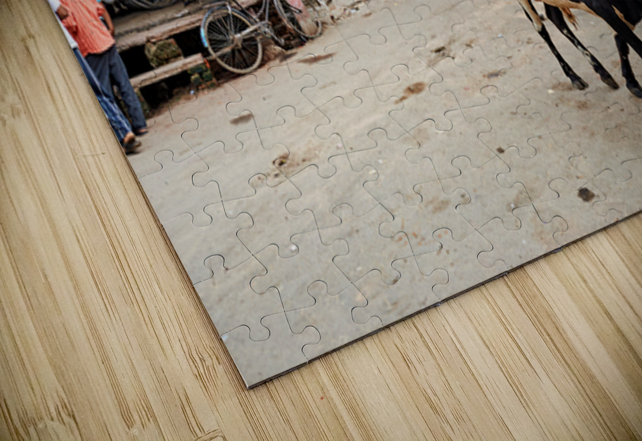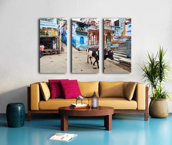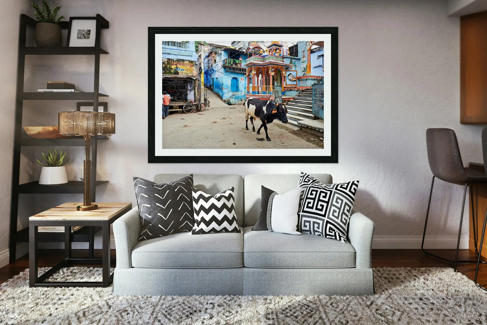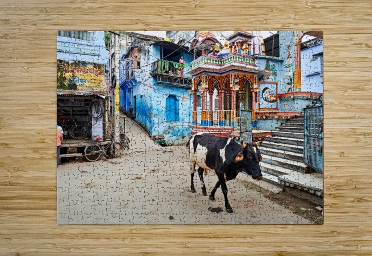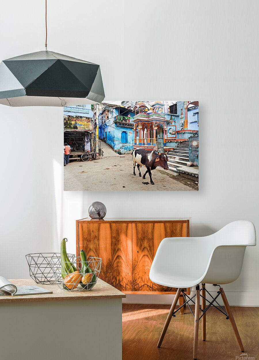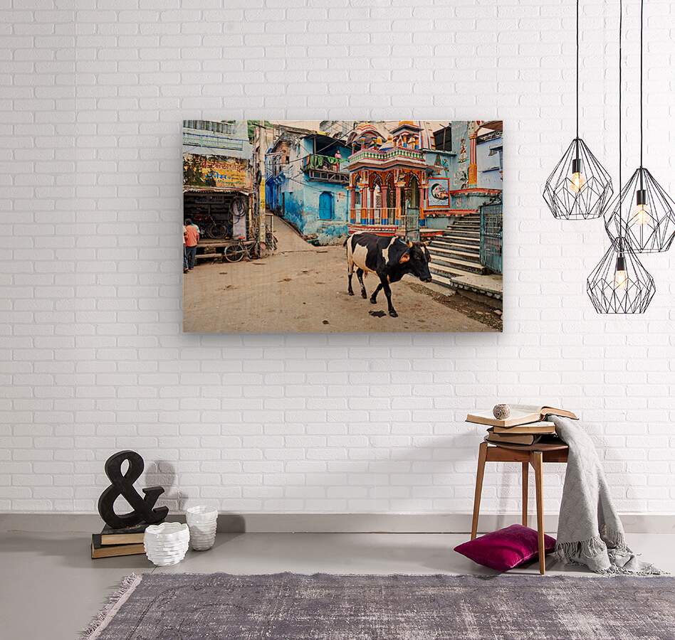 A cow walks through the street near a painted house in Bundi Rajasthan. People can be seen in the background with buildings around.