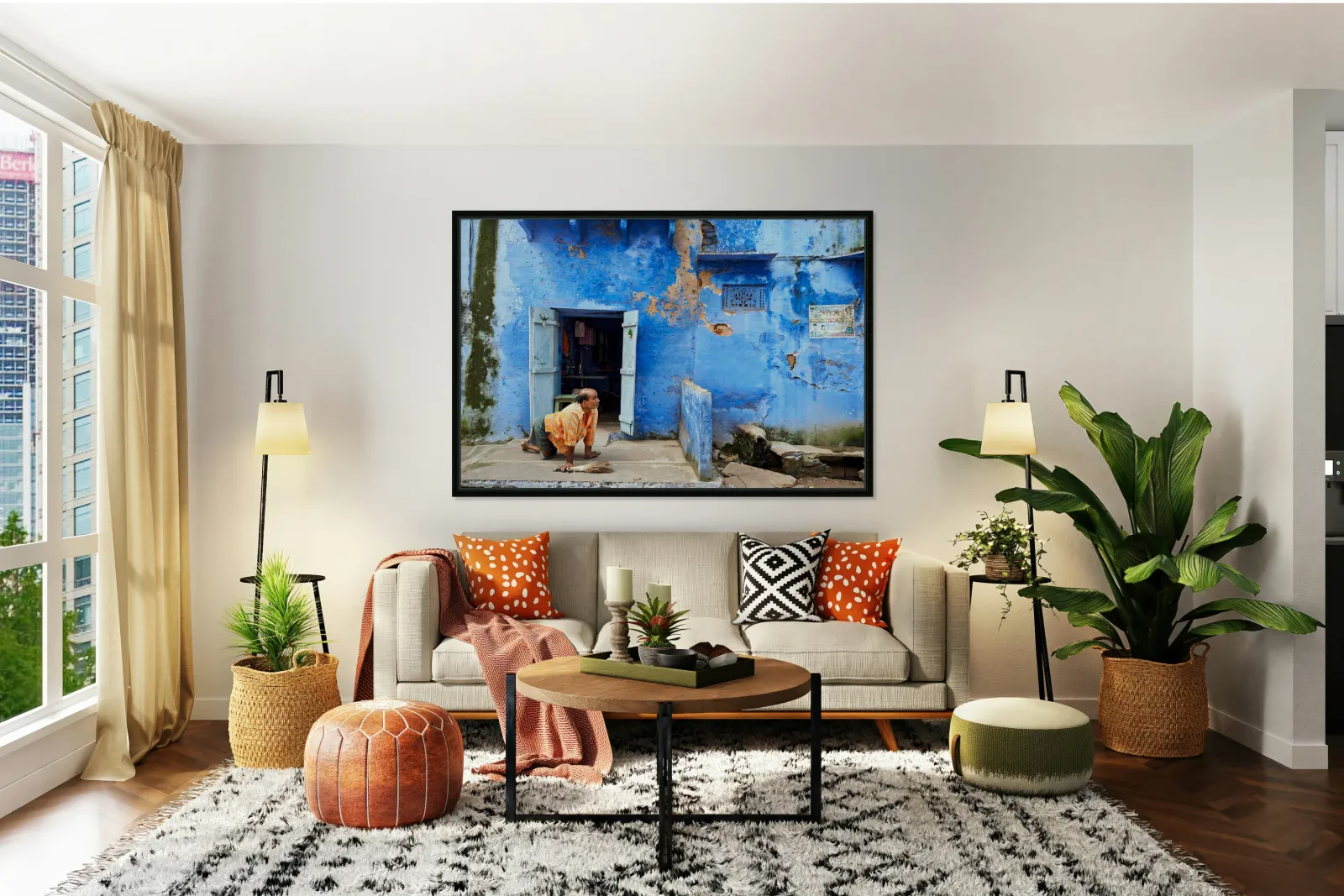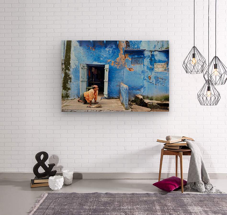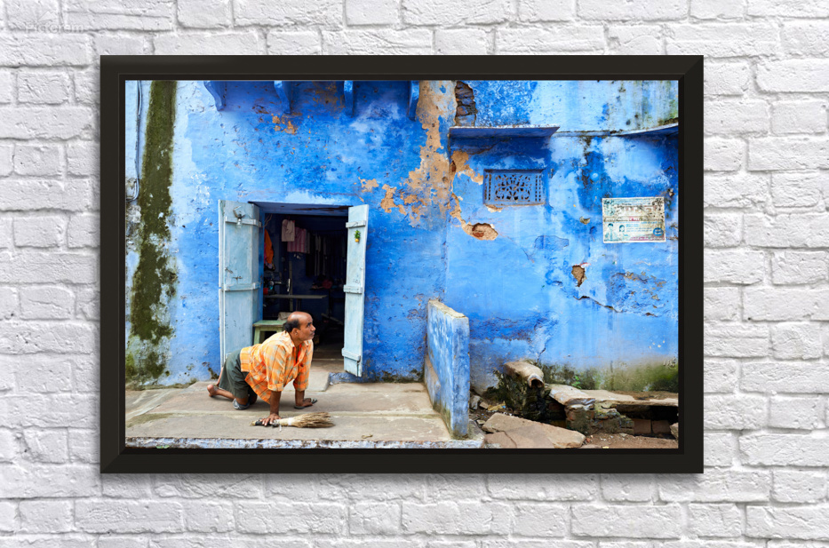 "Man sweeps in front of home in Bundi Rajasthan during the day" in a framed print.
