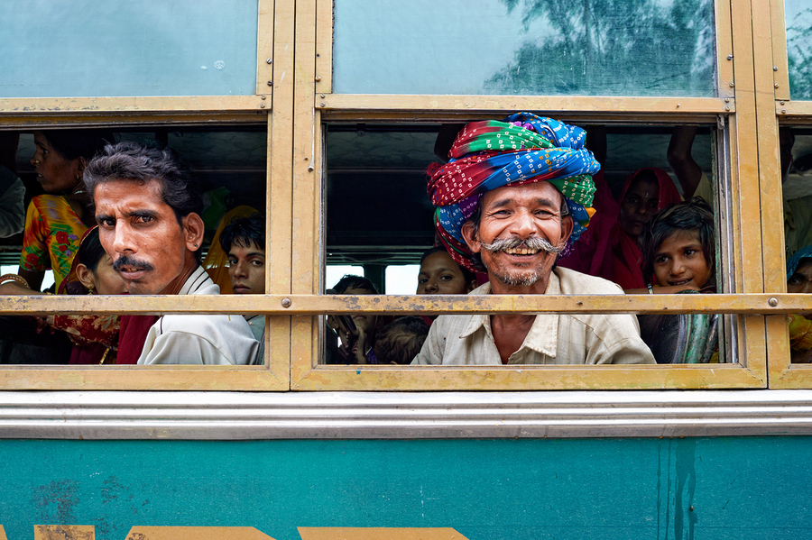 Passengers share a bus ride in Udaipur Rajasthan. People smile and look outside as they travel through the city.