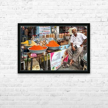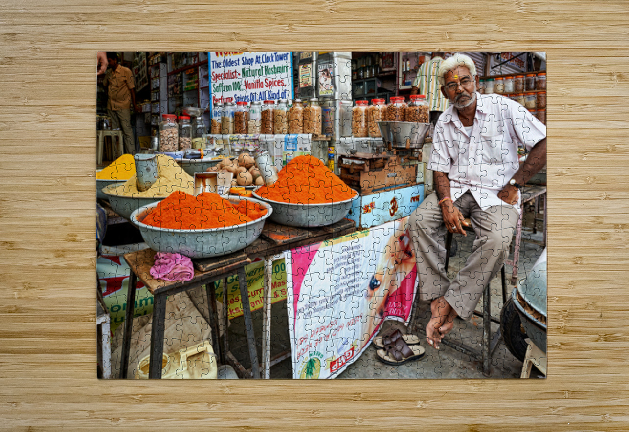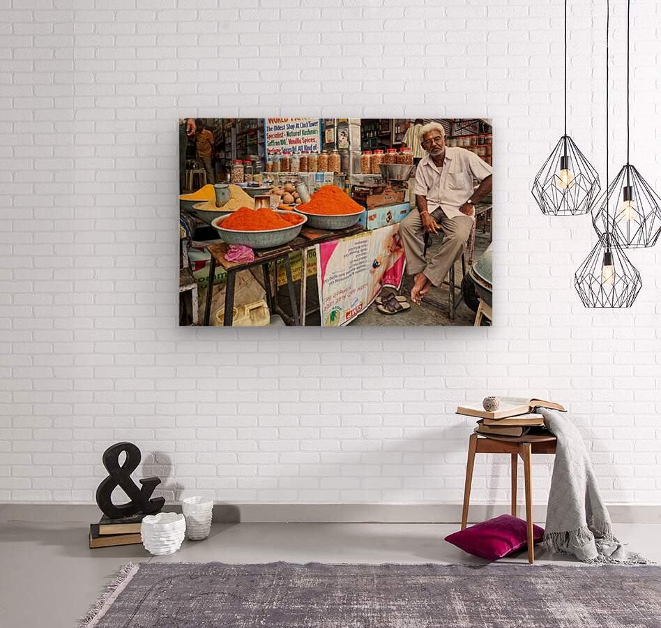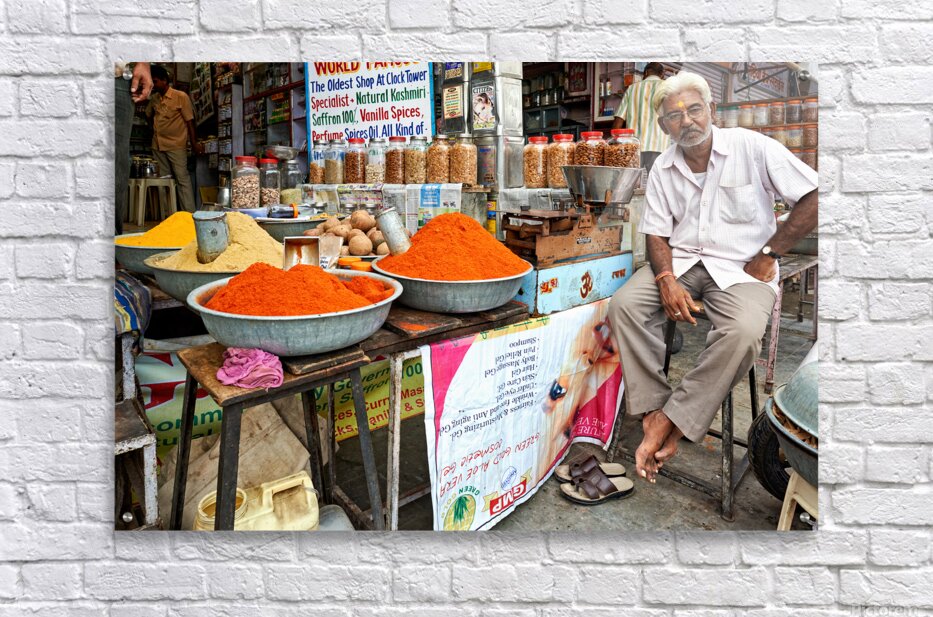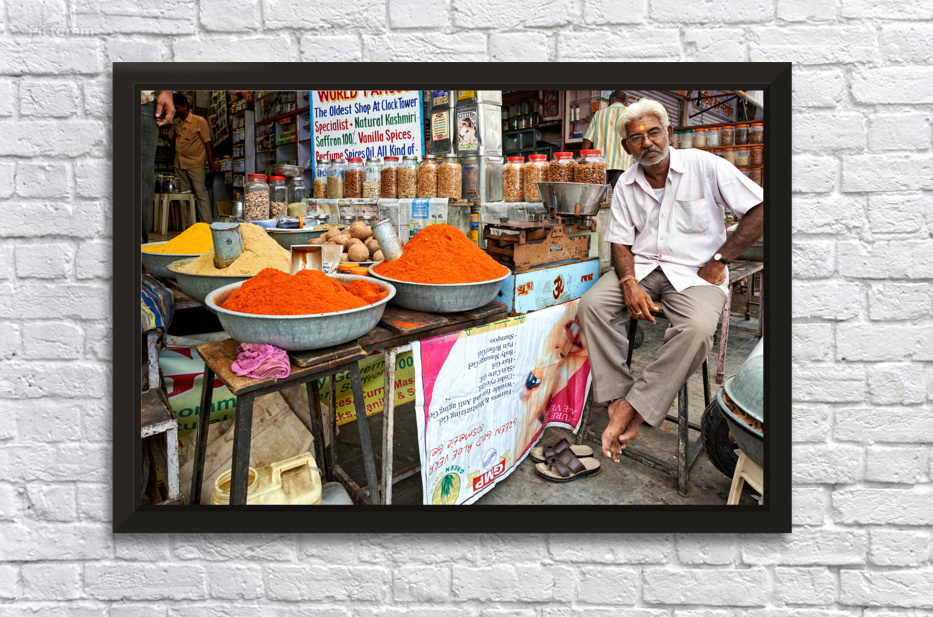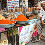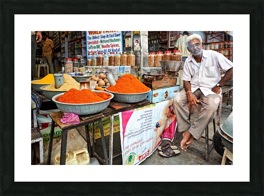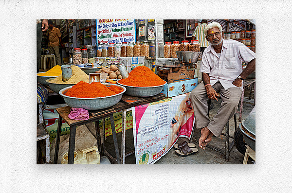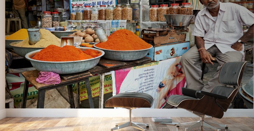 A spice vendor sits at his stall in Sardar Market Girdikot Jodhpur. Bright spices are displayed in bowls. Local shoppers visit the market.