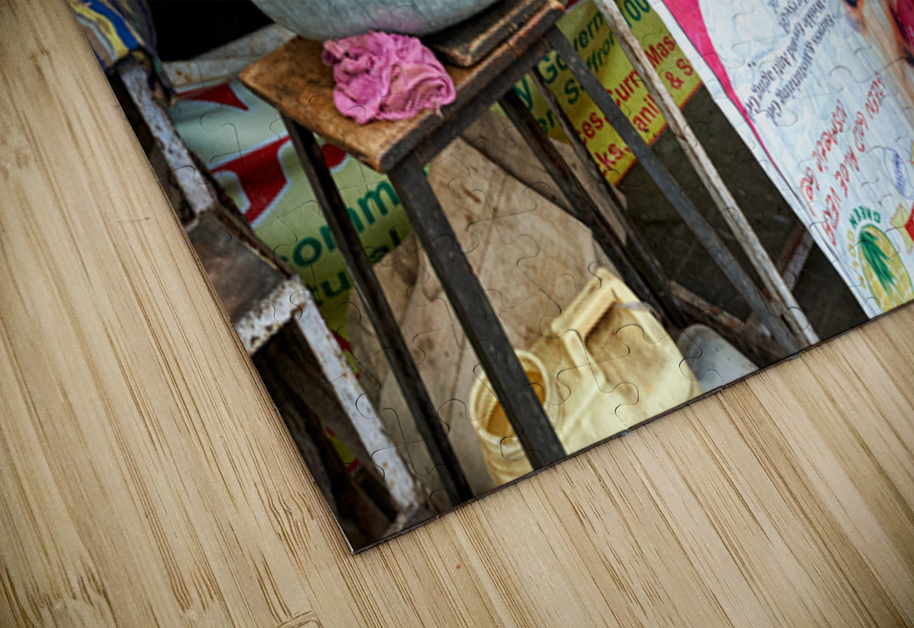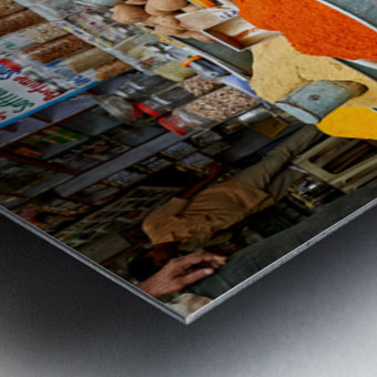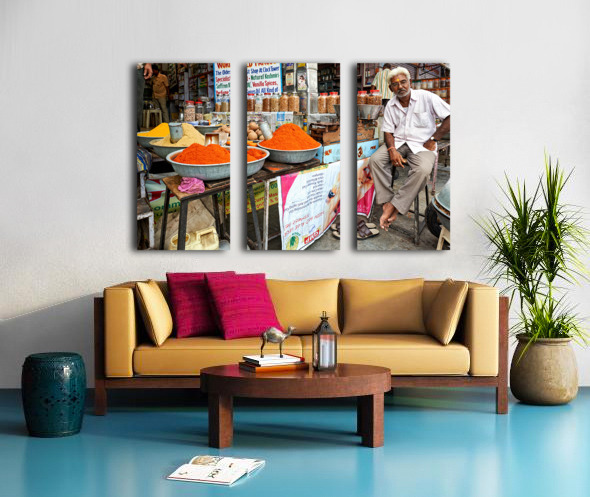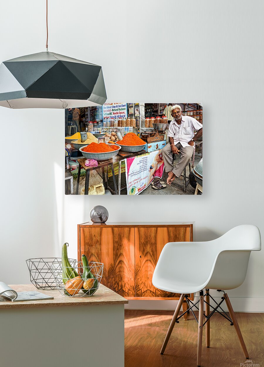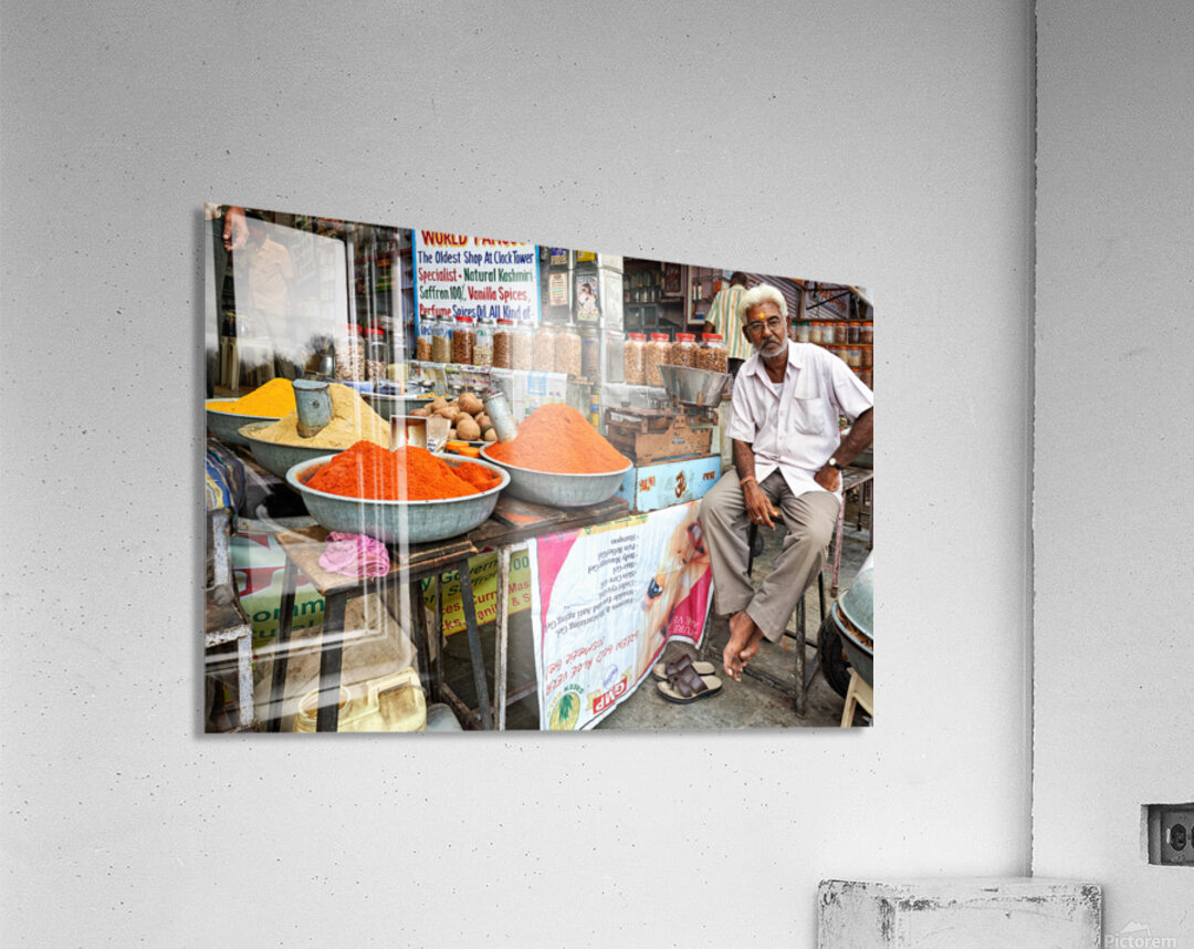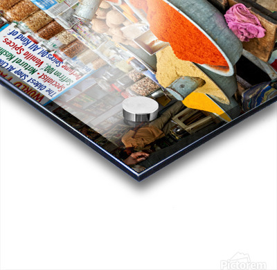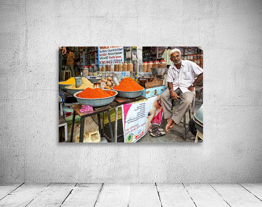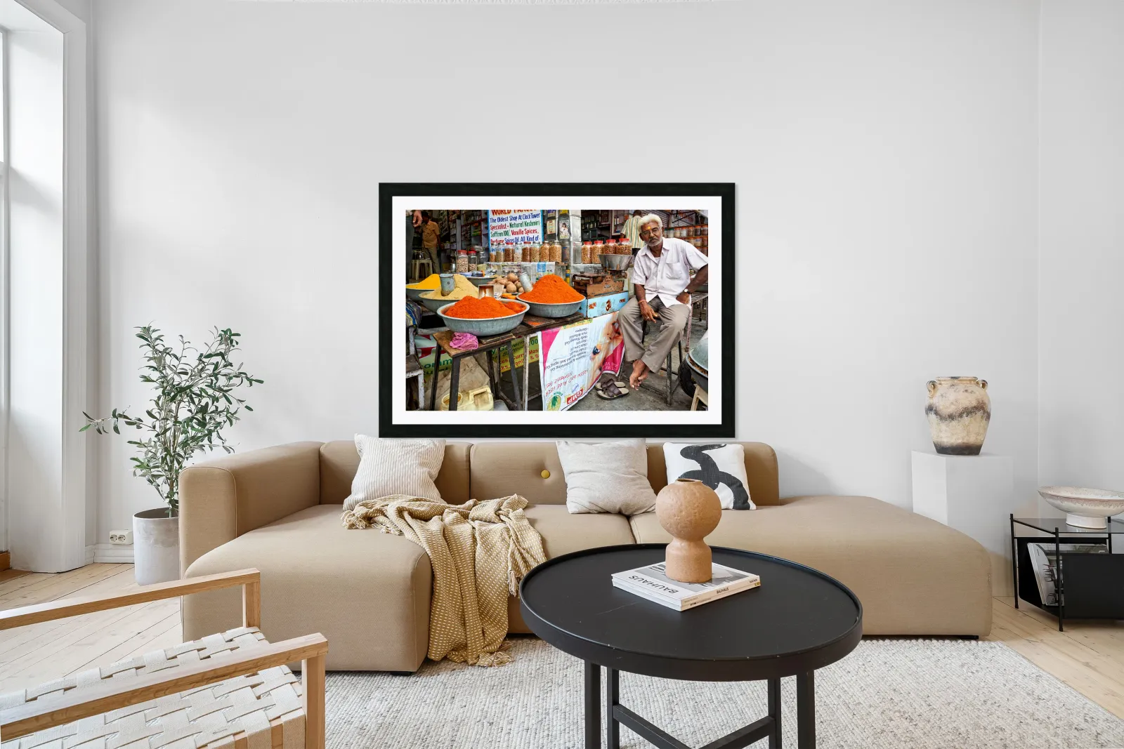 A spice vendor sits at his stall in Sardar Market Girdikot Jodhpur. Bright spices are displayed in bowls. Local shoppers visit the market.