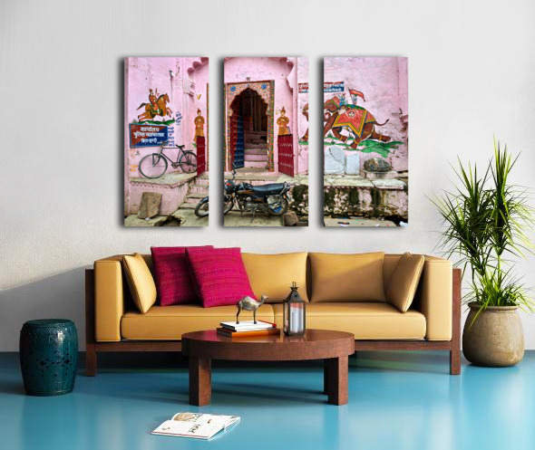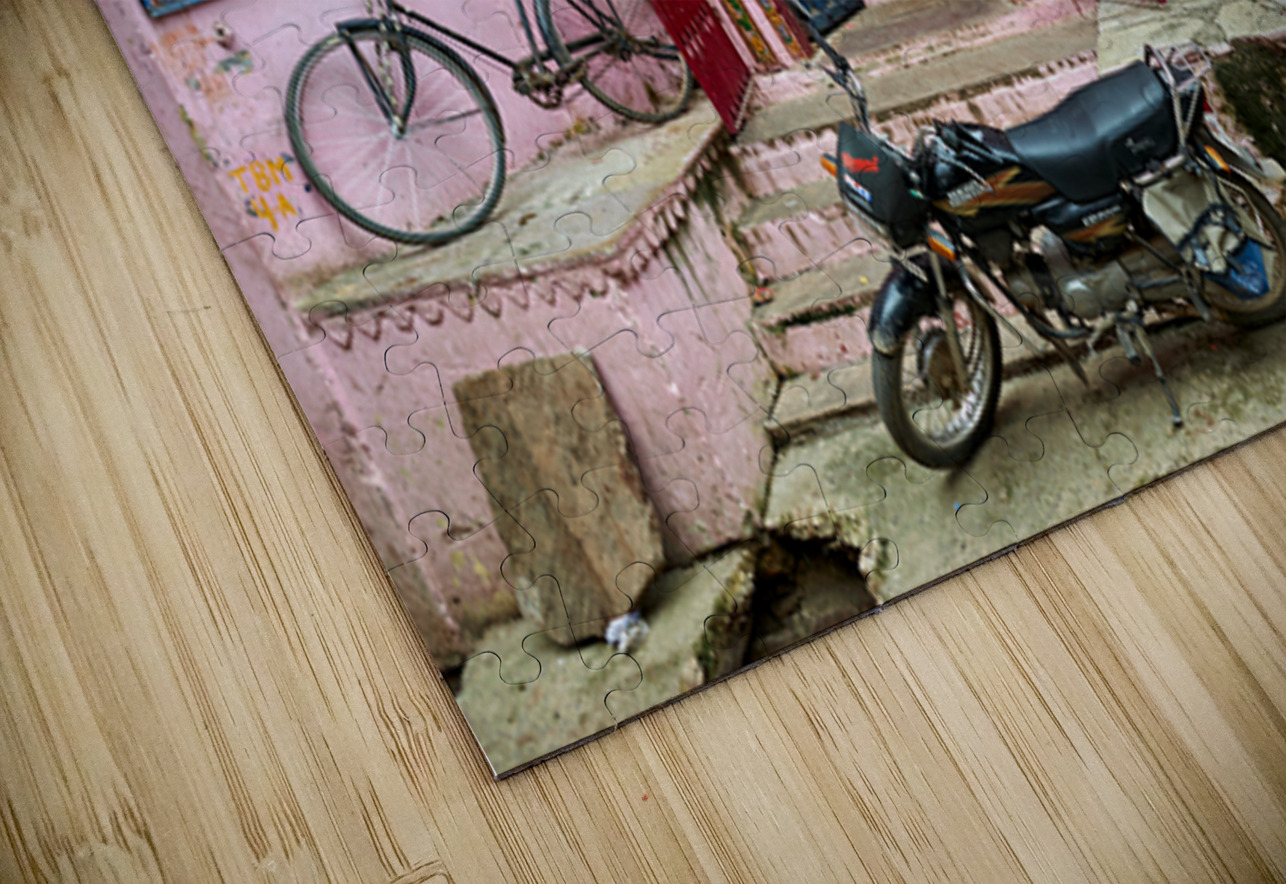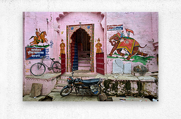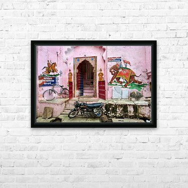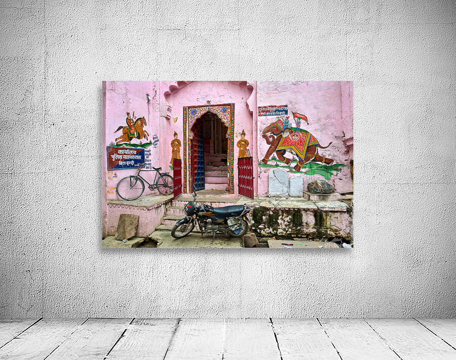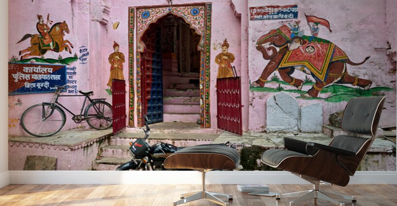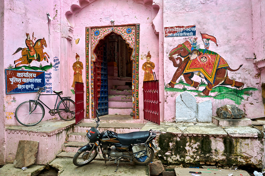 A scene of a painted house in Bundi Rajasthan. The door features colorful designs. A bicycle and motorcycle are parked nearby.