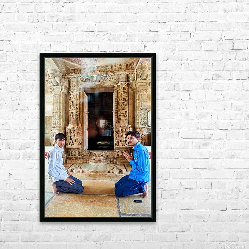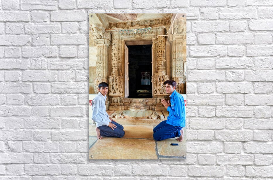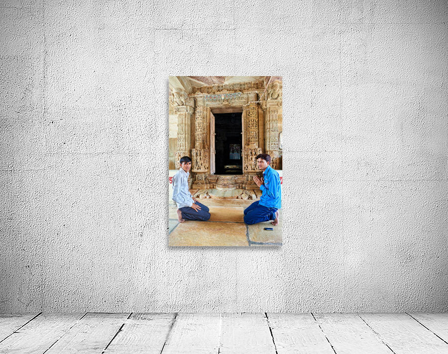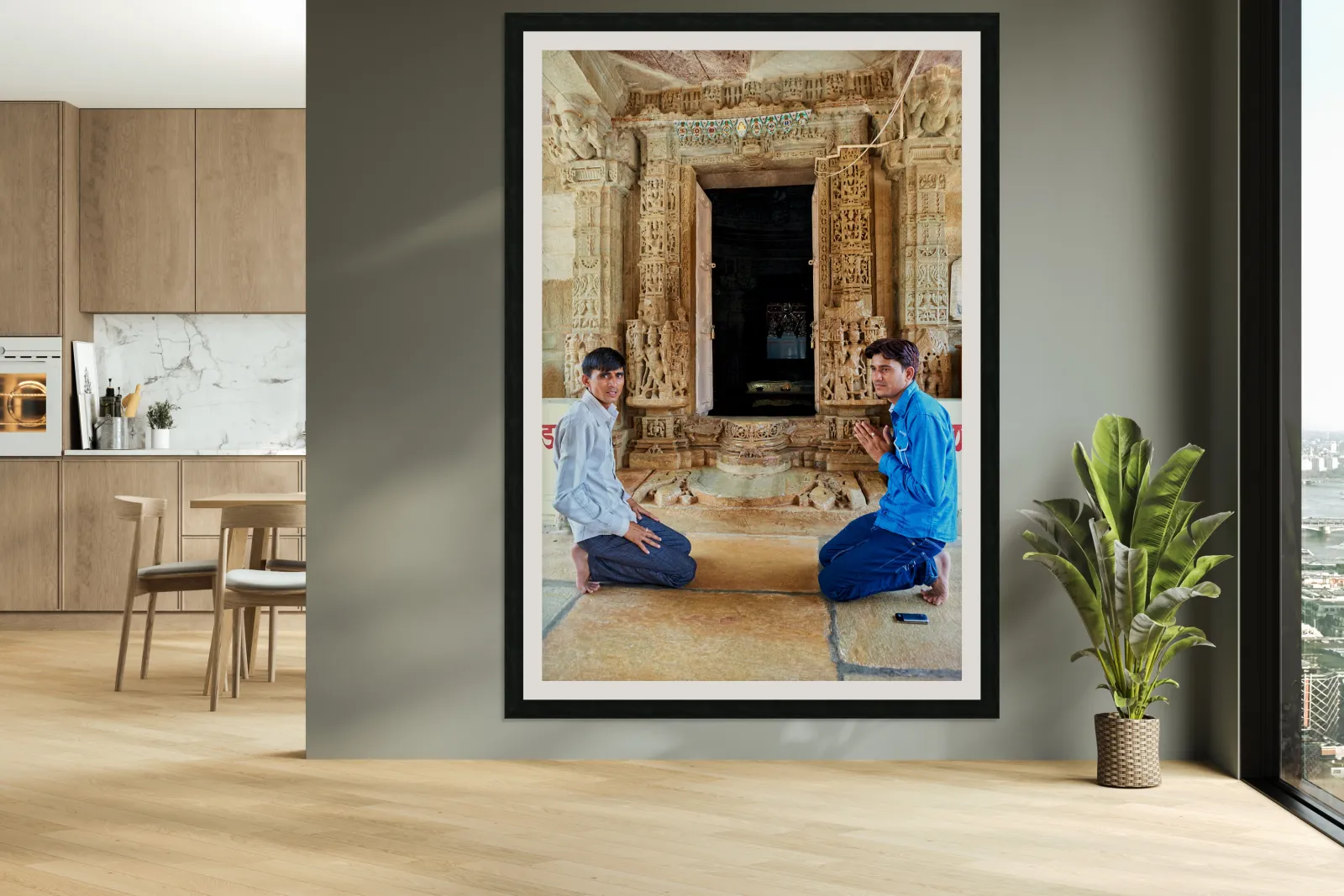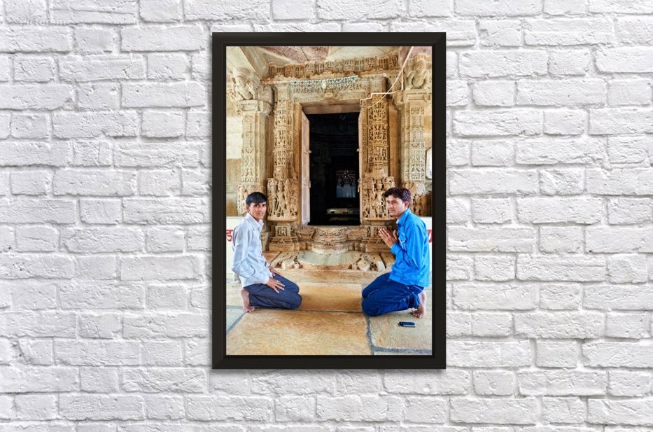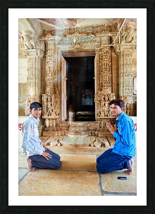 "Visitors pray at a temple entrance in Chittorgarh Fort" in a framed print.