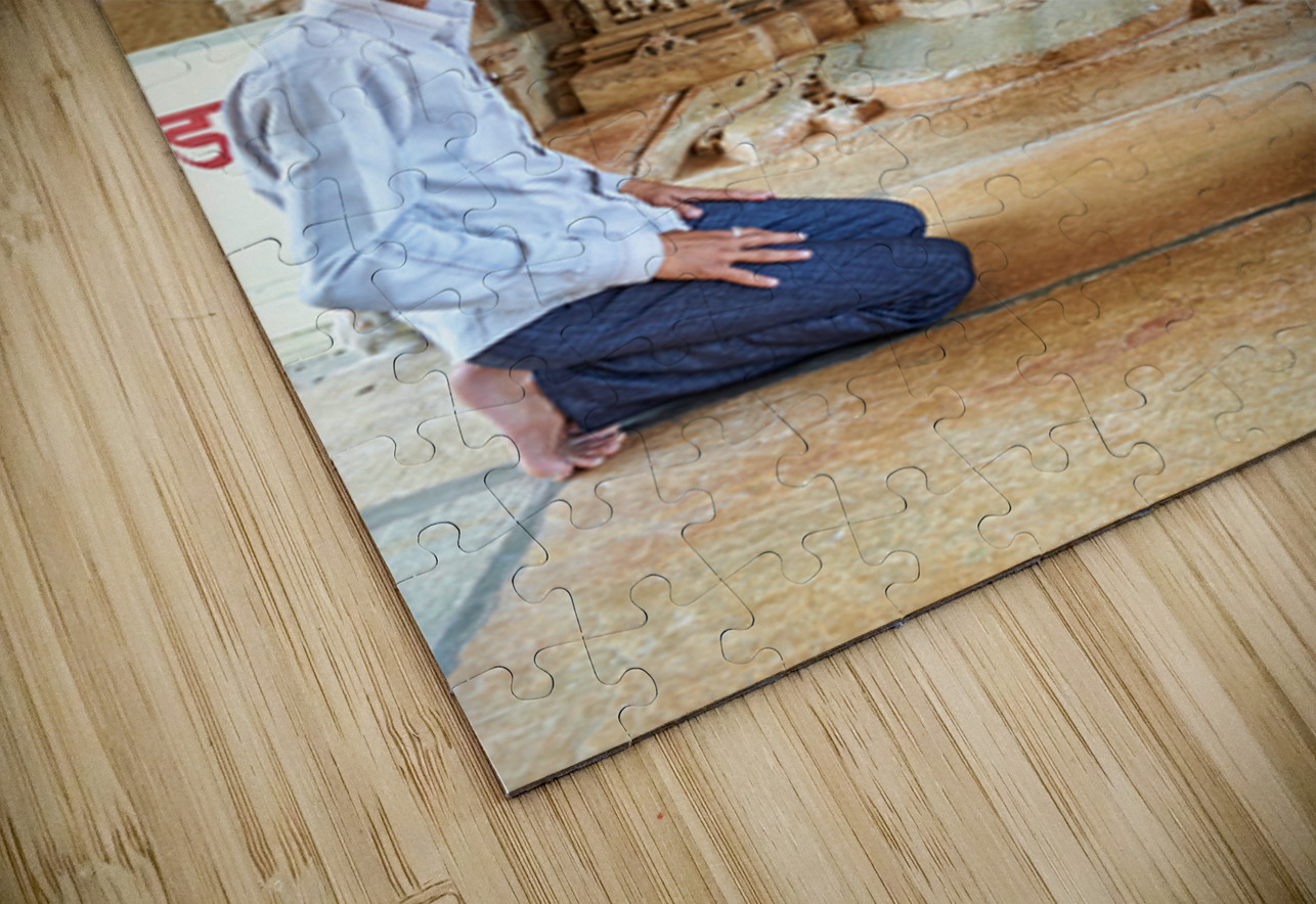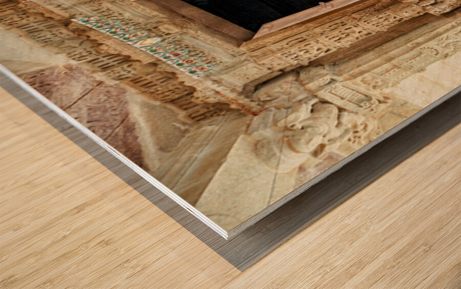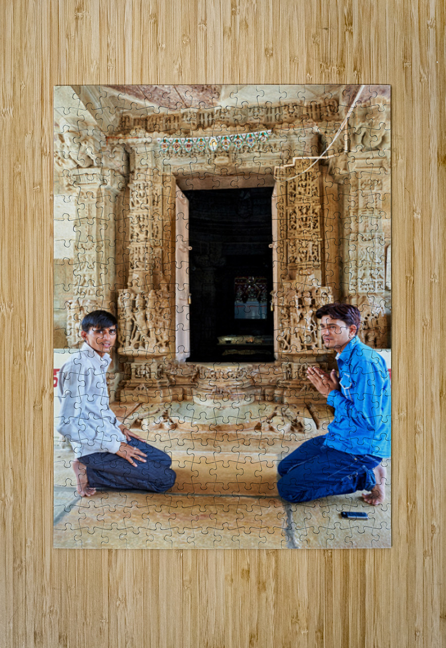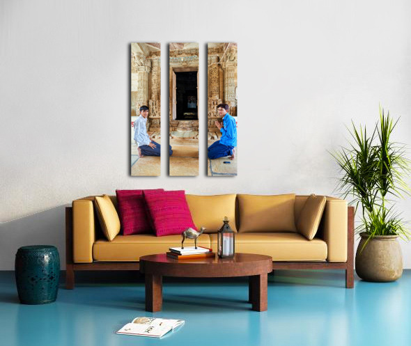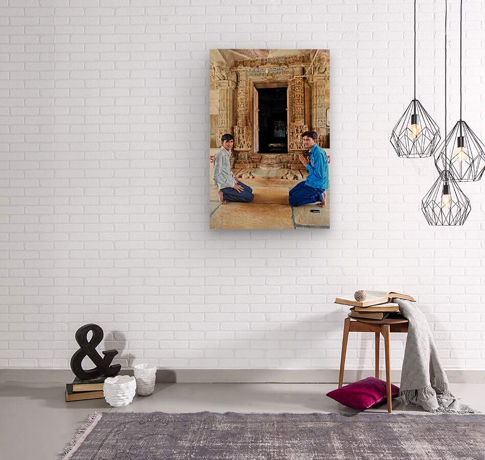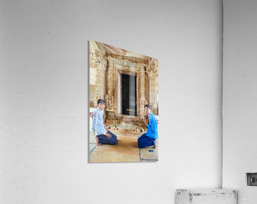 "Visitors pray at a temple entrance in Chittorgarh Fort" in a framed print.