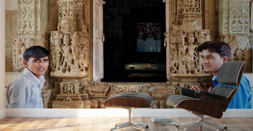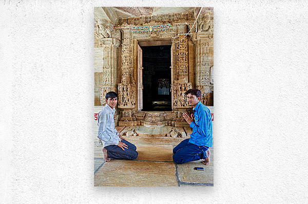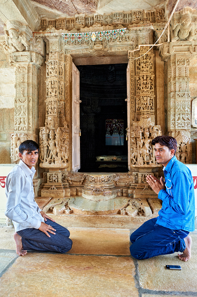 Two men kneel in prayer by the entrance of a temple inside Chittorgarh Fort. Intricate carvings surround the doorway.
