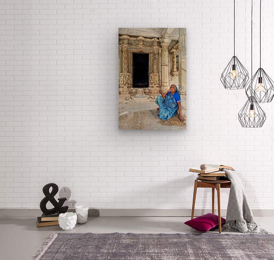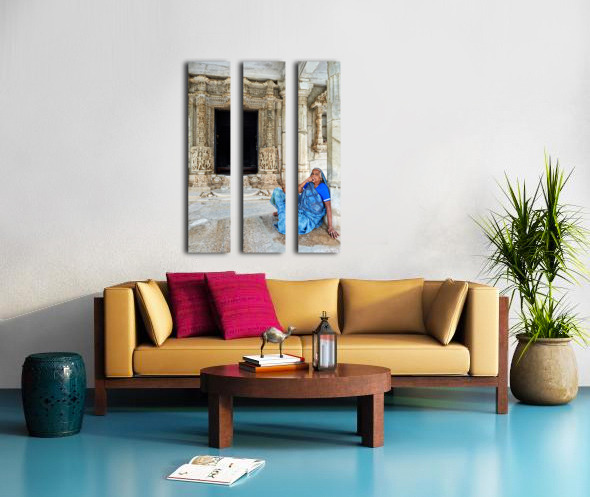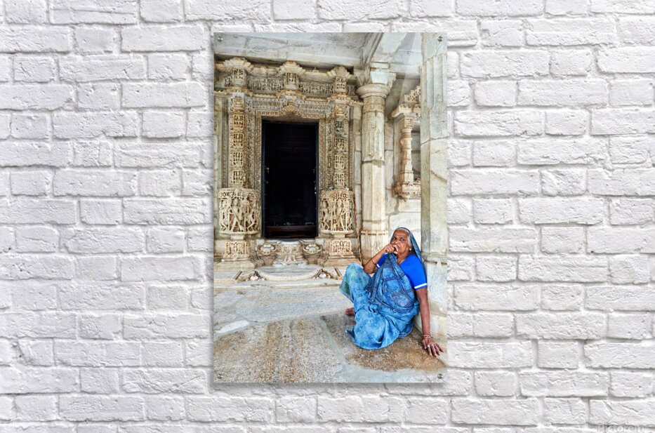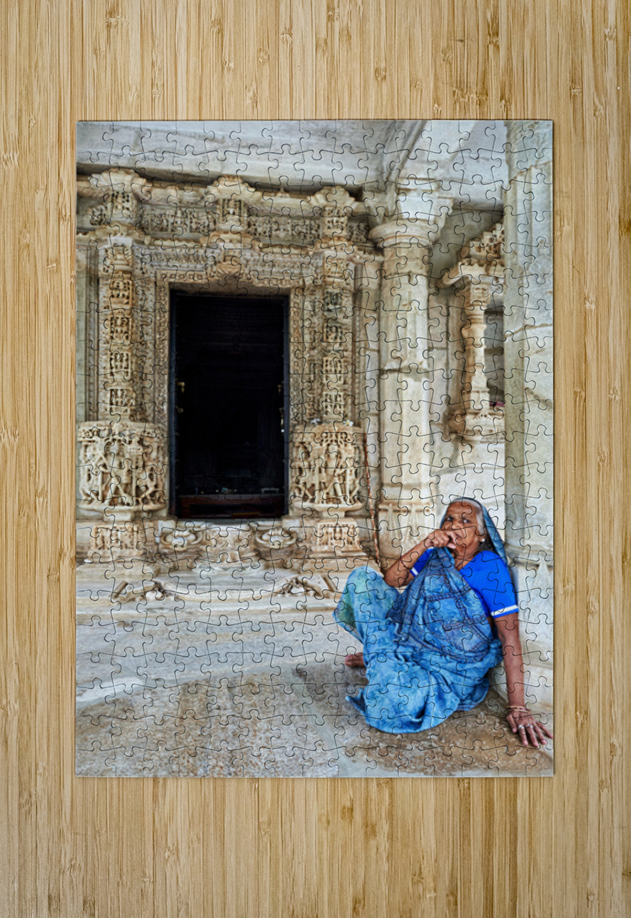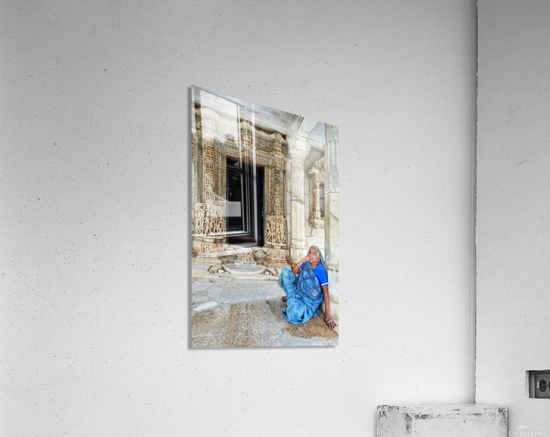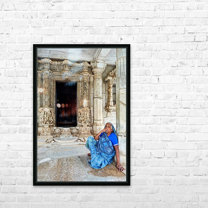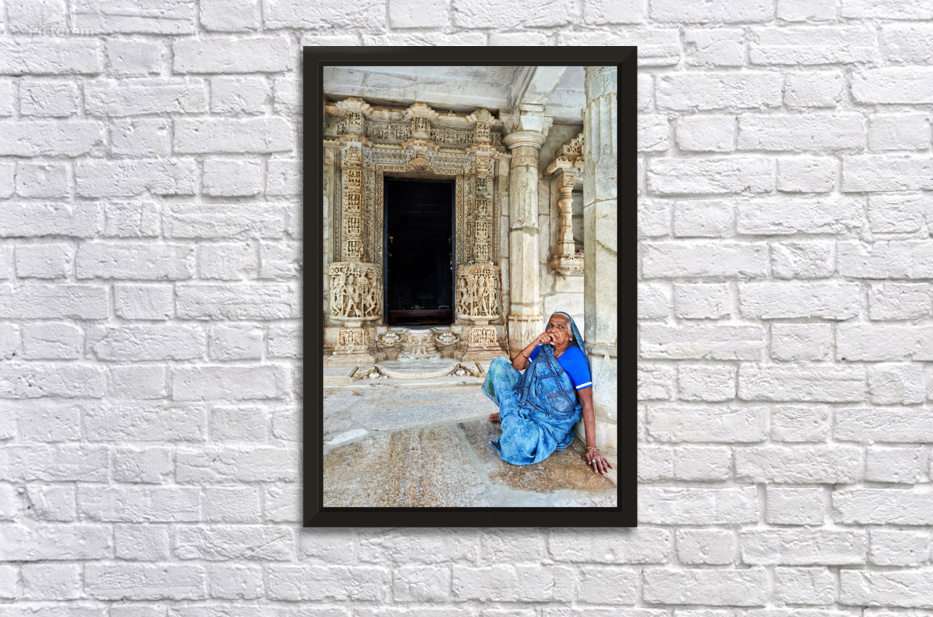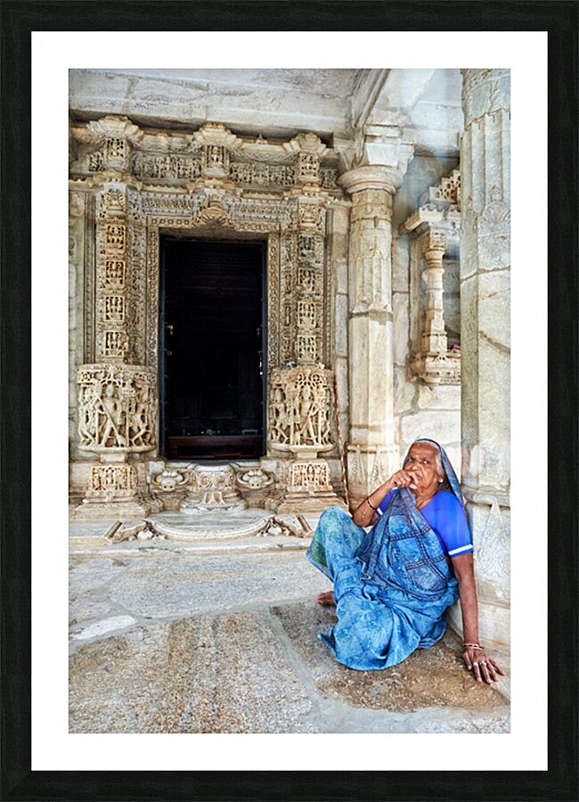 "Old Jain temples in Ranakpur Rajasthan with a woman resting" in a framed print.