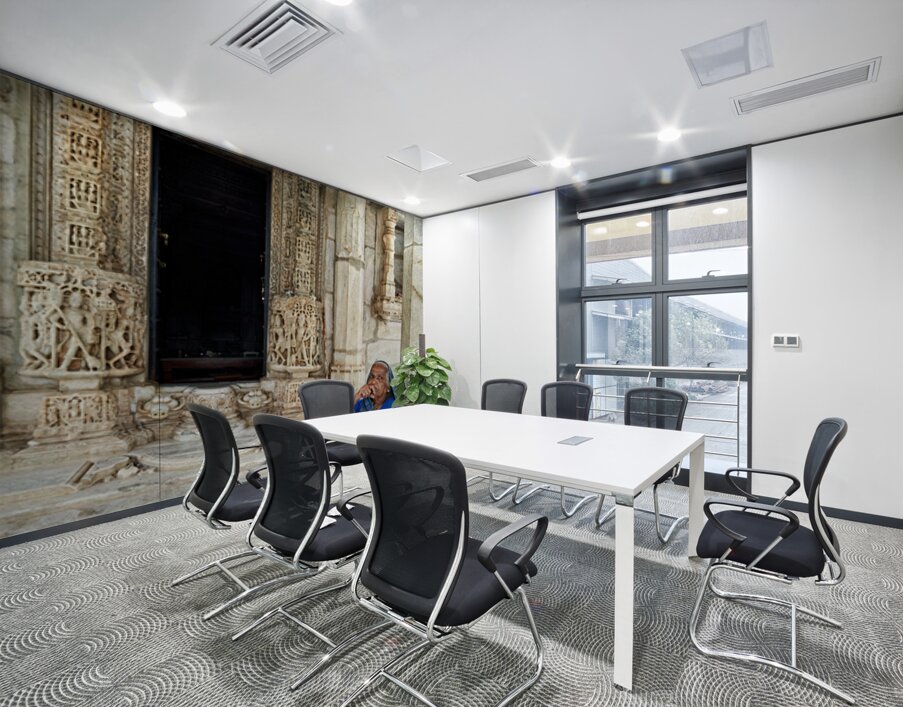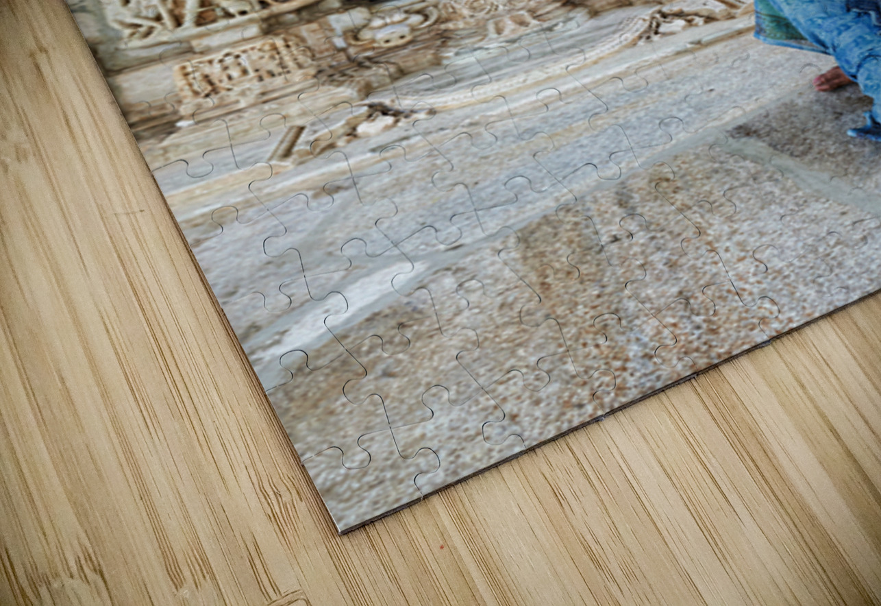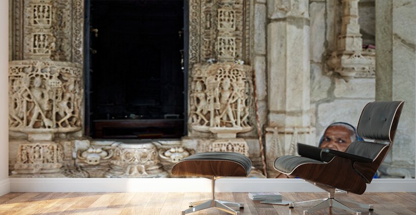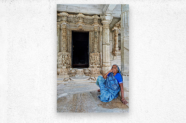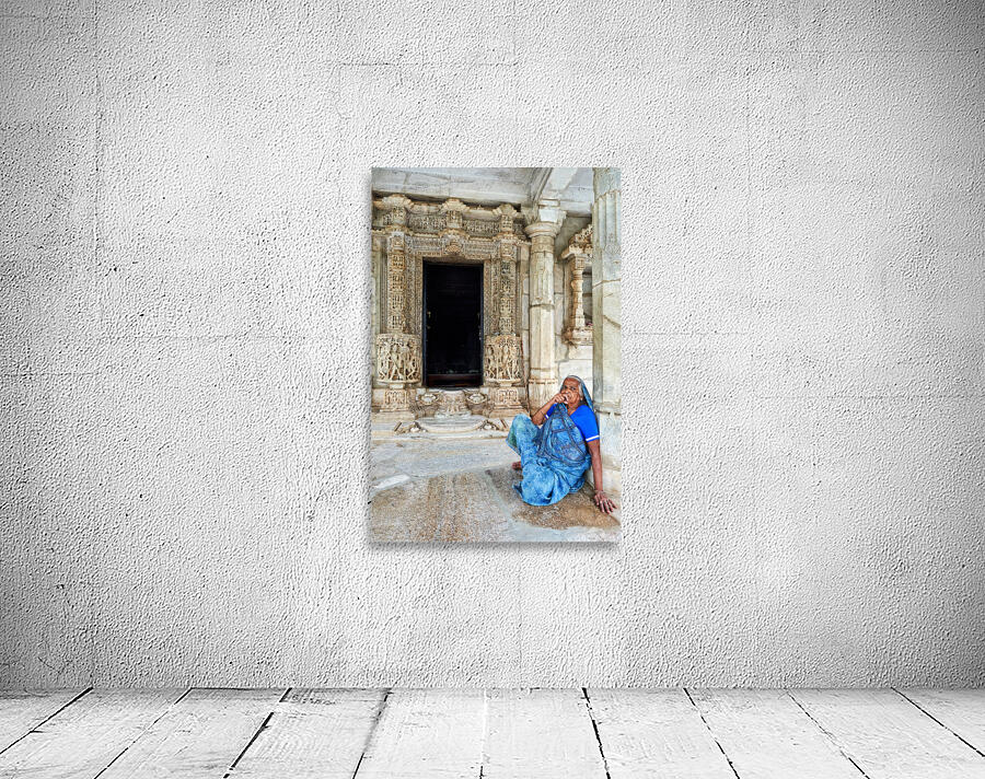 A woman sits by a doorway of Jain old temples in Ranakpur Rajasthan. The intricate carvings on the stone are visible.