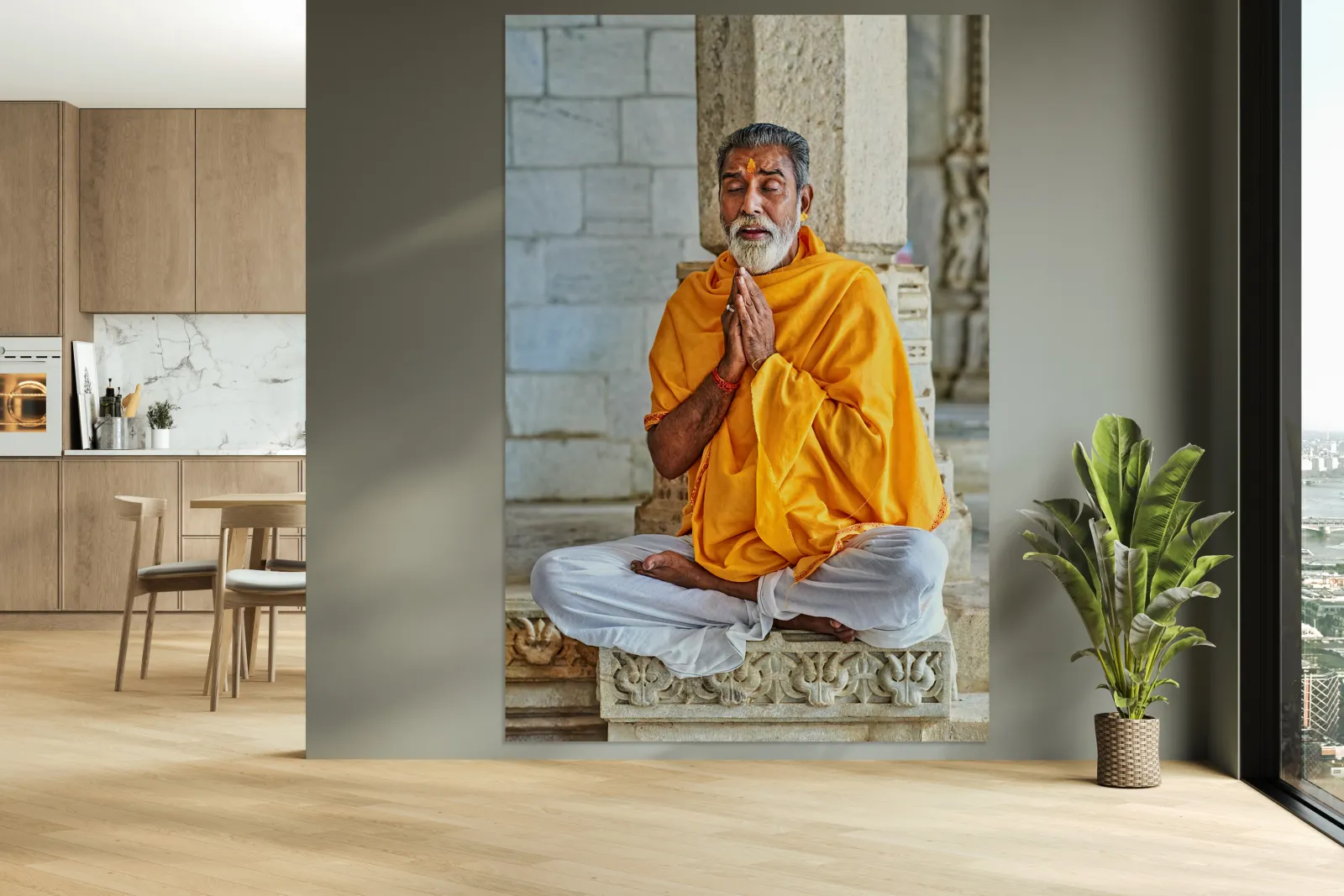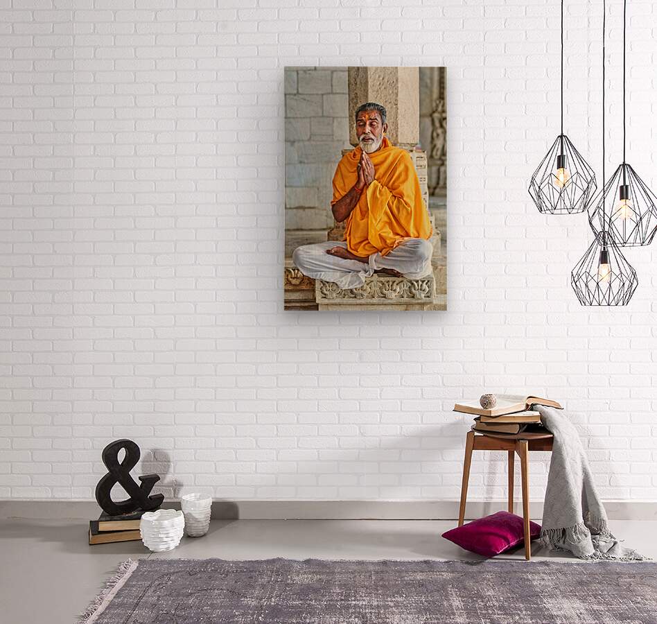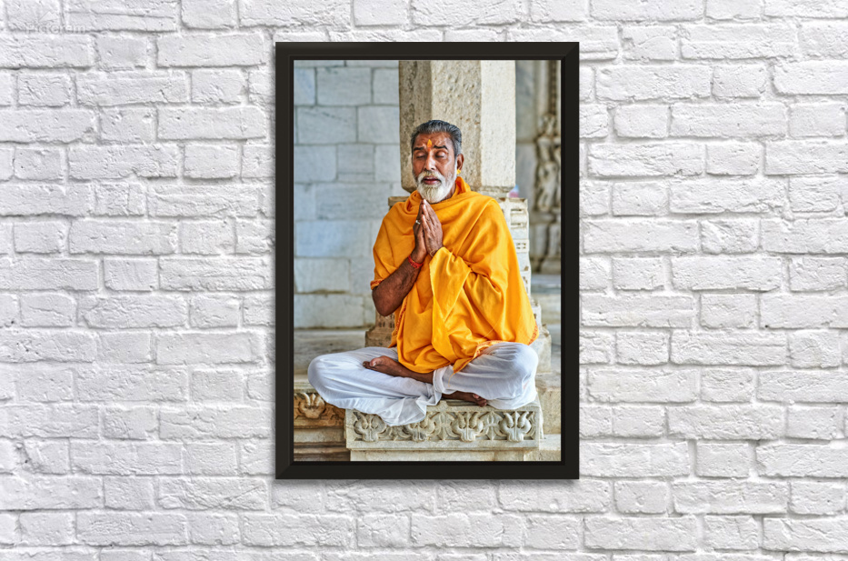 A man sits cross-legged and prays inside a Jain temple in Ranakpur Rajasthan. He wears a yellow shawl and shows deep focus in his posture.