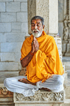 A man sits cross-legged and prays inside a Jain temple in Ranakpur Rajasthan. He wears a yellow shawl and shows deep focus in his posture.