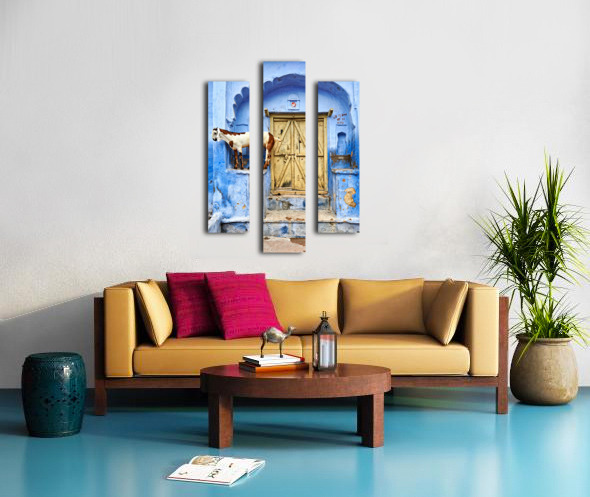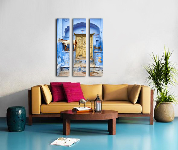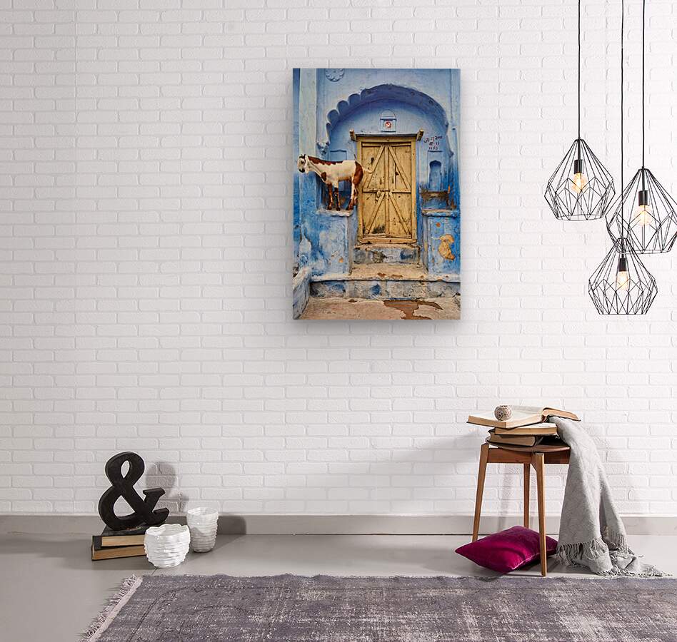 Get this artwork "Goat standing on a wall by a wooden door in Bundi Rajasthan" in a framed print.