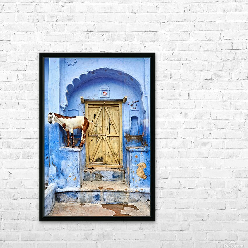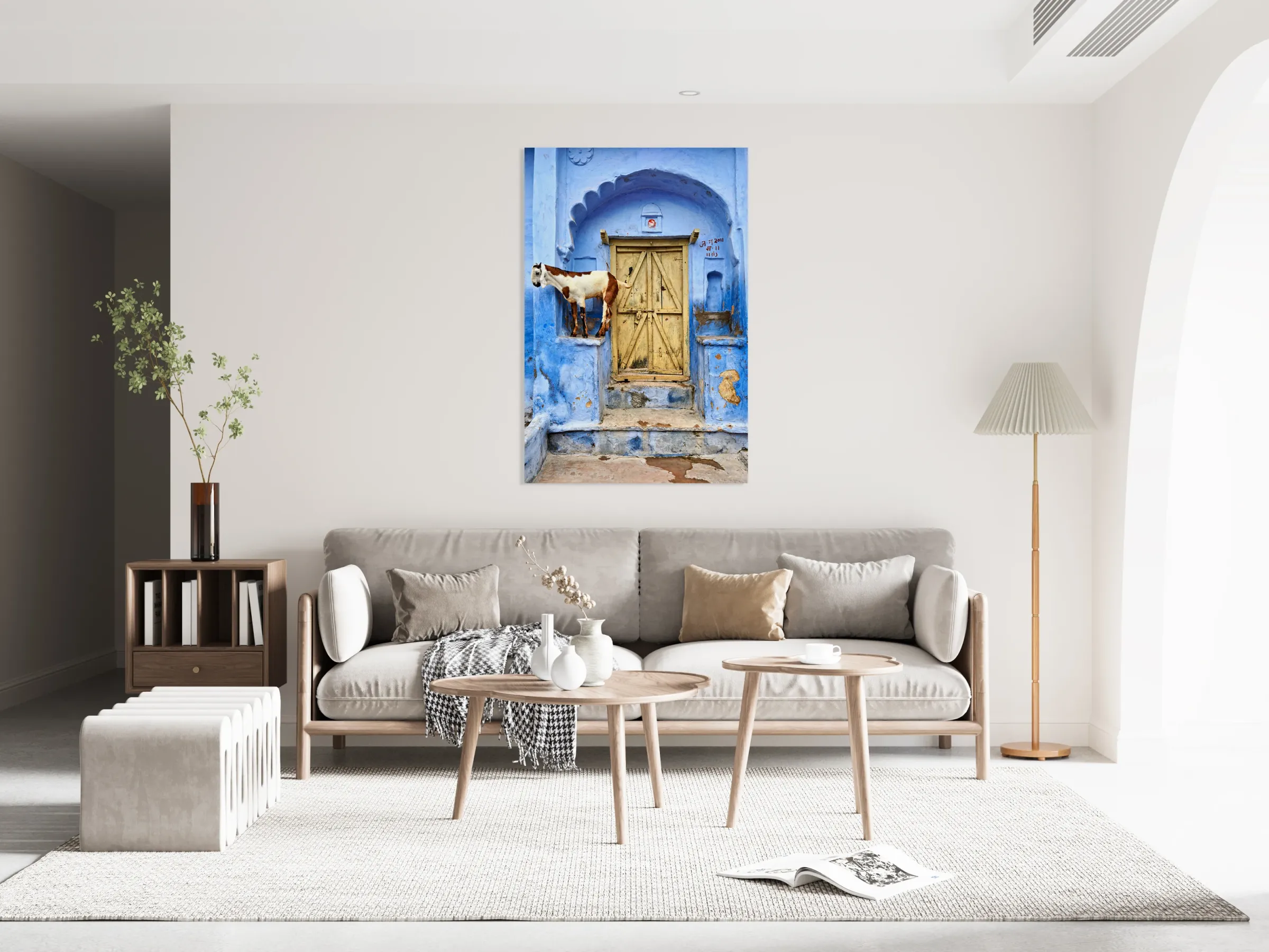 Goat standing on a wall by a wooden door in Bundi Rajasthan Picture Frame Printing