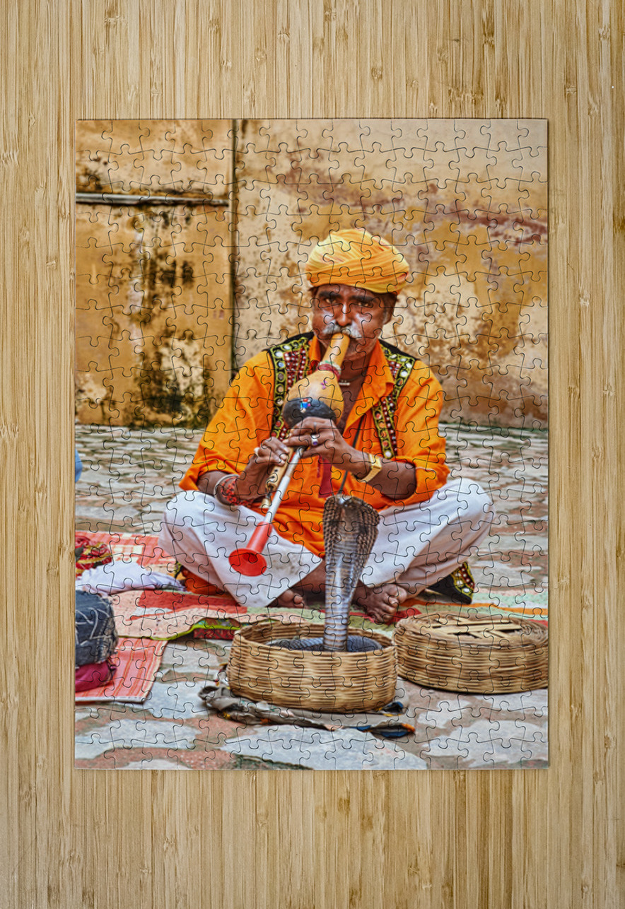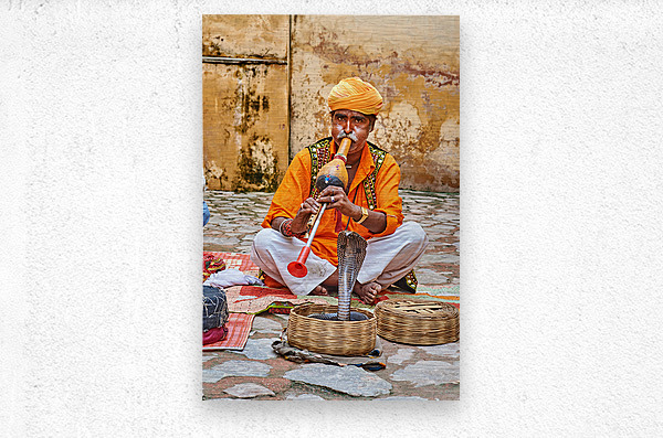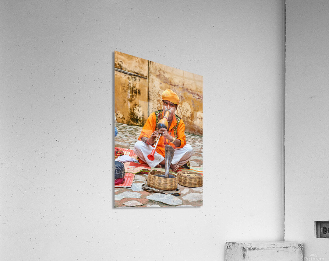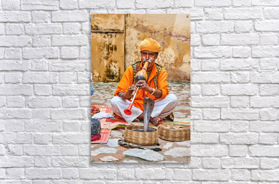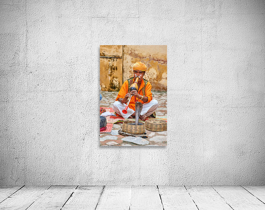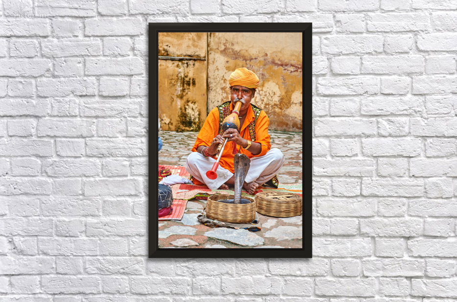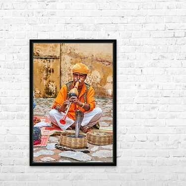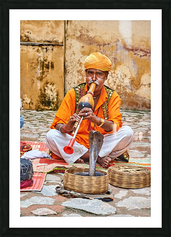 "Snake charmer performs in Amber Rajasthan India" in a framed print.