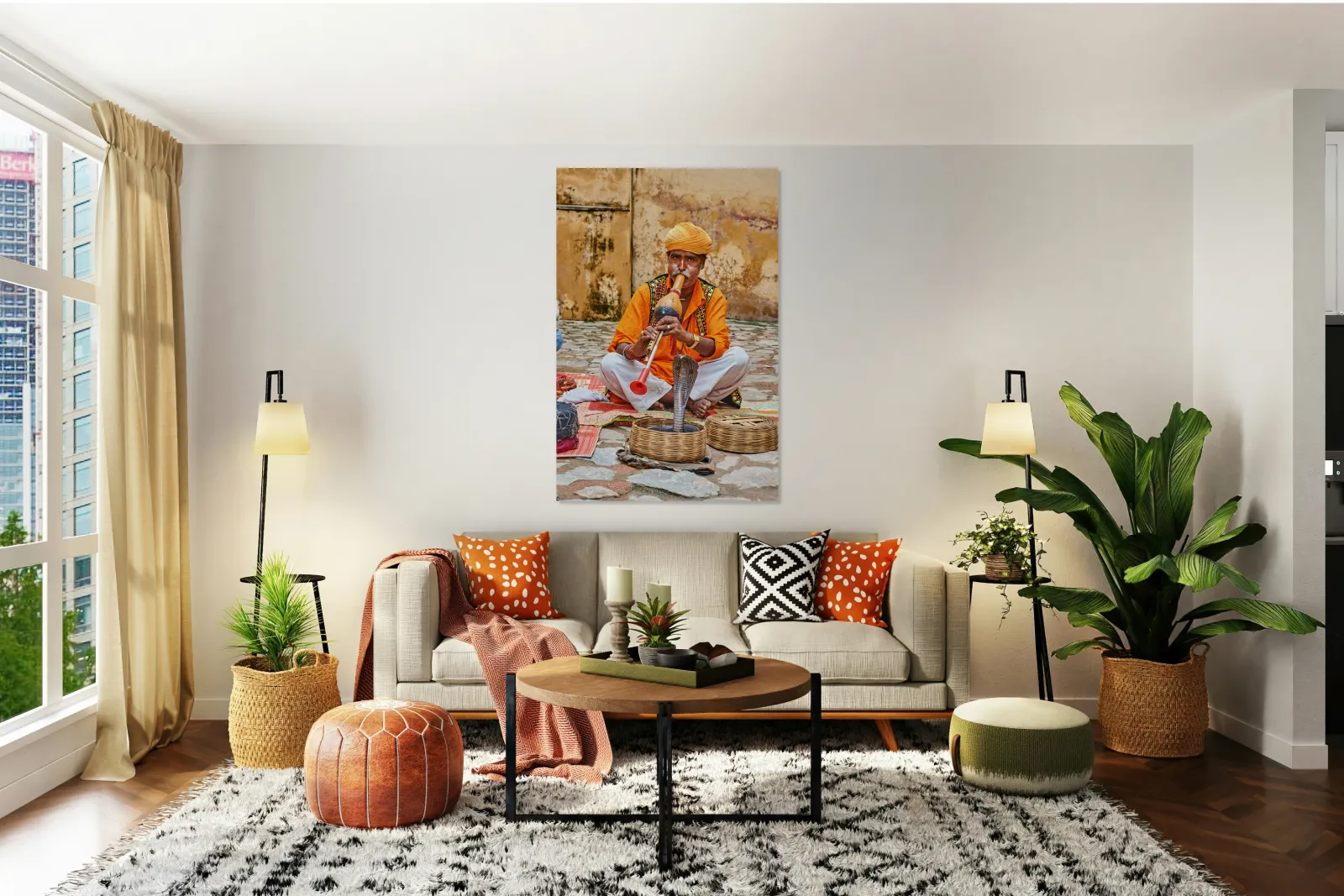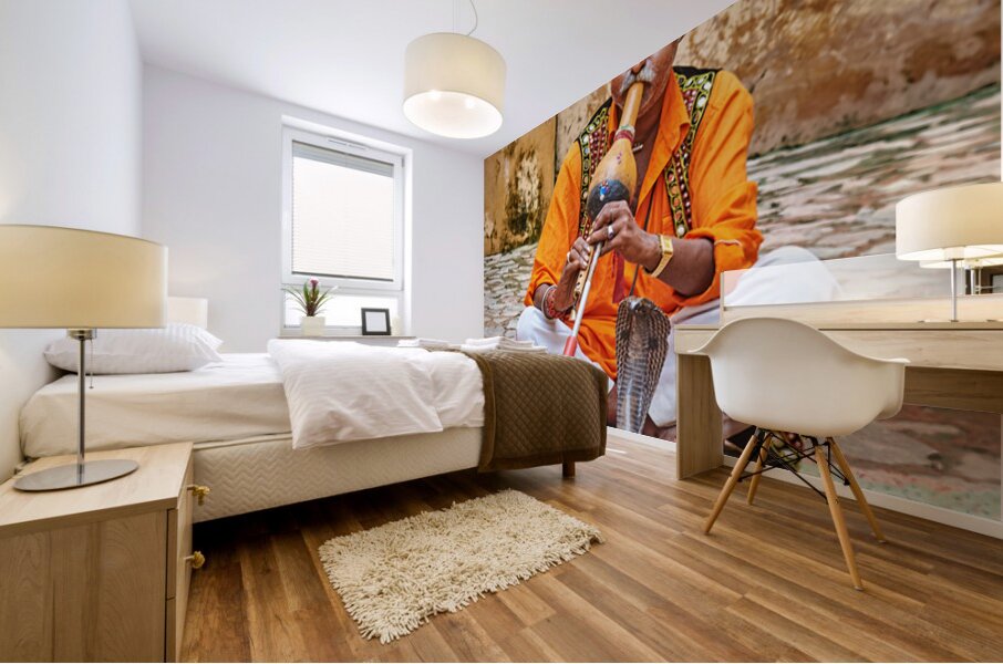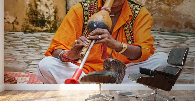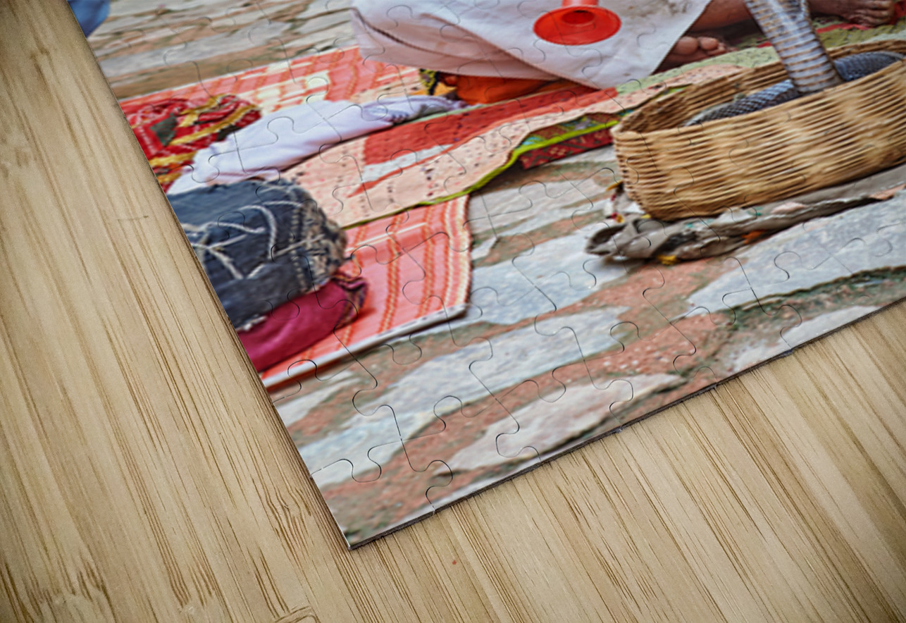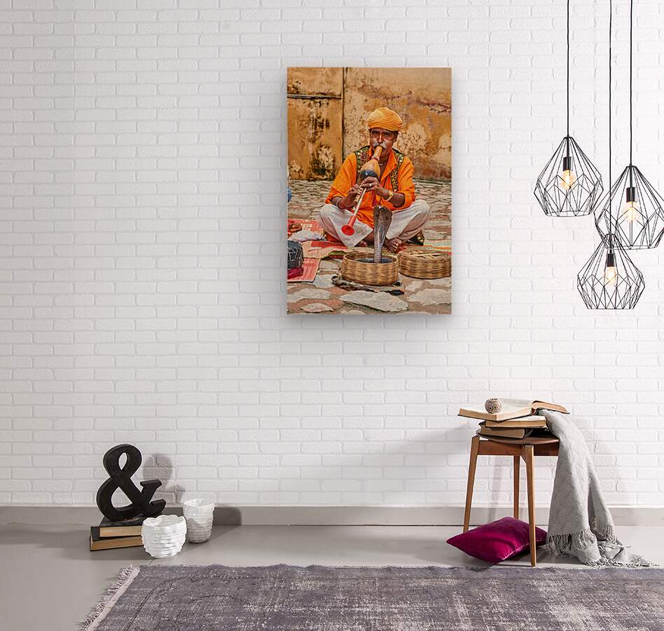 "Snake charmer performs in Amber Rajasthan India" in a framed print.
