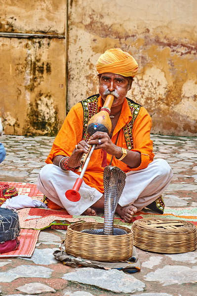 A snake charmer plays a flute while sitting on the ground in Amber Rajasthan. The cobra raises its head from a basket nearby.