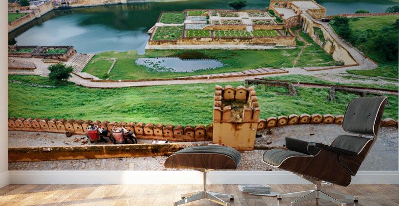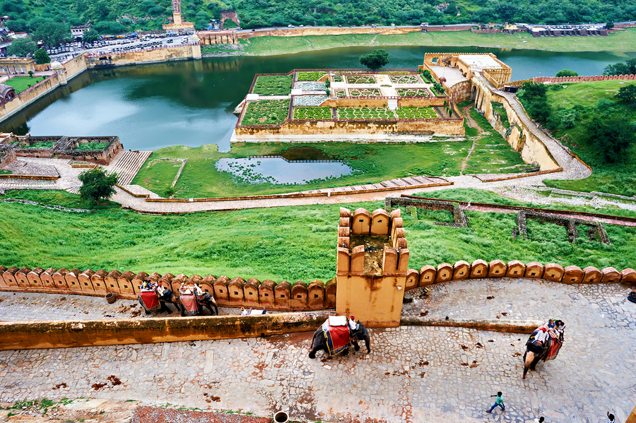 Visitors ride elephants along the pathway of Amber Palace overlooking the gardens and water. The landscape includes hills and greenery.