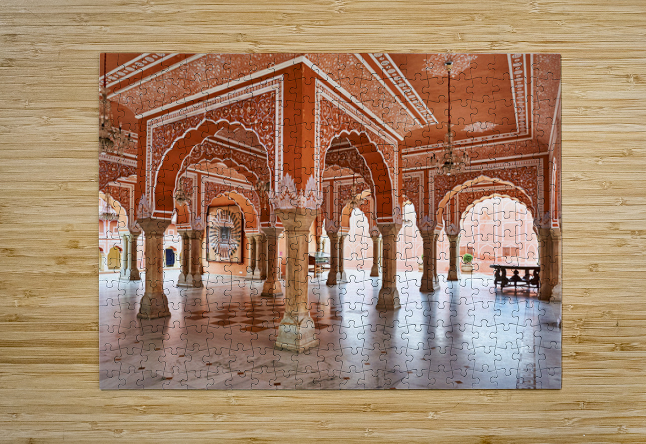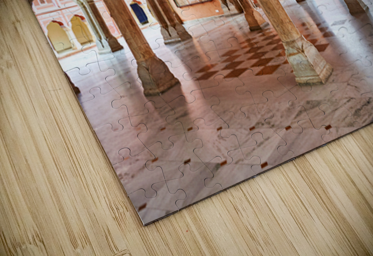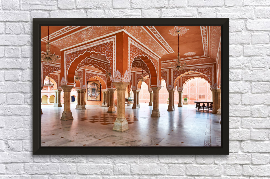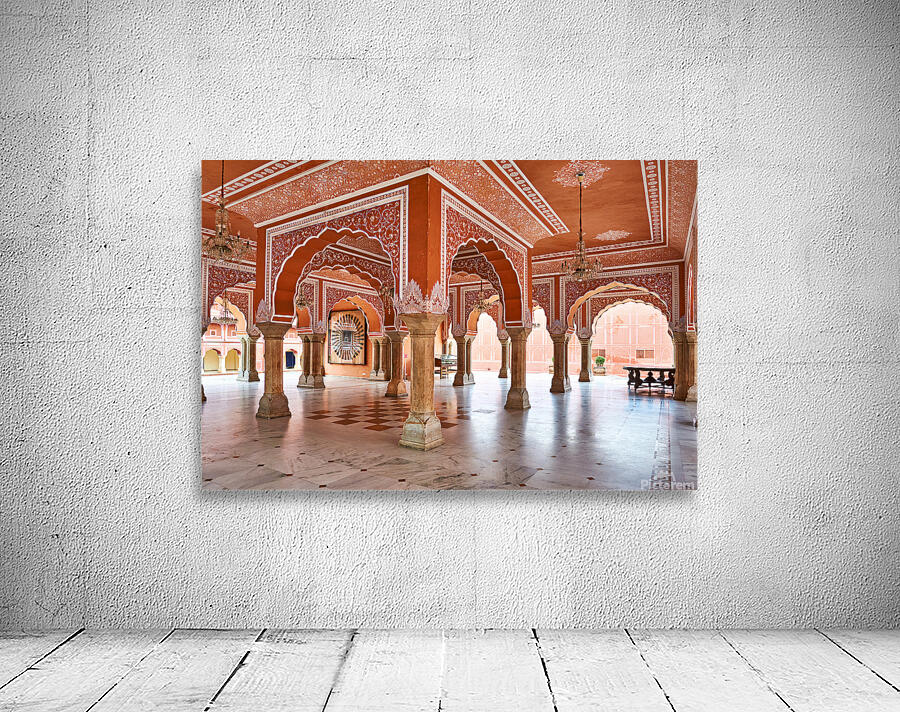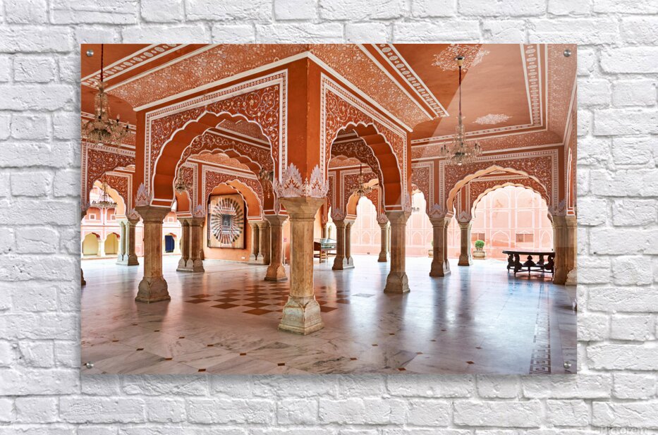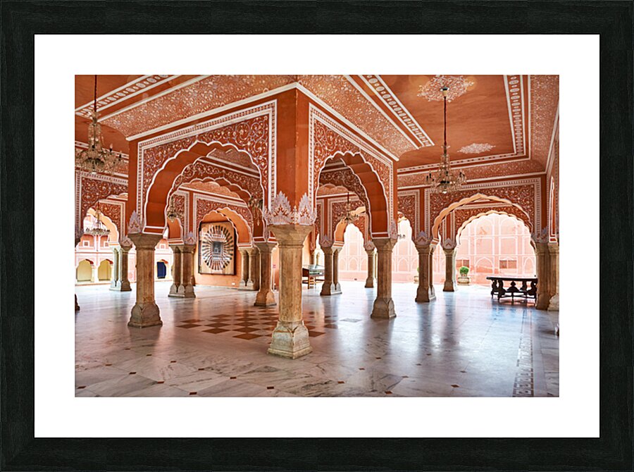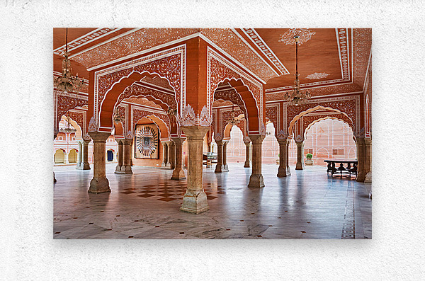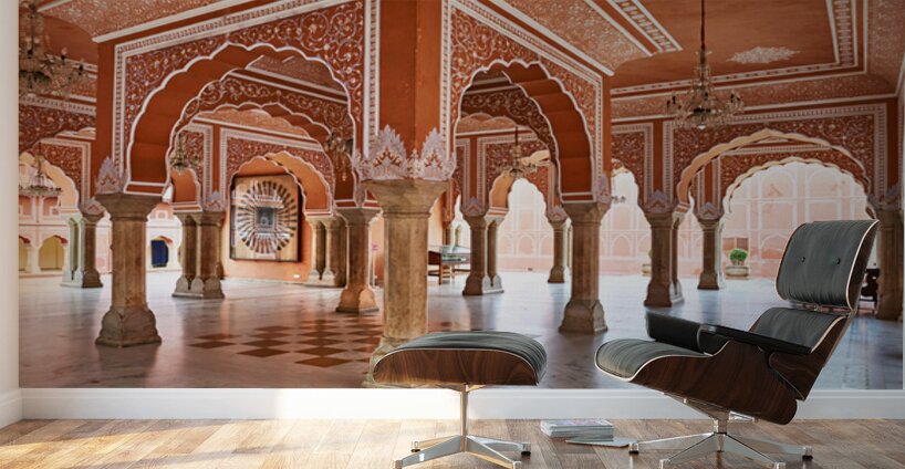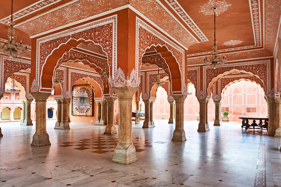 Inside the City Palace in Jaipur Rajasthan visitors see intricate designs and pillars. The spacious area reflects the history of the palace.