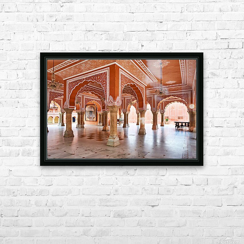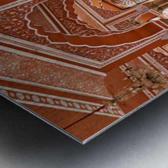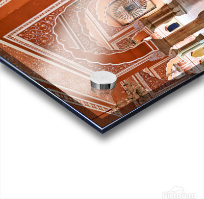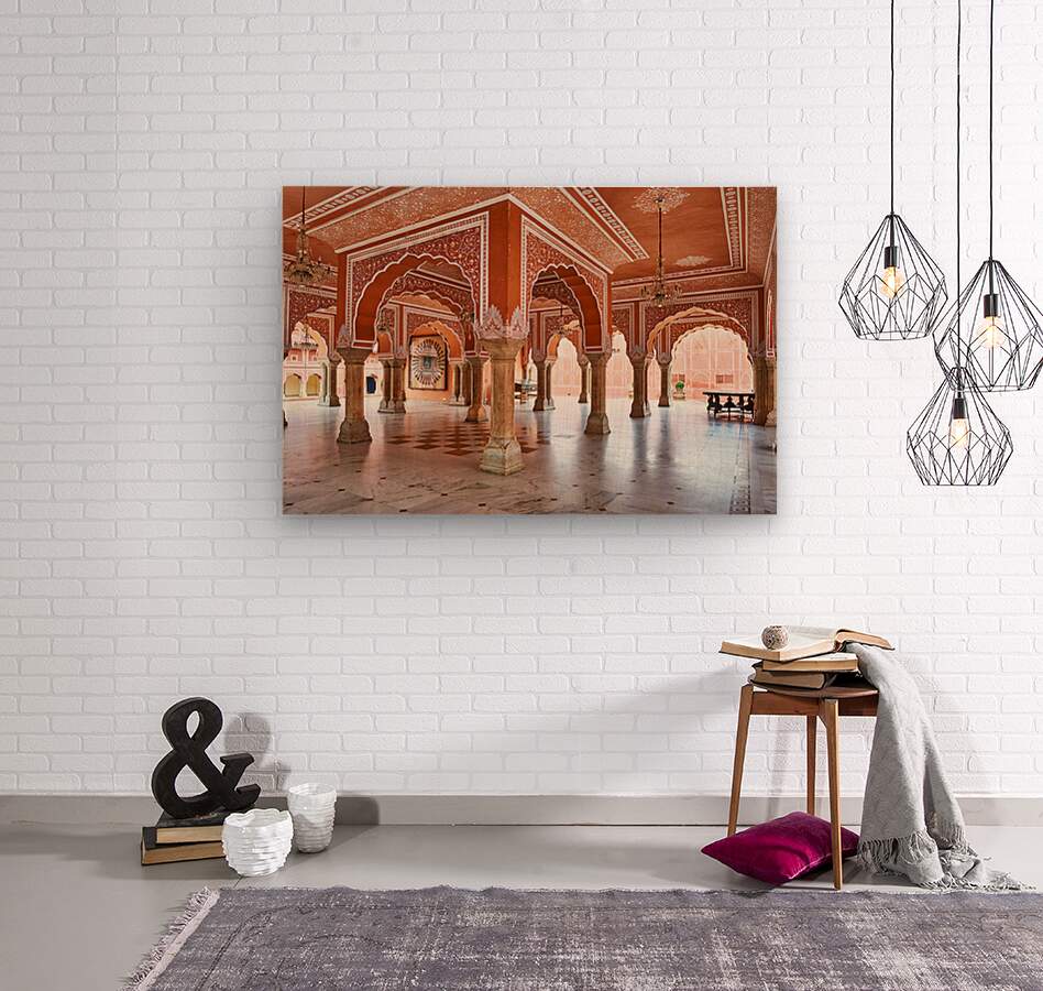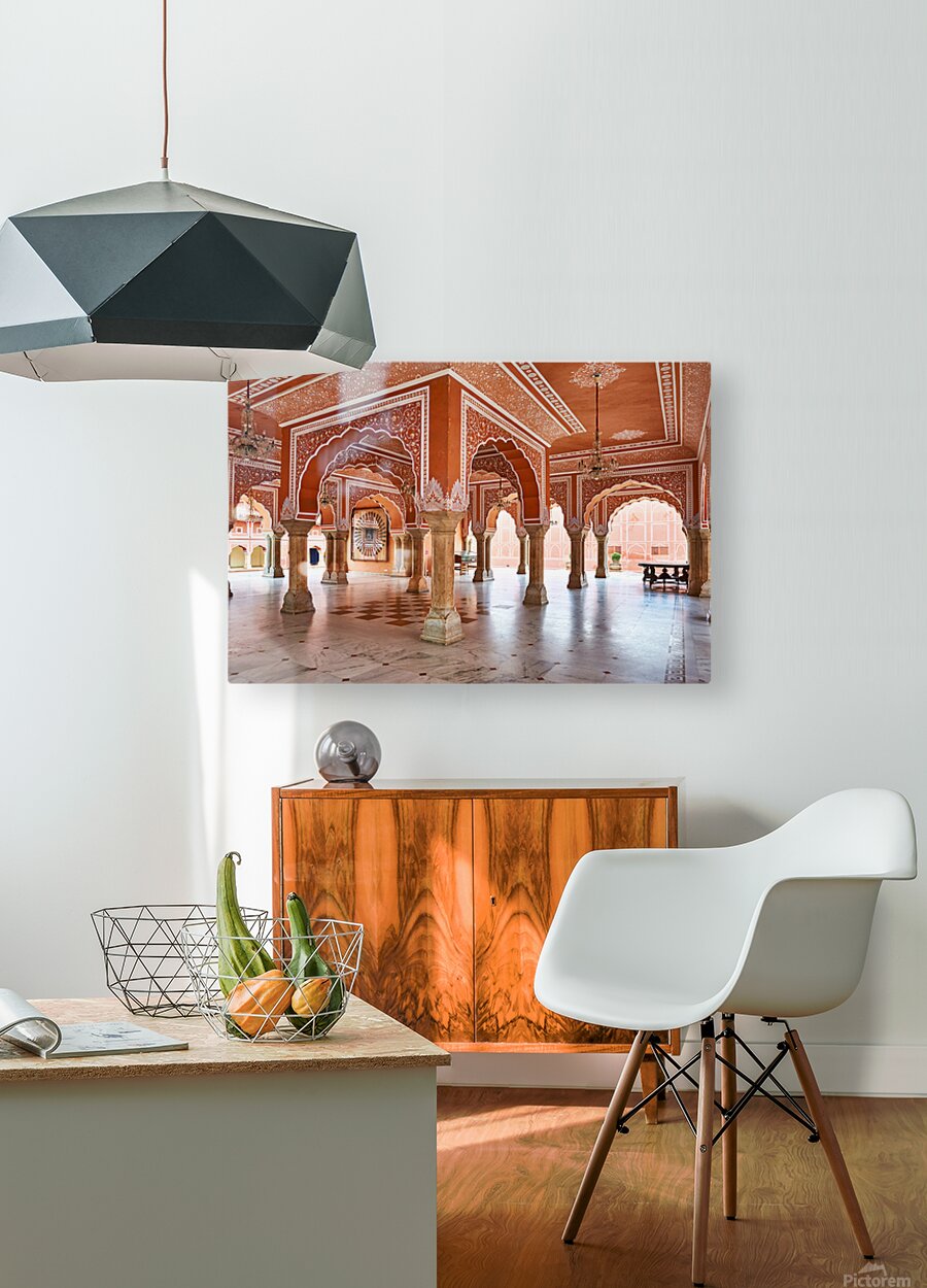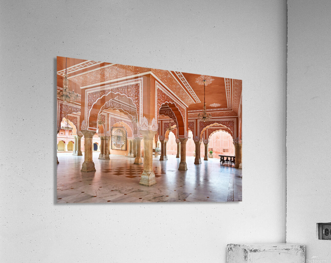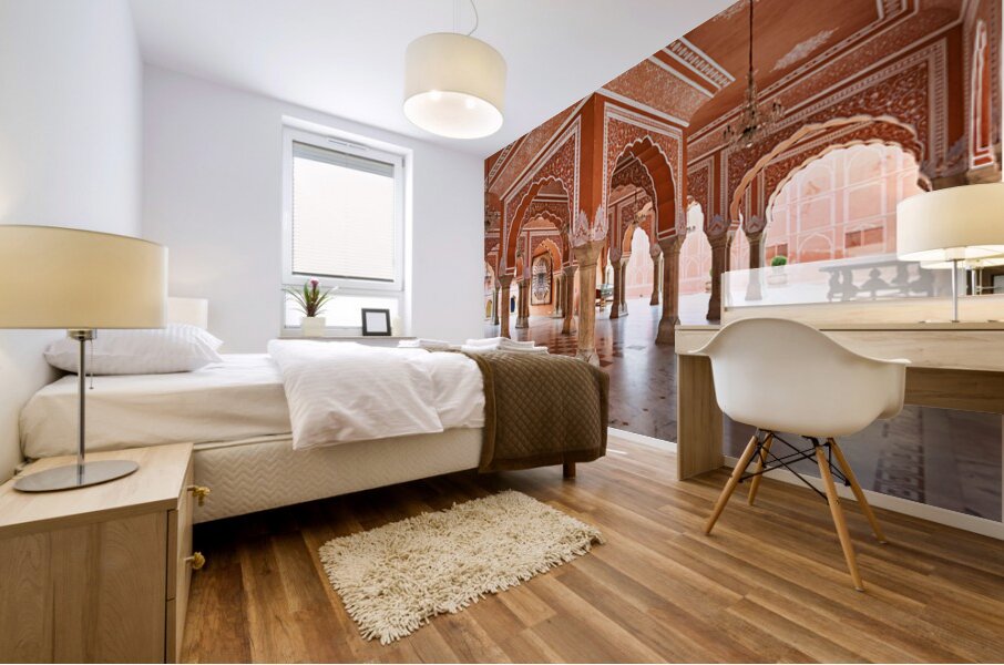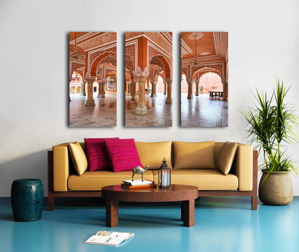 Inside the City Palace in Jaipur Rajasthan visitors see intricate designs and pillars. The spacious area reflects the history of the palace.