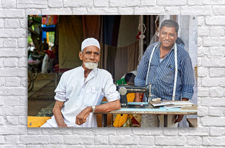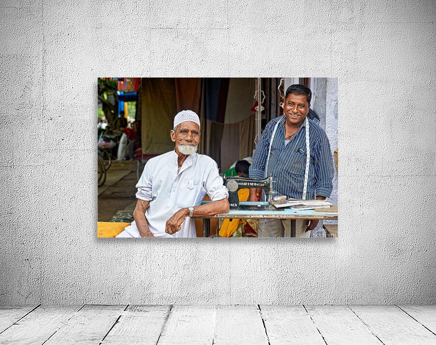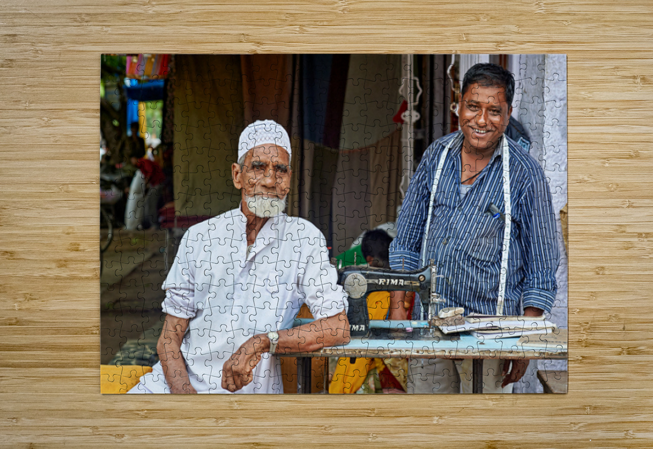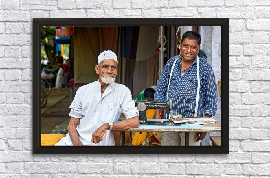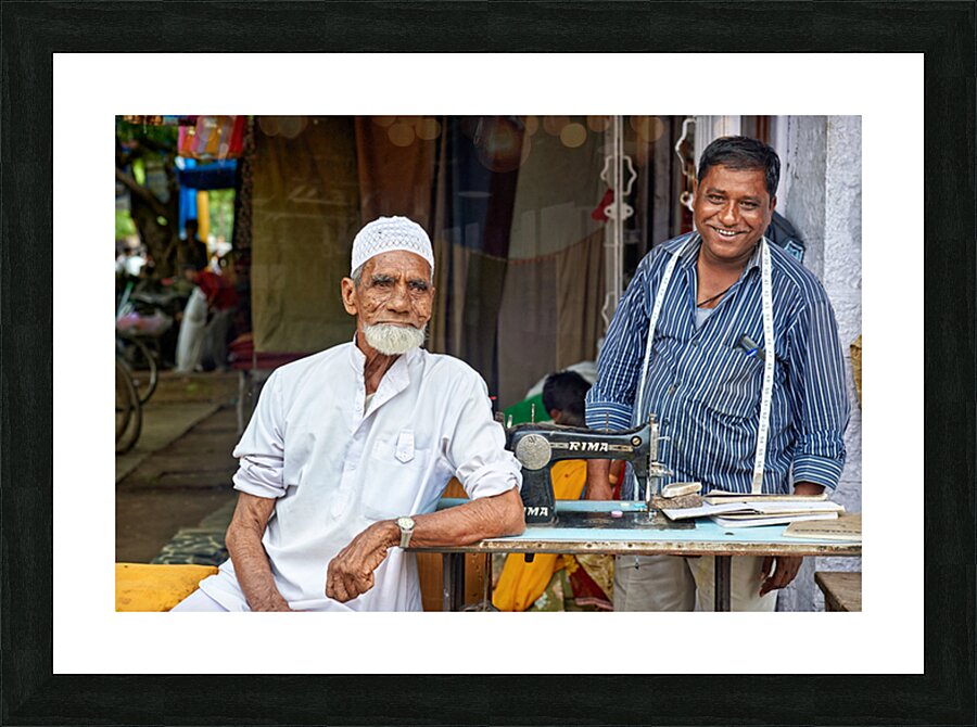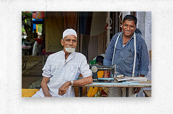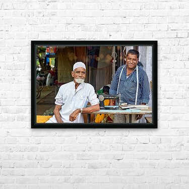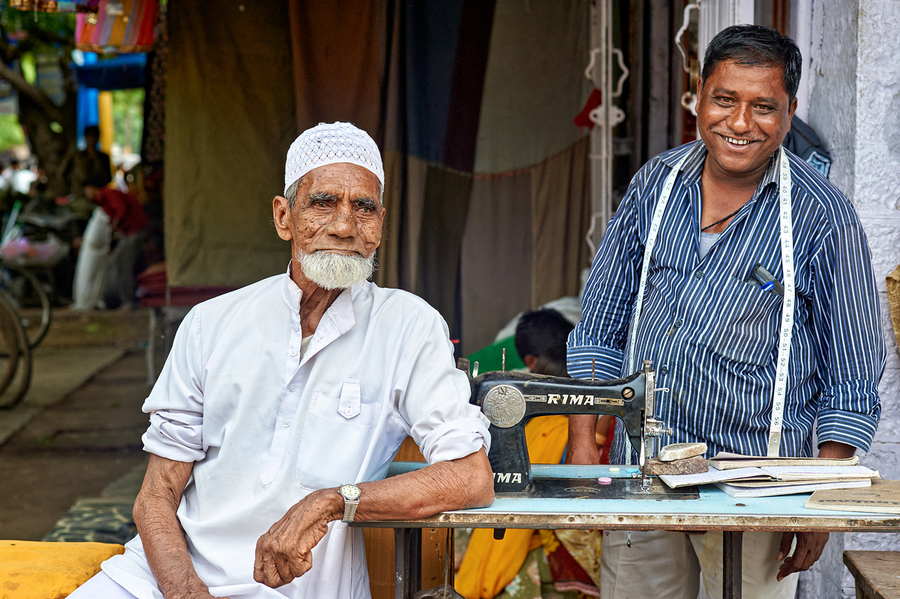 Two men sit outside a shop in Bundi Rajasthan. One man is sewing while the other smiles. They are focused on their work in the bustling market.