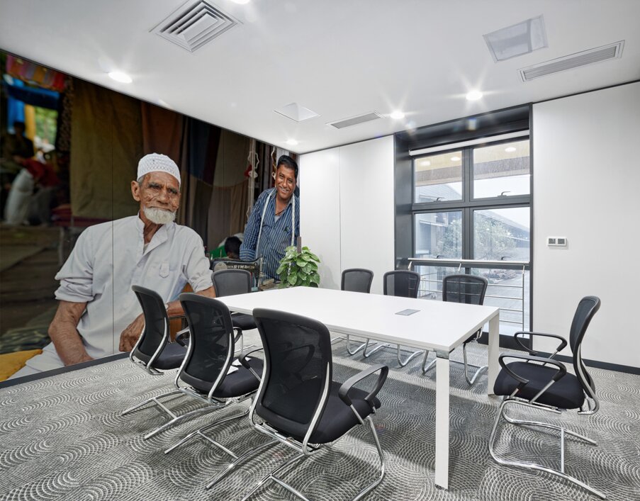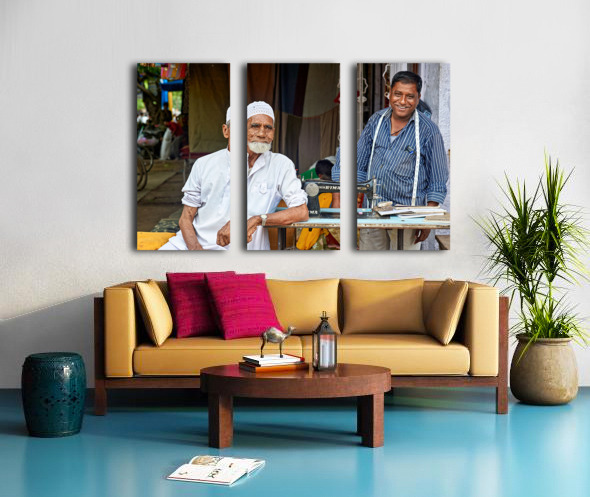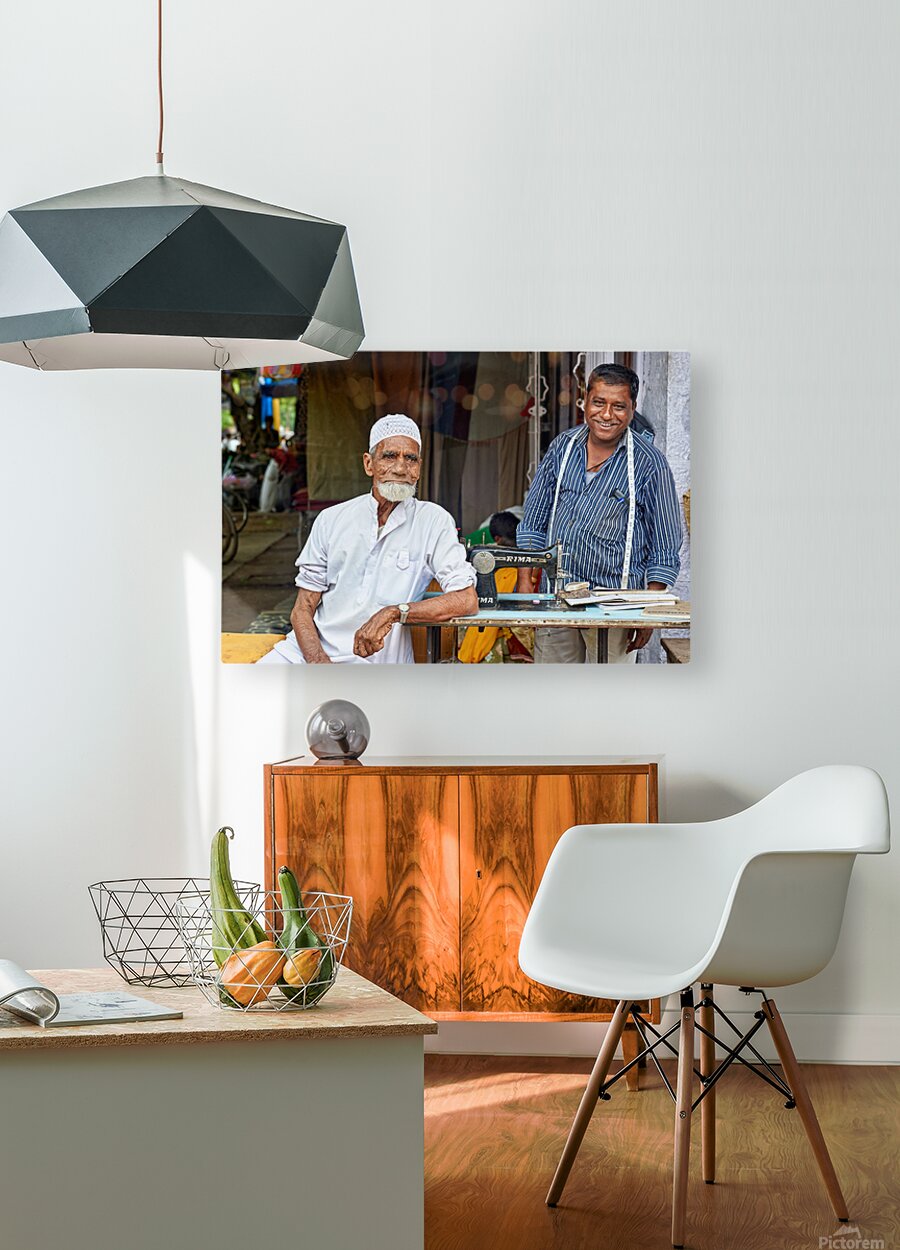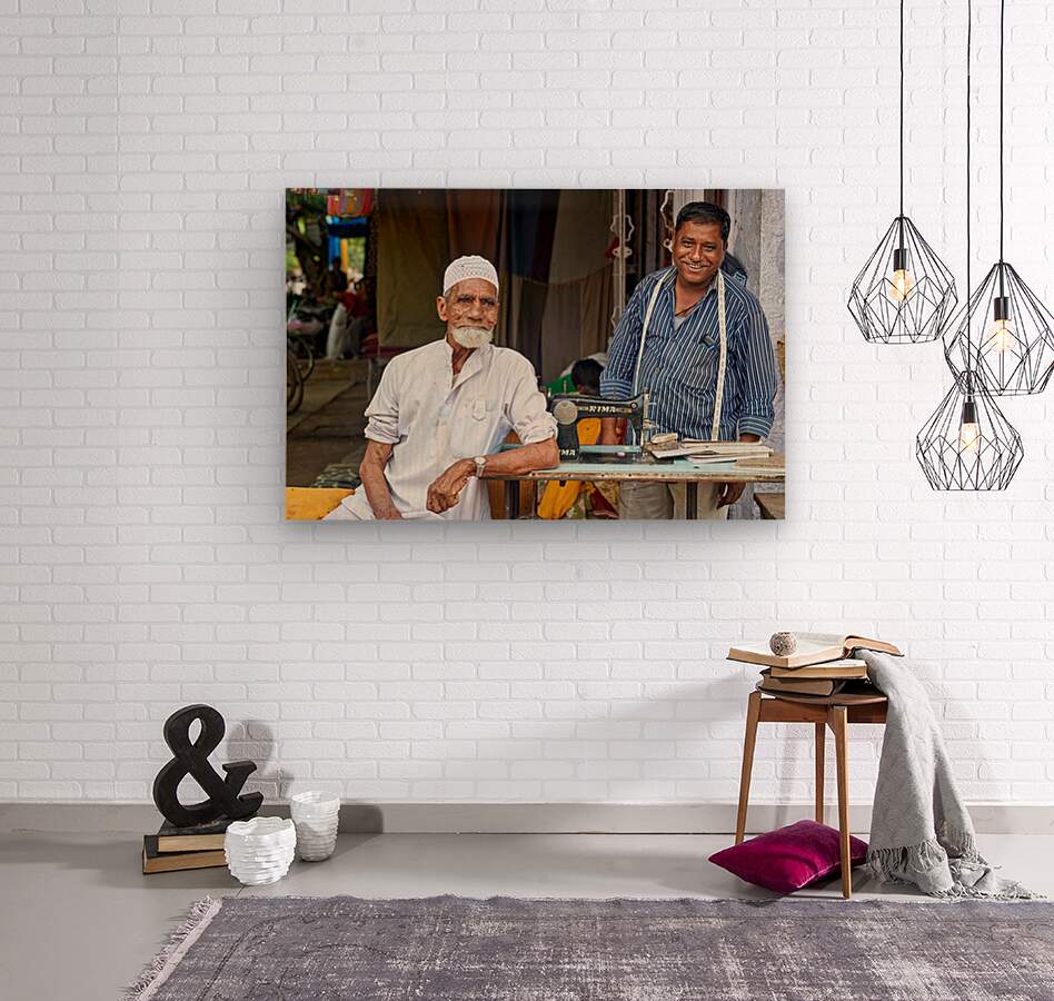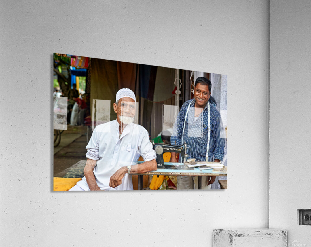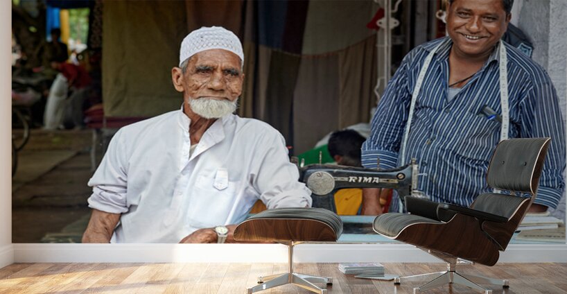 Two men sit outside a shop in Bundi Rajasthan. One man is sewing while the other smiles. They are focused on their work in the bustling market.